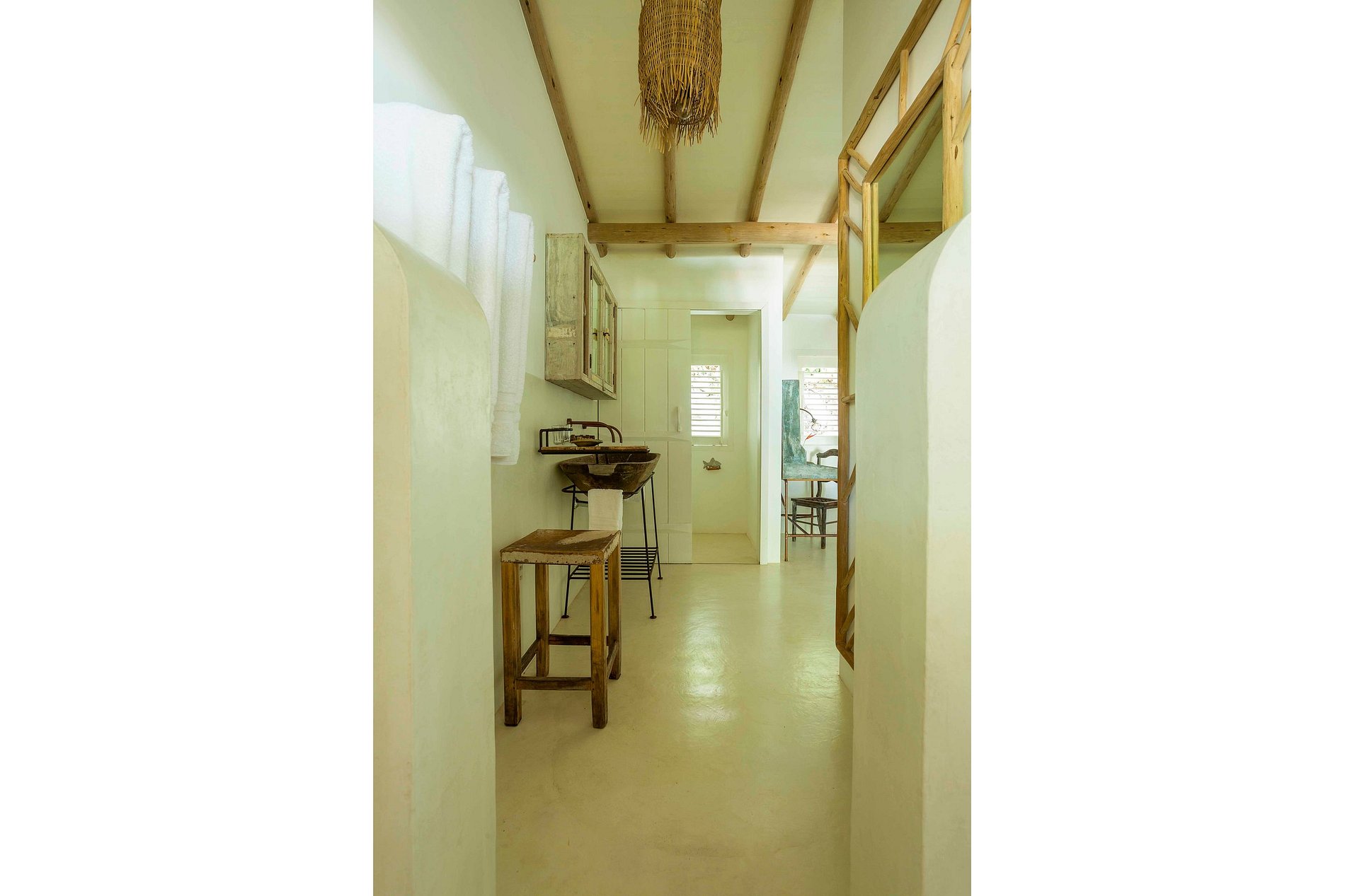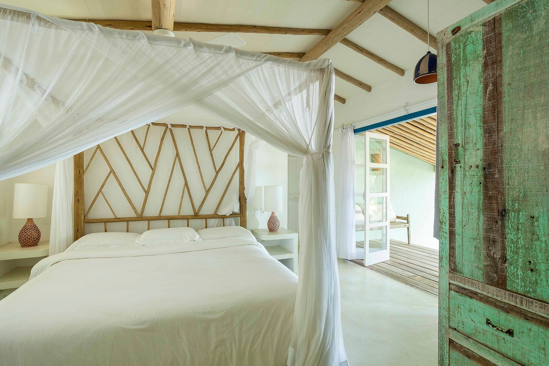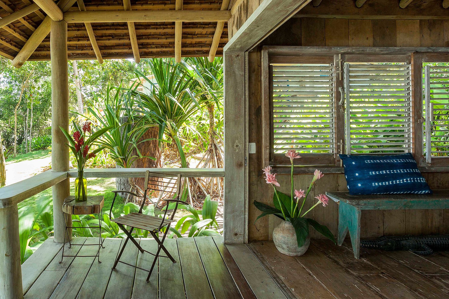 An idyllic retreat of four suites surrounded by tropical flowers and wild vegetation at the foot of cliffs on which his 100-hectare farm sits. A few steps from the sea, the impressive oil blue house seems to be a reflection of the waters, rising on a rustic base of natural wood with a beautiful balcony at the entrance and roof crossed by a giant almond tree.