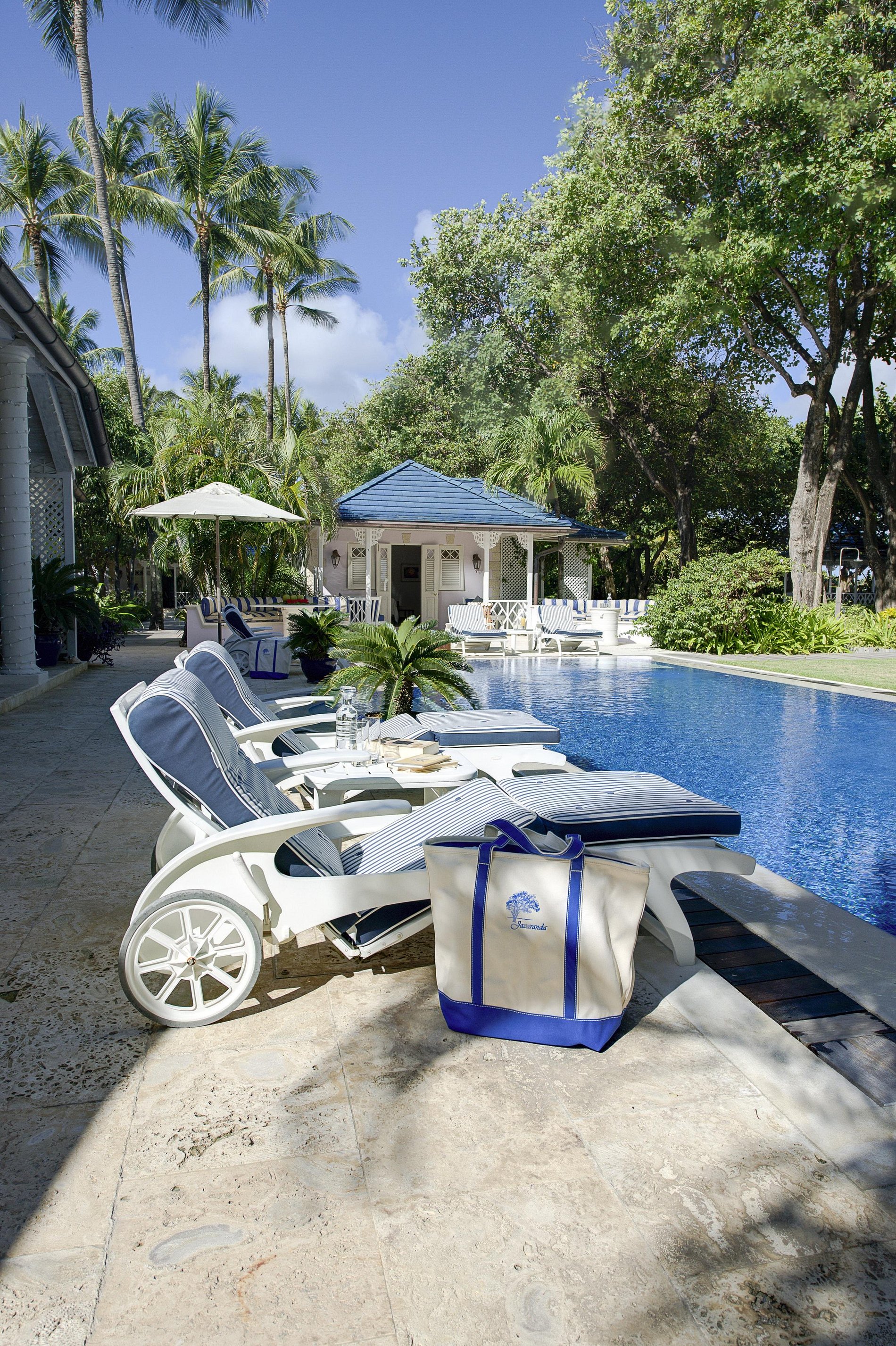 The Main House boasts a central living room with on one side a view of the stunning courtyard water feature and on the other side the pool area and a 450 ft expanse of white sand beaches and the Atlantic Ocean. A generous dining room for 12 guests and an outdoor gazebo seats 9 guests.