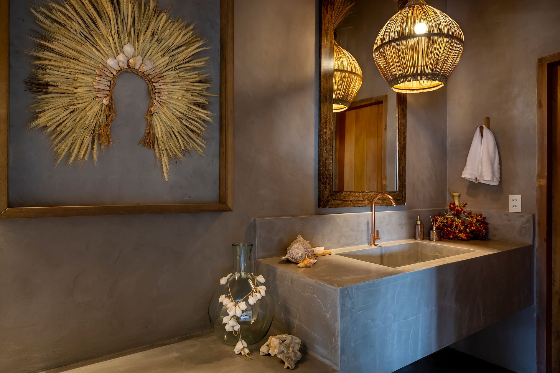 Seu projeto arquitetônico é a cara de Trancoso, desde os materiais de revestimento aos móveis e adornos de decoração, além de um paisagismo 100% tropical. A área total do terreno é de 2.793m2, sendo 1.237m2 de implantação e 1.556m2 de paisagismo.