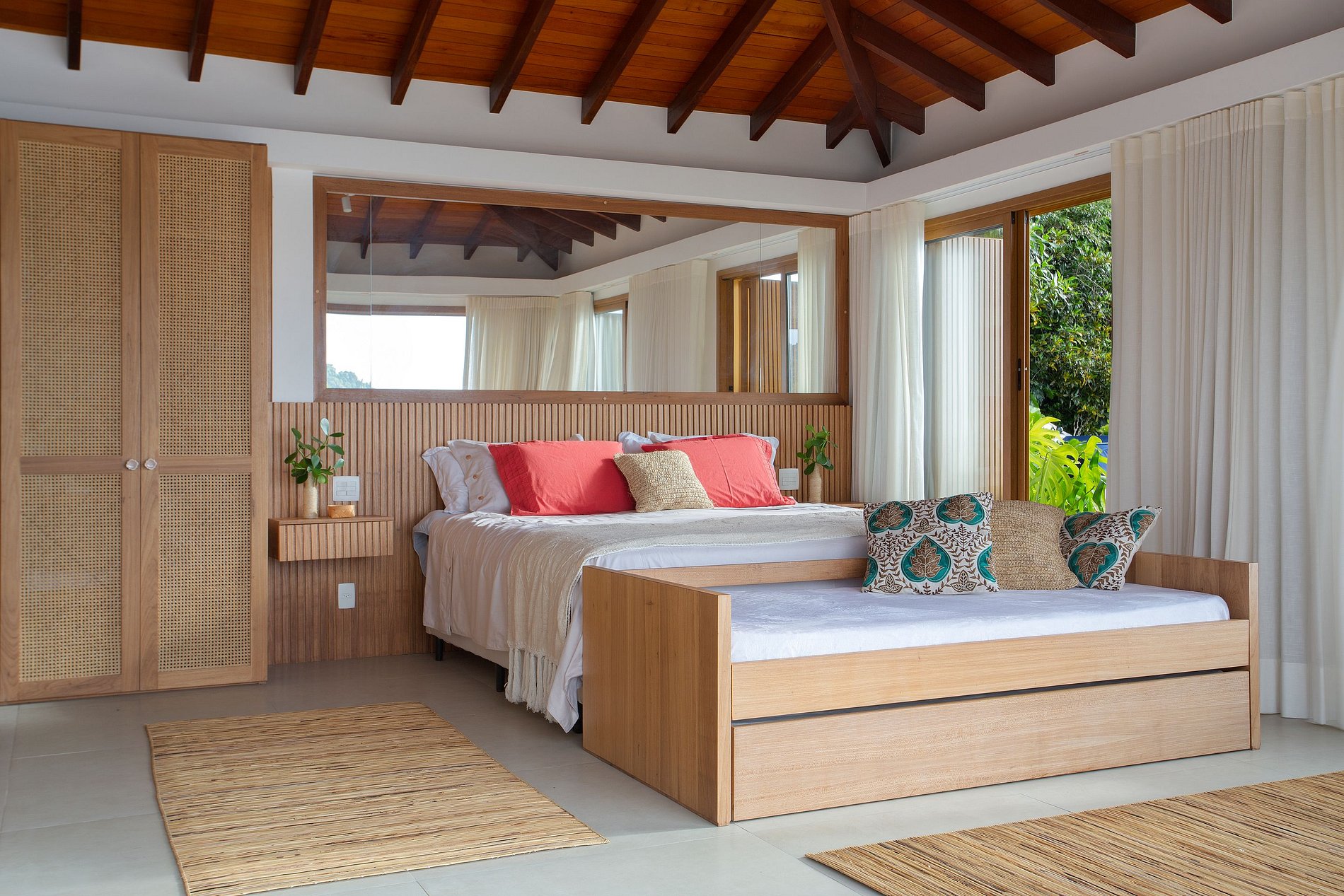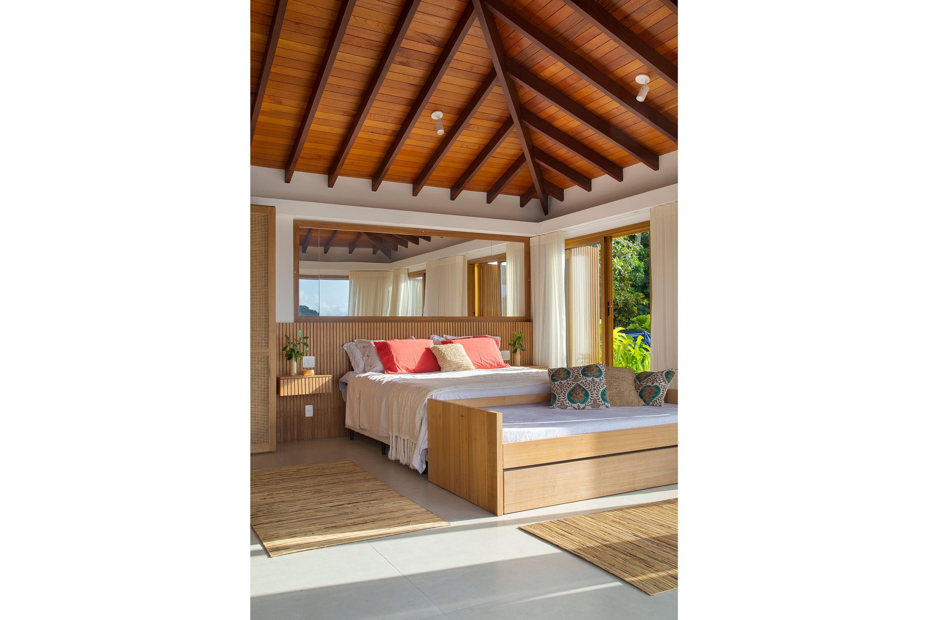 It also has excellent leisure facilities: a small beach, heated infinity pool, sauna, tree house for children, movie theater with 120-inch screen, sound system, gourmet area complete with barbecue, wood oven and ice machine. It also has a beach tennis court, futmesa, kayaks, SUPs and buoys for skiing.
