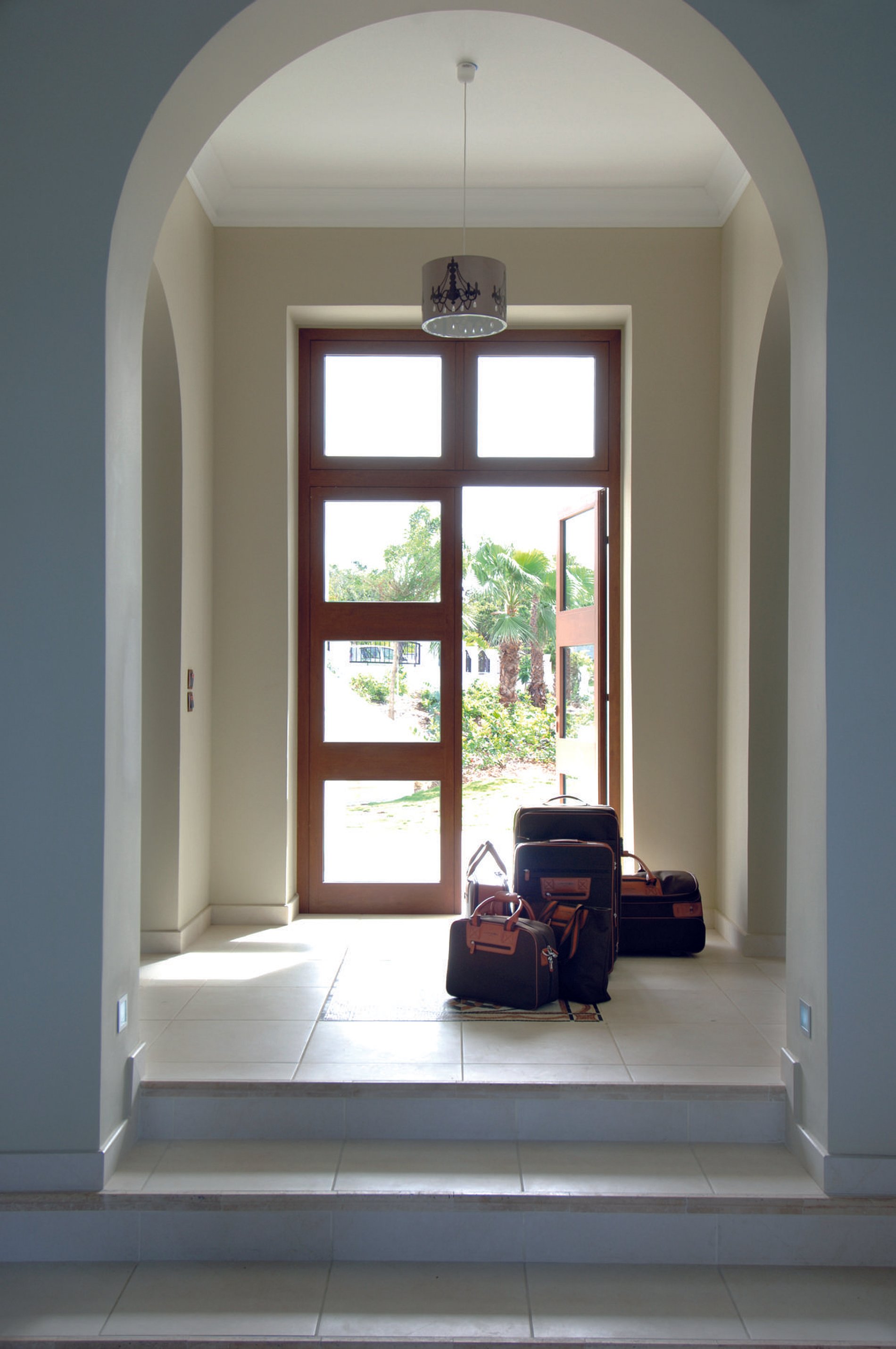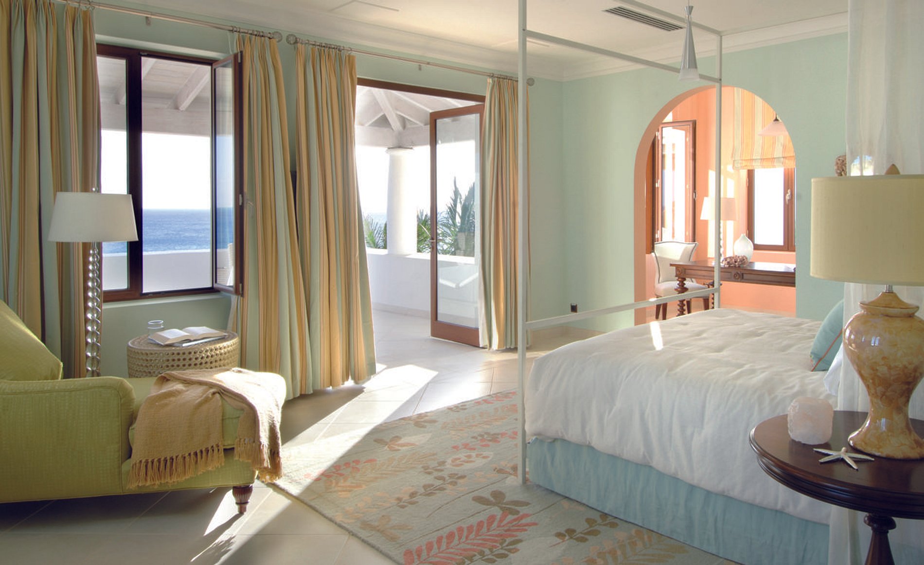 Architectural details include floor-to-ceiling windows, graceful archways, teak accents and Italian marble flooring.