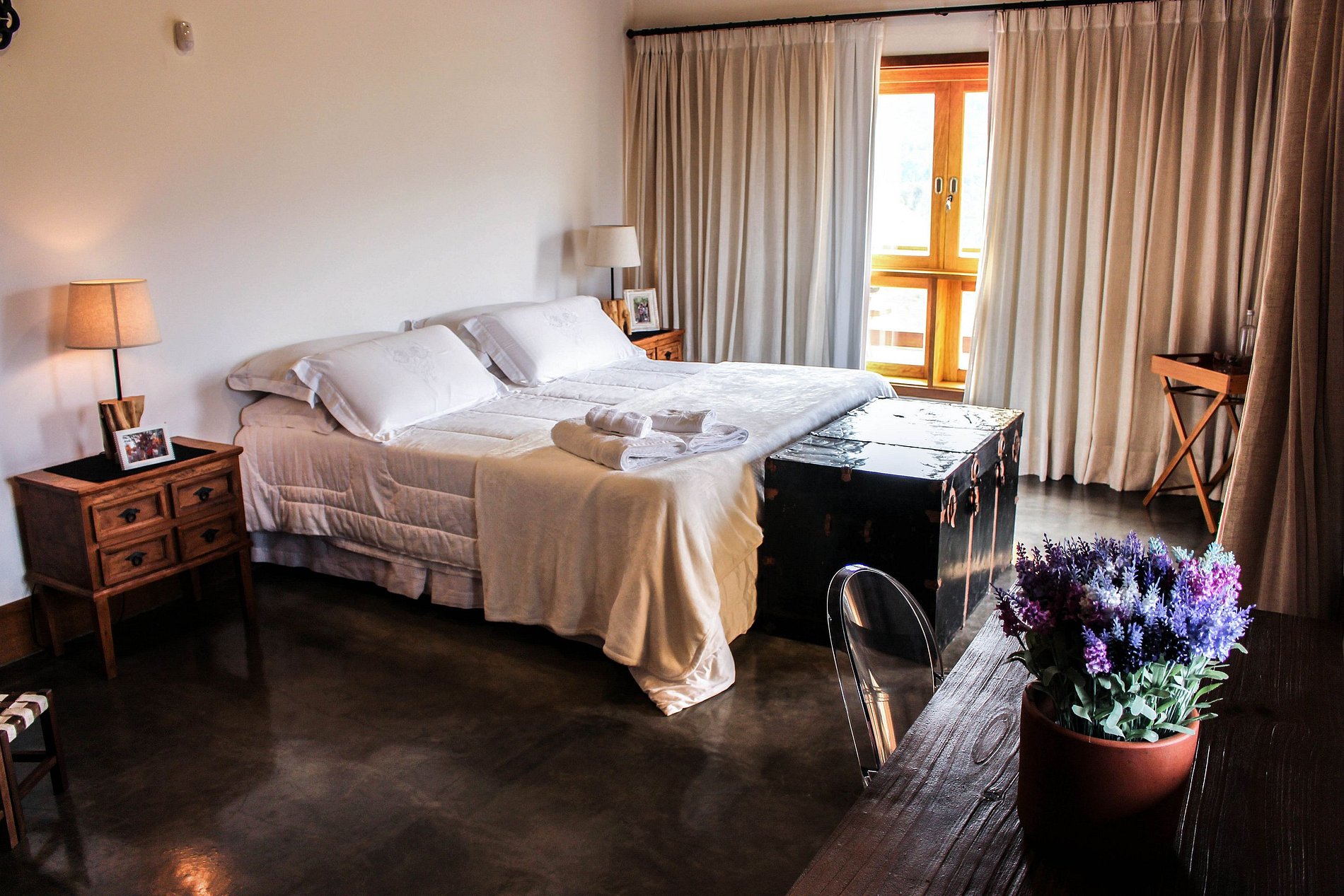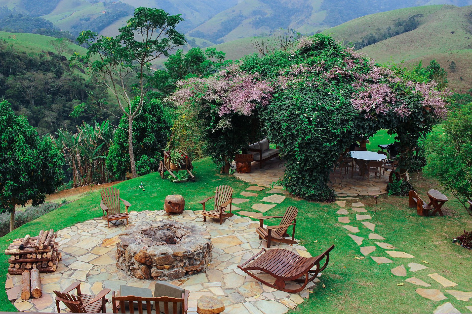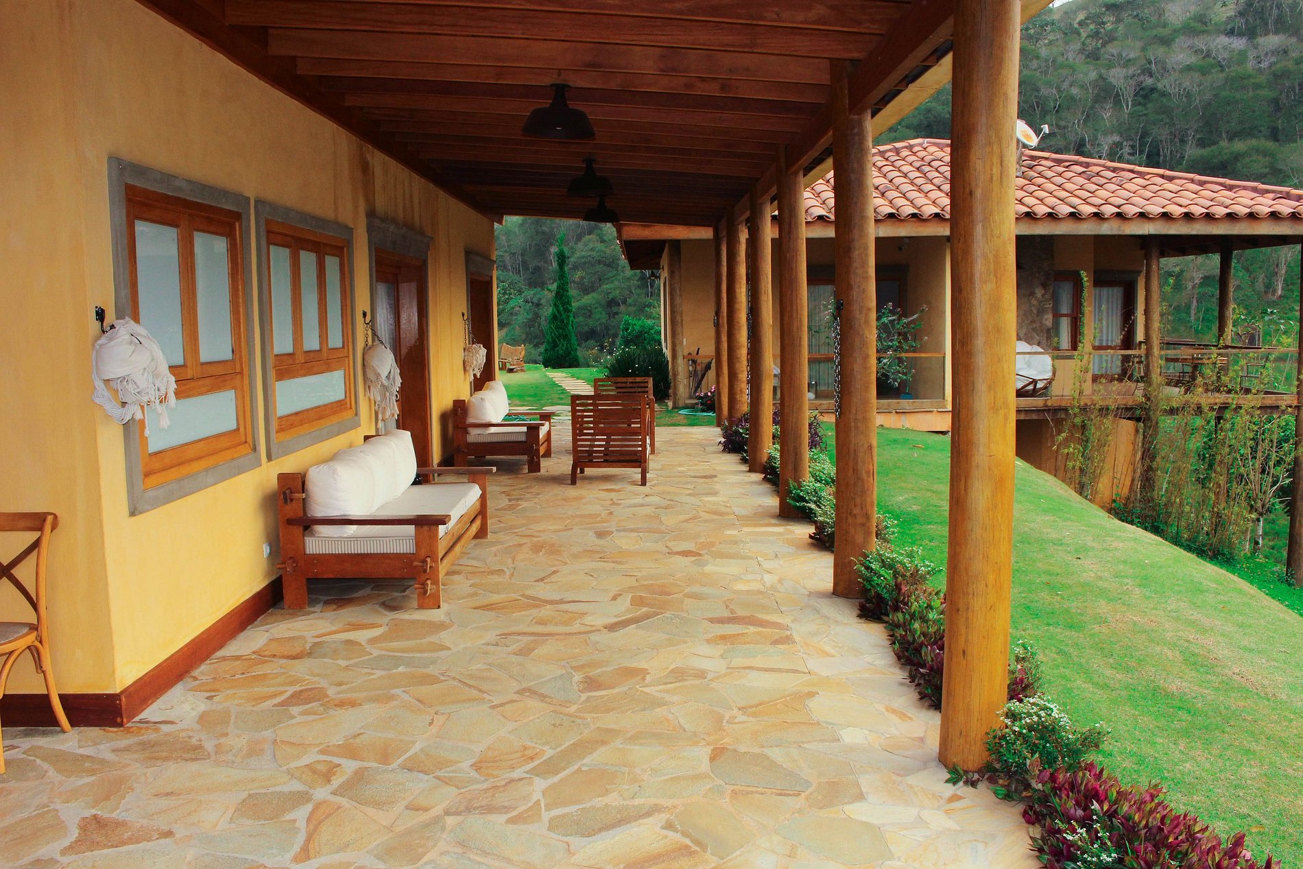 It comfortably accommodates 16 people and also has security cameras in the outdoor area, infinity pool with 20m lane, fire pit, gourmet bungalow with stunning views and equipped with dining table, sofas, Parrilla-style barbecue and fondue pot; children's playground with swing, bridge and slide, jumping, area on the river for picnic with table, permaculture, agroforestry and organic garden, ample parking, Wi-Fi, Sky cable TV, gas heater and air conditioning and/or heating.