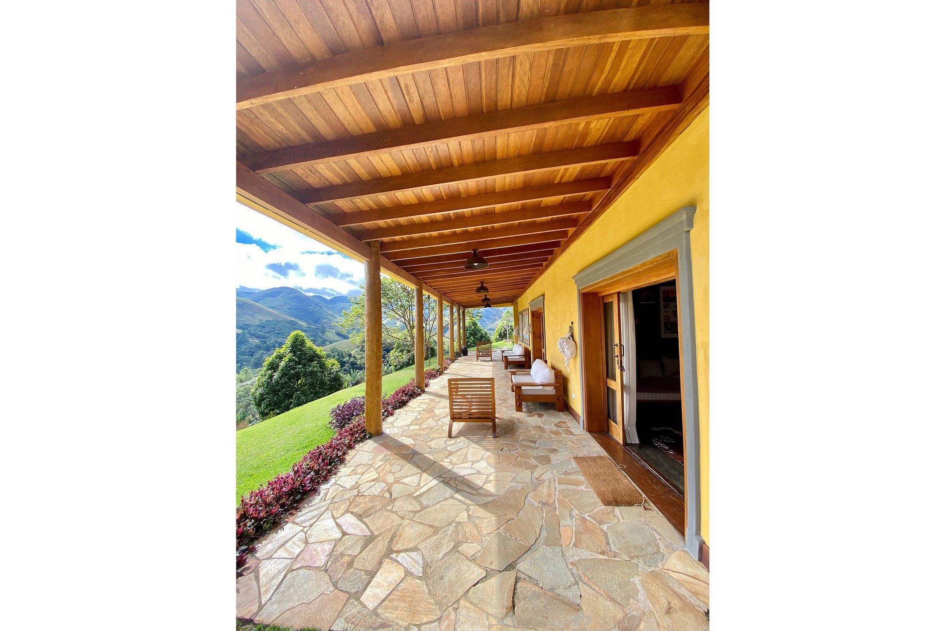 It comfortably accommodates 16 people and also has security cameras in the outdoor area, infinity pool with 20m lane, fire pit, gourmet bungalow with stunning views and equipped with dining table, sofas, Parrilla-style barbecue and fondue pot; children's playground with swing, bridge and slide, jumping, area on the river for picnic with table, permaculture, agroforestry and organic garden, ample parking, Wi-Fi, Sky cable TV, gas heater and air conditioning and/or heating.
