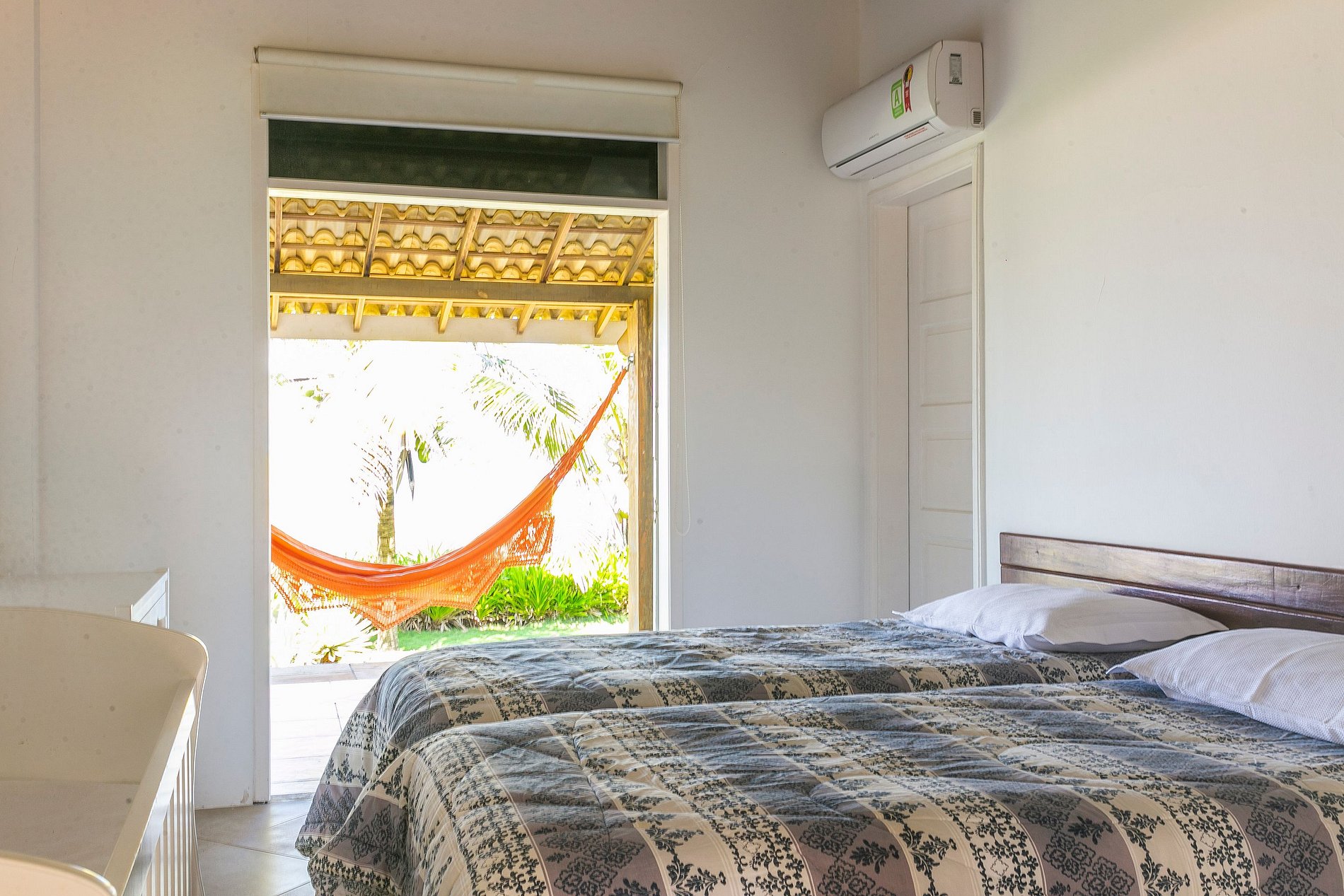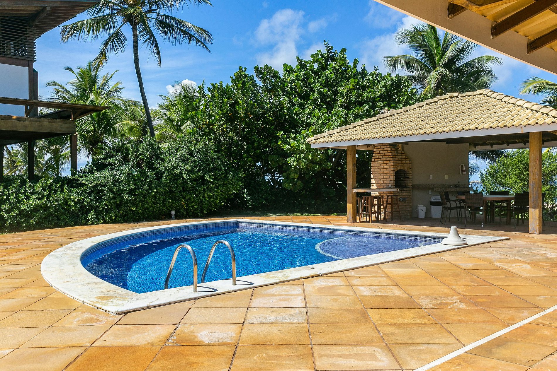 Foot in the sand, the outdoor area with pool, barbecue and balconies with hammocks.