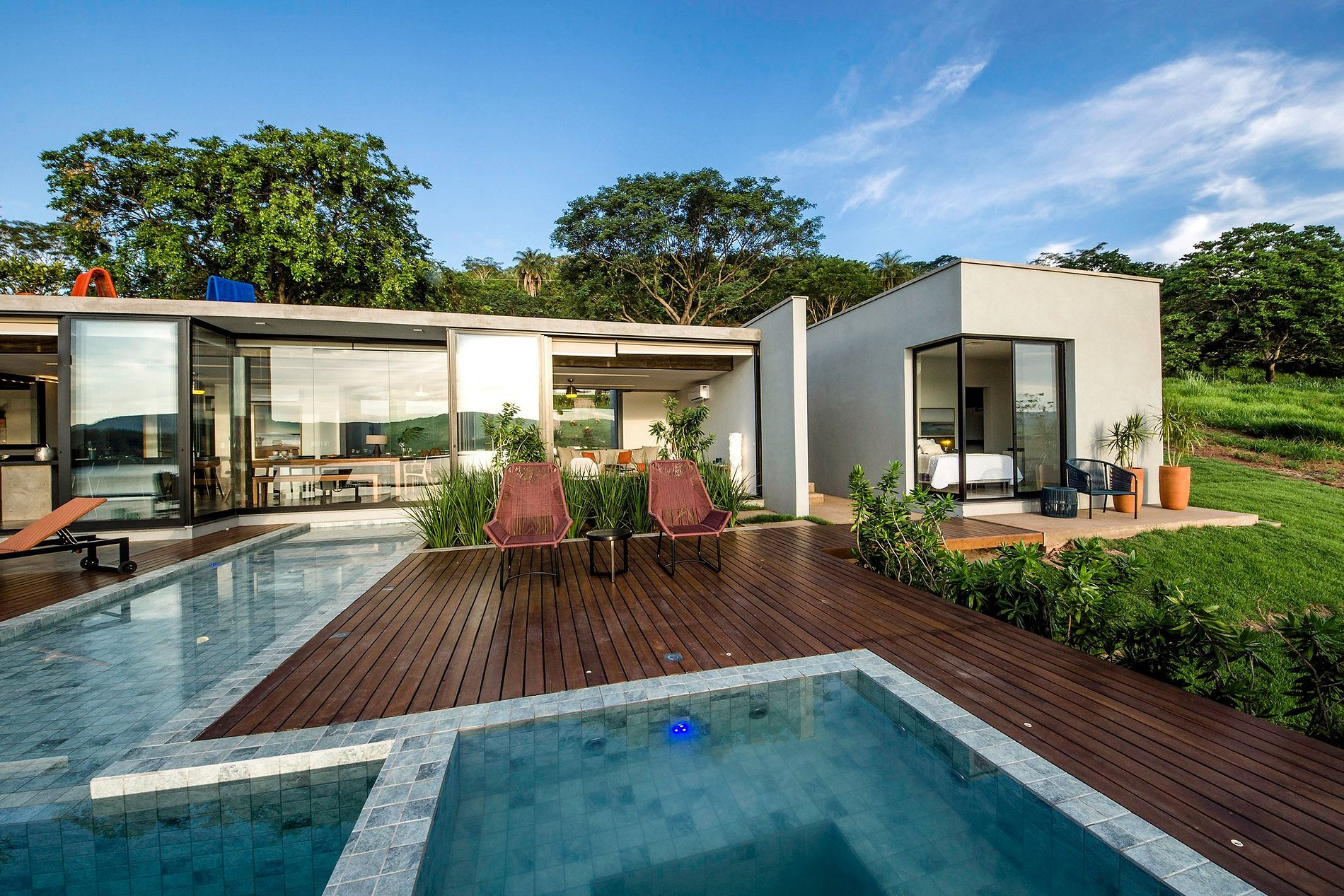It has 3 suites in chalets separate from the leisure complex of the house, being: