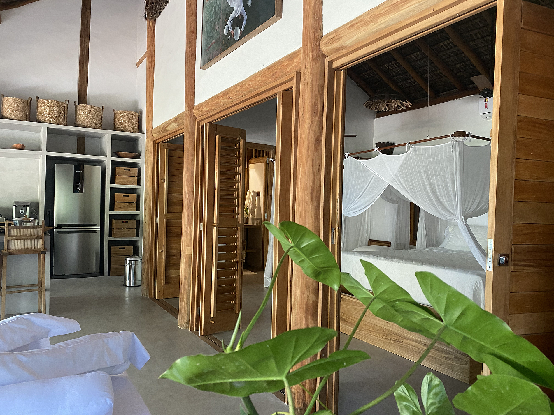 There are two suites, one with a double bed and the other with two single beds and a double bed. Both bedrooms are air-conditioned and all beds have mosquito nets.