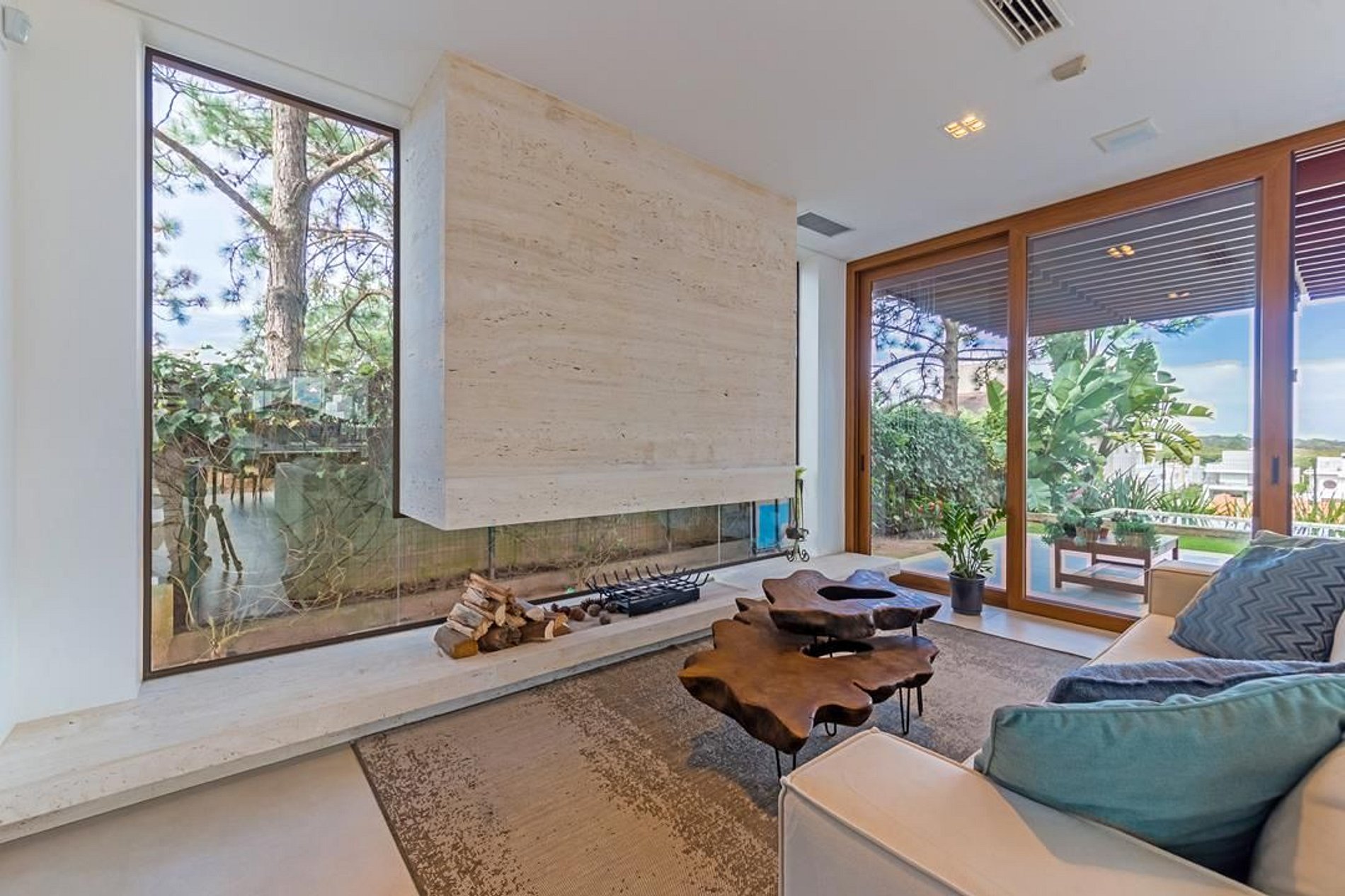 In addition to living room 3 environments, gourmet space integrated into the room, private office, high ceilings, with classic to rustic style, in wood and glass. The pool with Hijau stones, a bluish green hue creating a color effect close to the color of the sea, making the pool integrate into the landscape in a natural way. Hijau is a volcanic stone, imported from Indonesia, very resistant, porous, non-slip and because it is natural, it adds a lot of beauty and a special effect in the pool, jacuzzi and sauna.