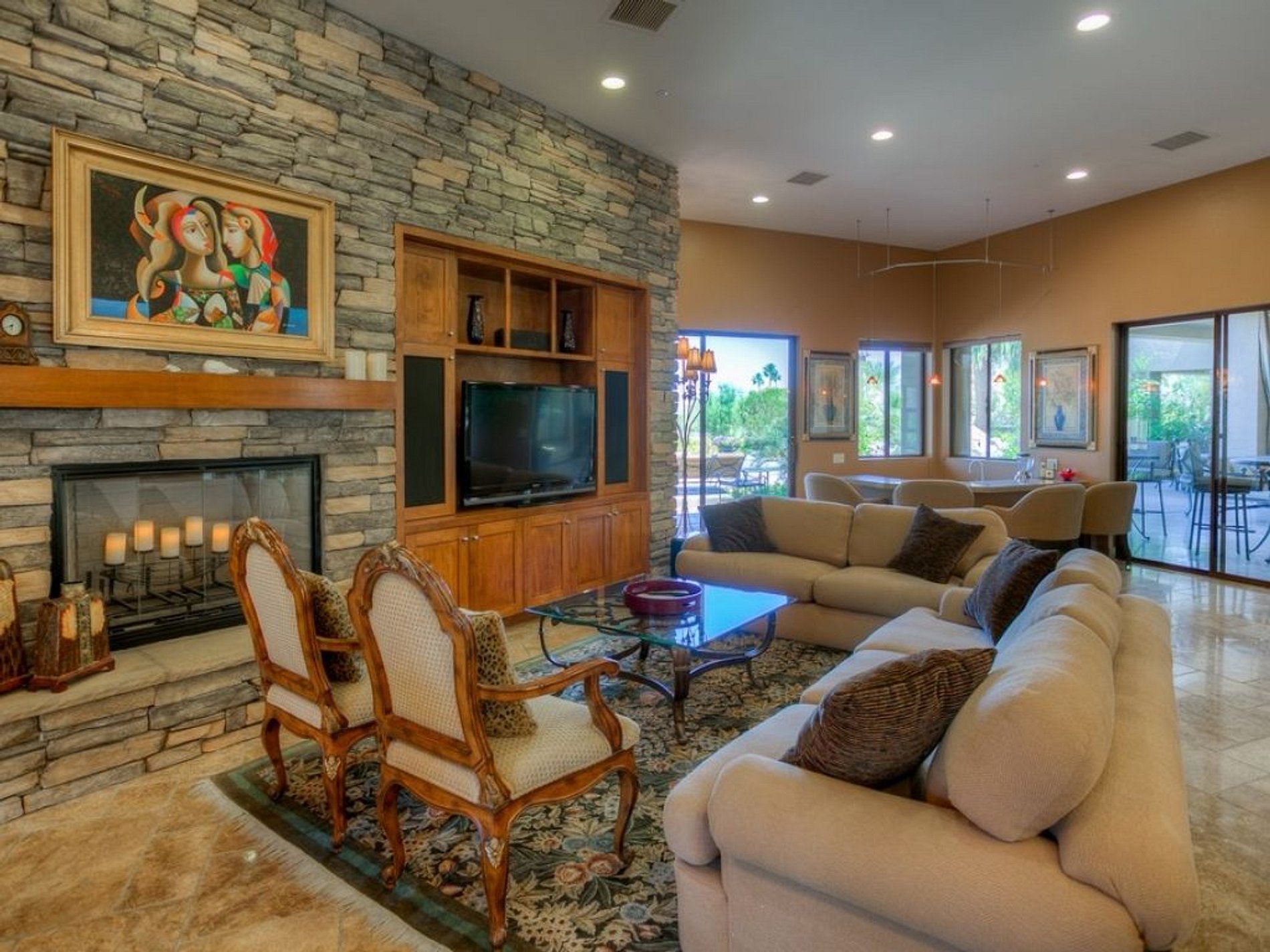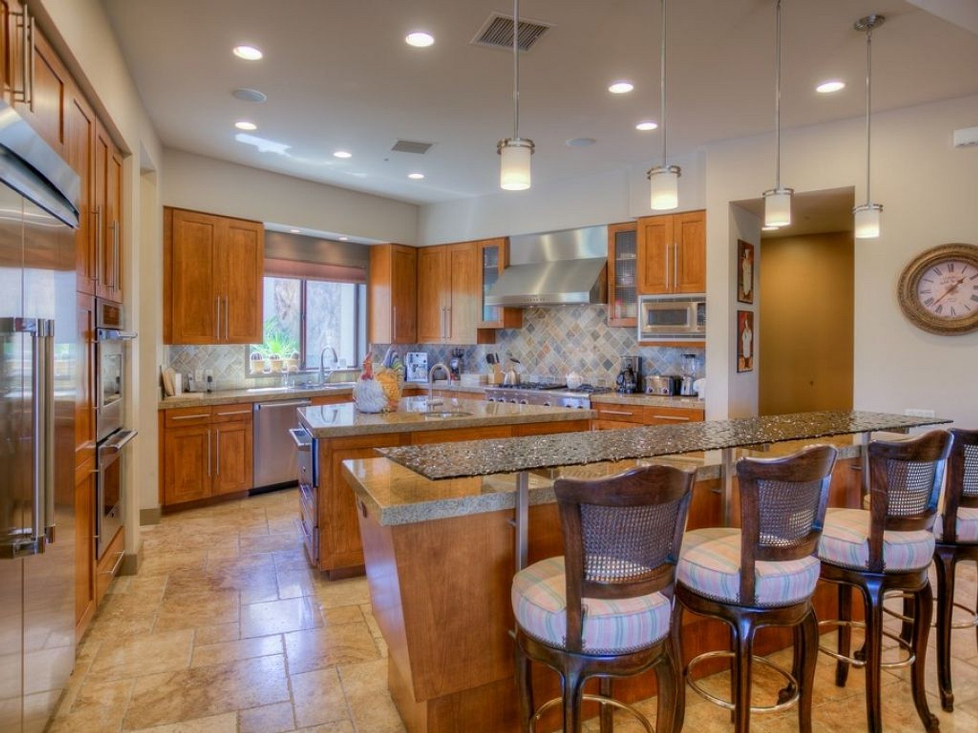 The open plan living spaces boast a great room with 20' retractable sliding glass doors leading to outdoor living spaces. Contemporary and comfortable, the great room features flat screen TV, a fireplace, and a step down bar. The kitchen is a chef's delight and even offers a wine refrigerator and casual dining bar.