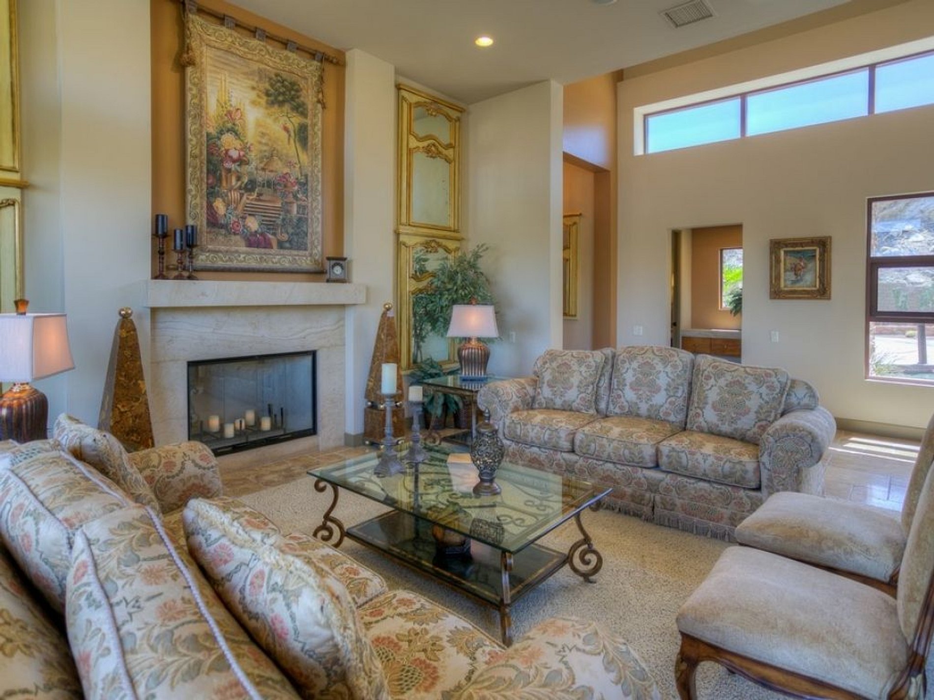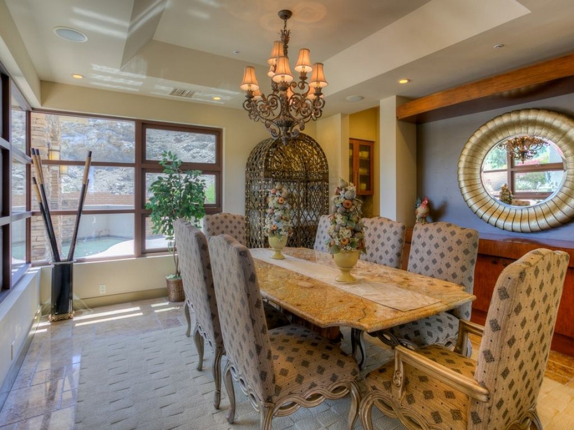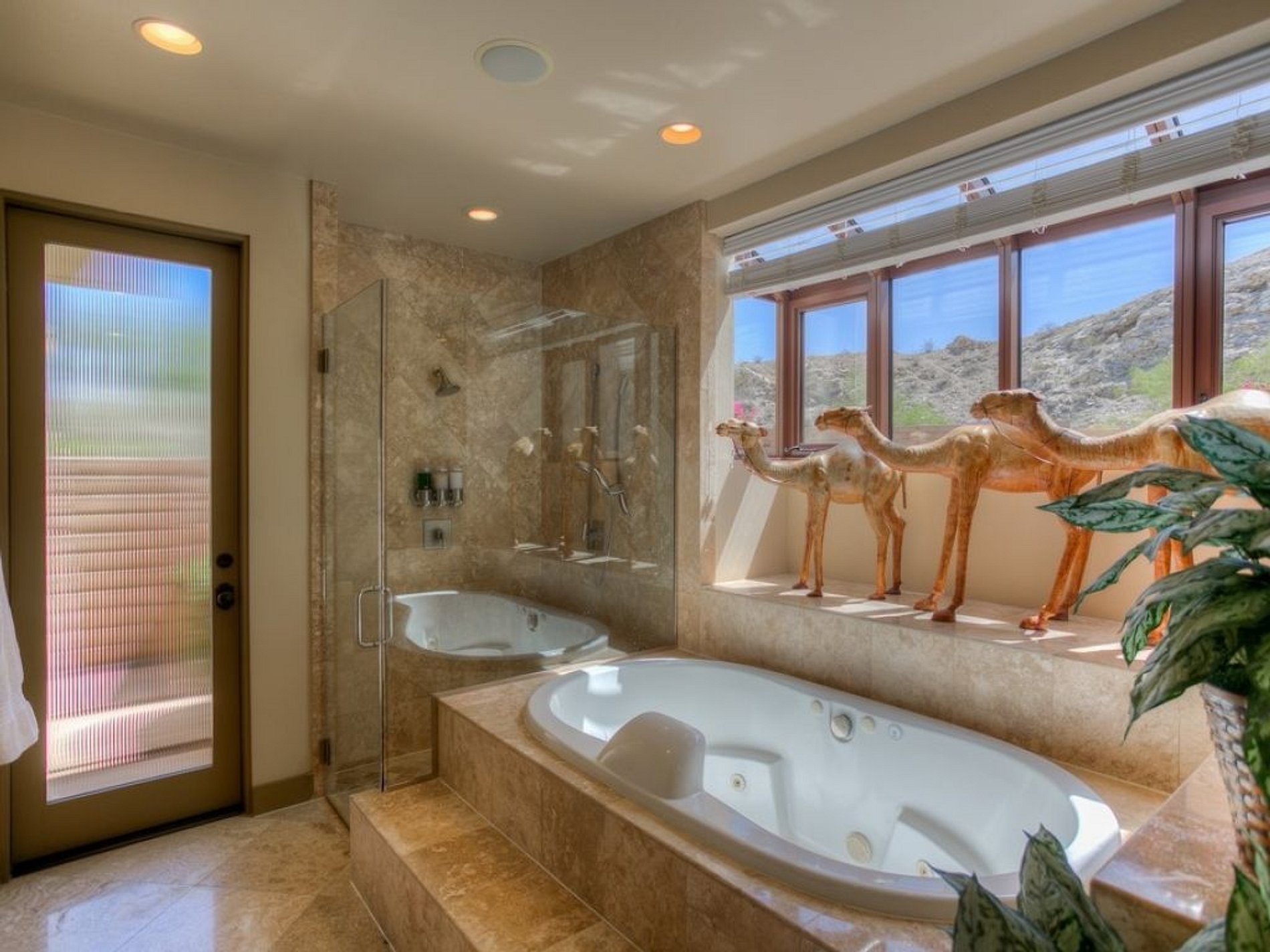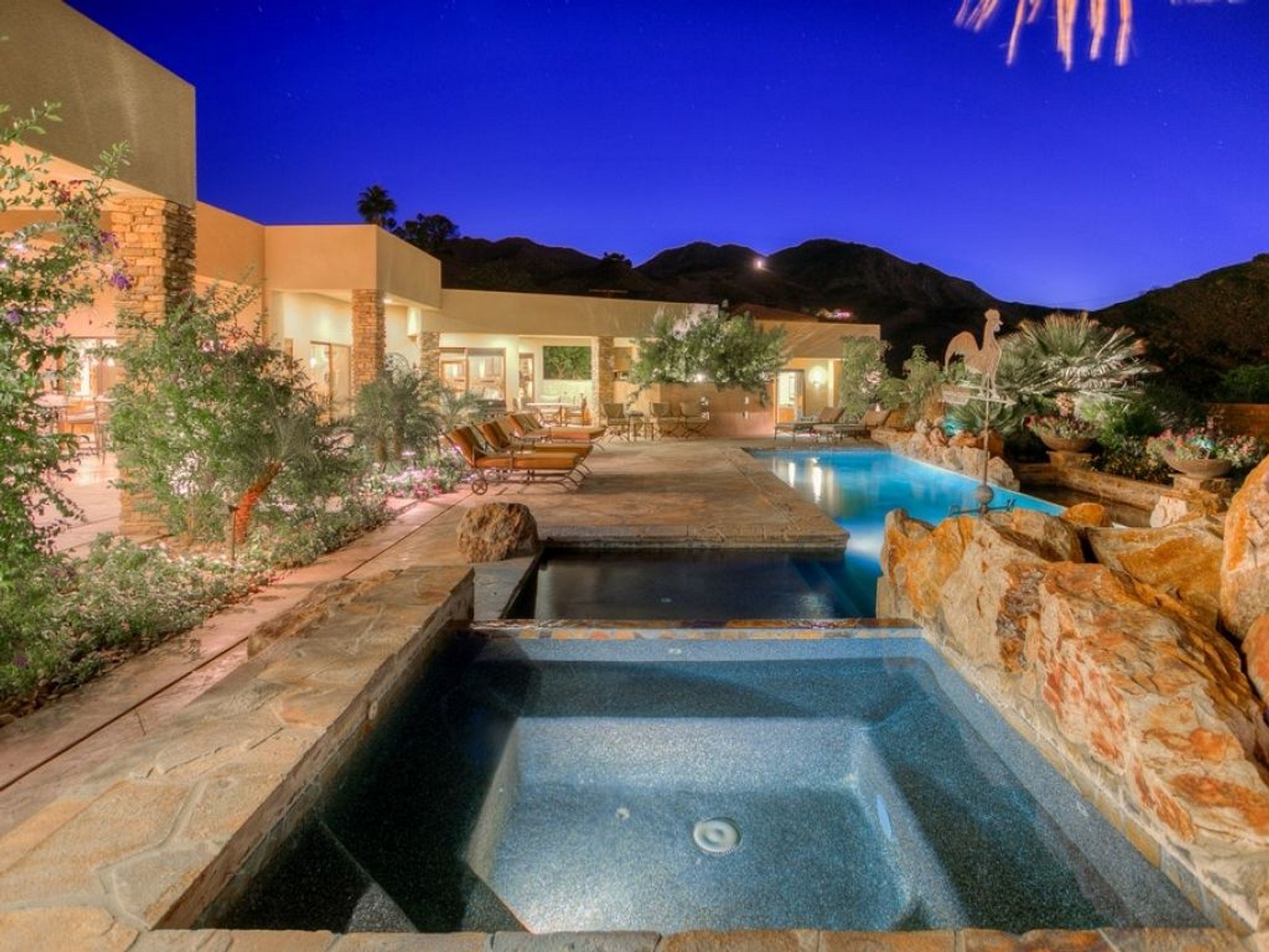 The private salt-water L-shaped swimming pool is surrounded by extensive travertine tile decking, with the jacuzzi set privately to one side. Ample outdoor seating and dining options, along with a gas barbecue grill and outdoor sound system, allow for seamless indoor and outdoor living options.