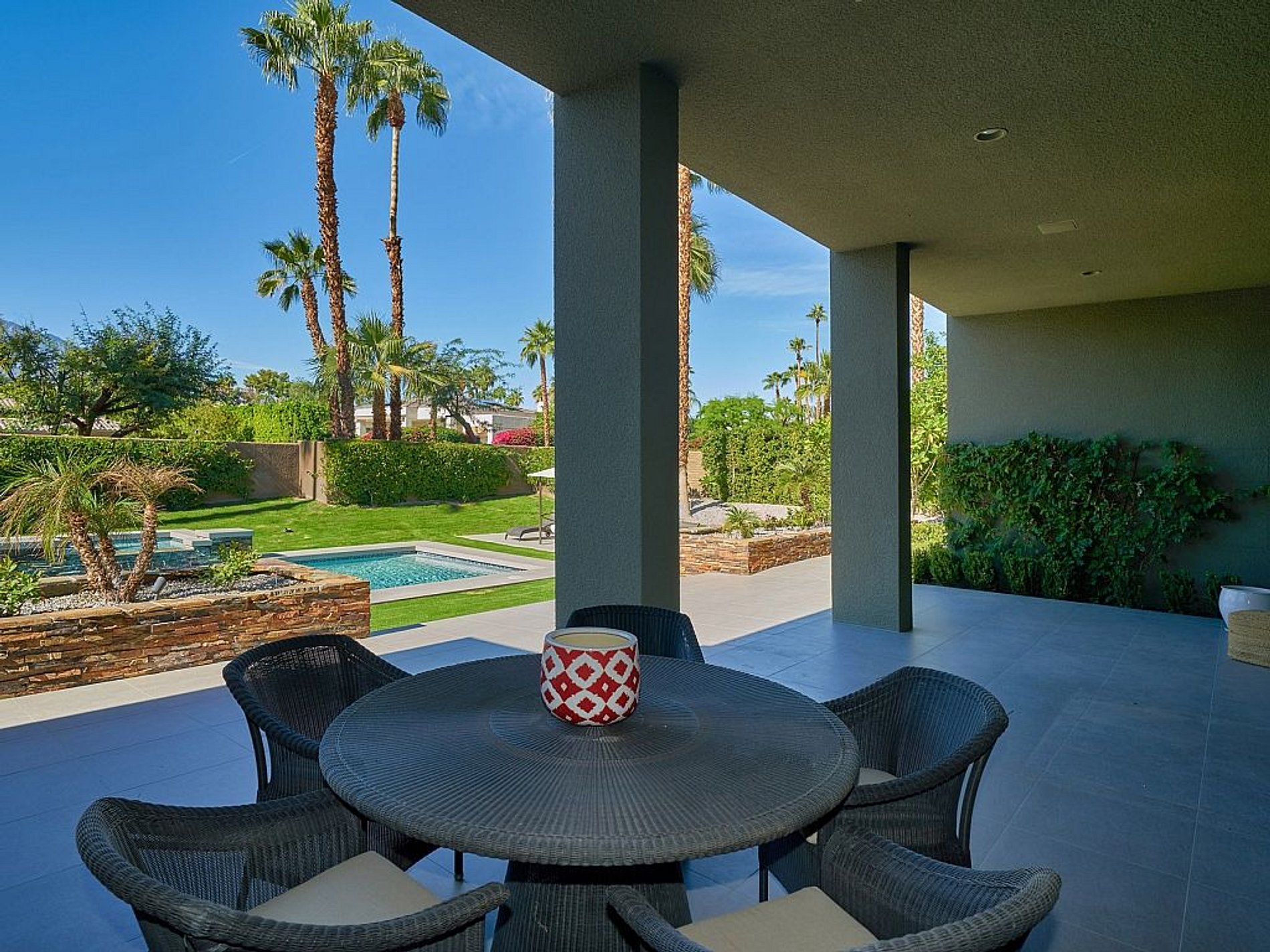 On a prime corner lot in the historic Tamarisk area of Rancho Mirage, this contemporary tennis estate sprawls over a half acre and showcases impressive scale and utmost privacy.