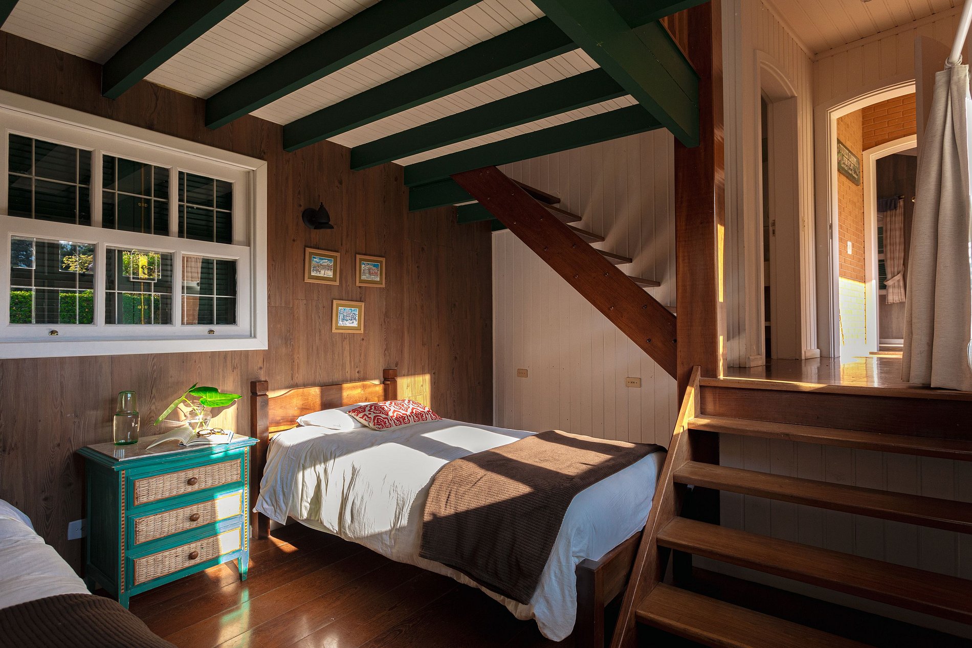 Suíte 7 Chalet: no andar de baixo são duas camas solteiro e no andar de cima é uma cama de casal