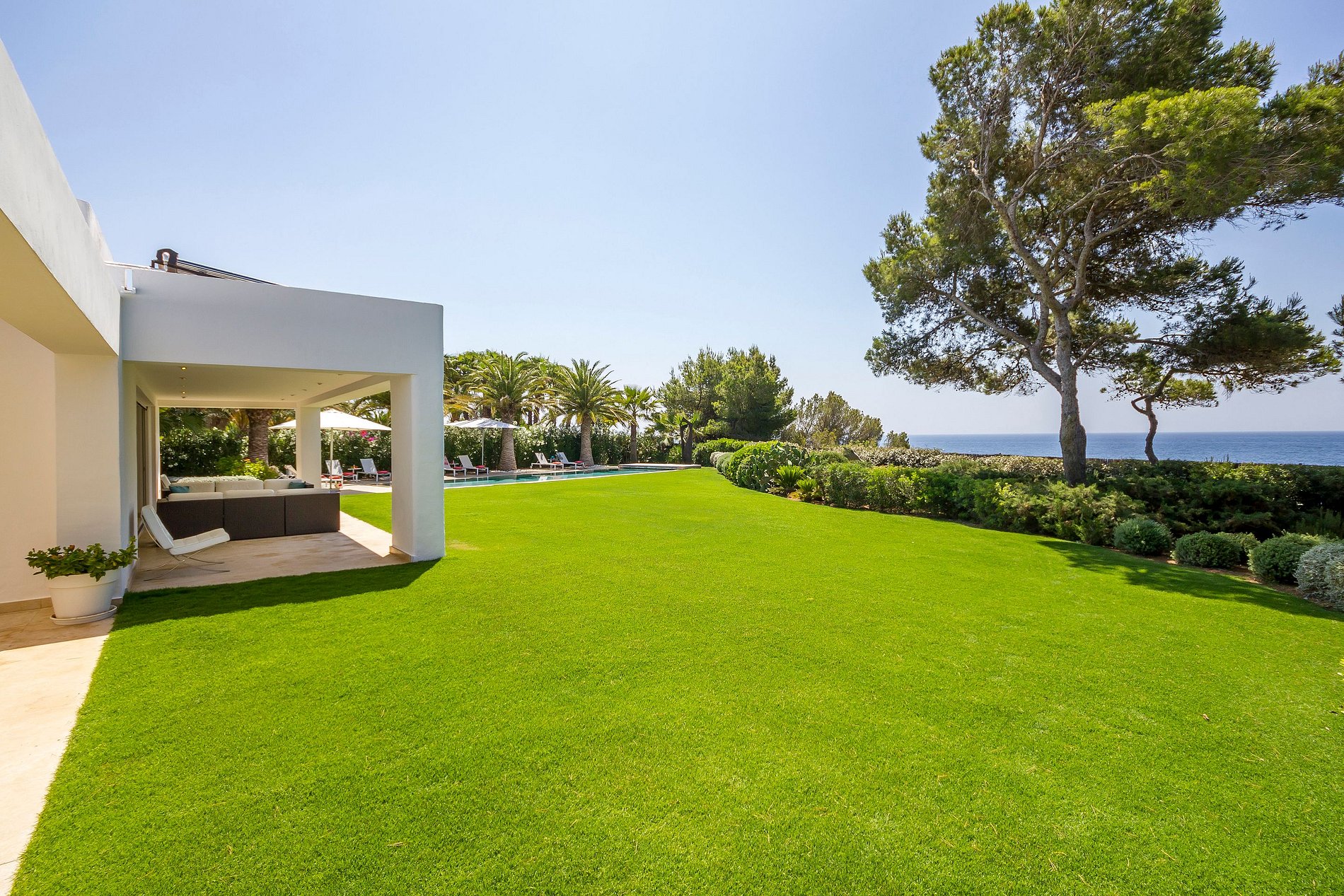 No coração do arquipélago das Baleares, a sudeste de Ibiza, encontra-se a luxuosa Villa Antonella, próxima praia de Niu Blau, também conhecida como Bora Bora. Localizada na região de Santa Eulària des Riu, esta vila de luxo em Ibiza reina em um magnífico jardim com vista para o mar azul-turquesa.