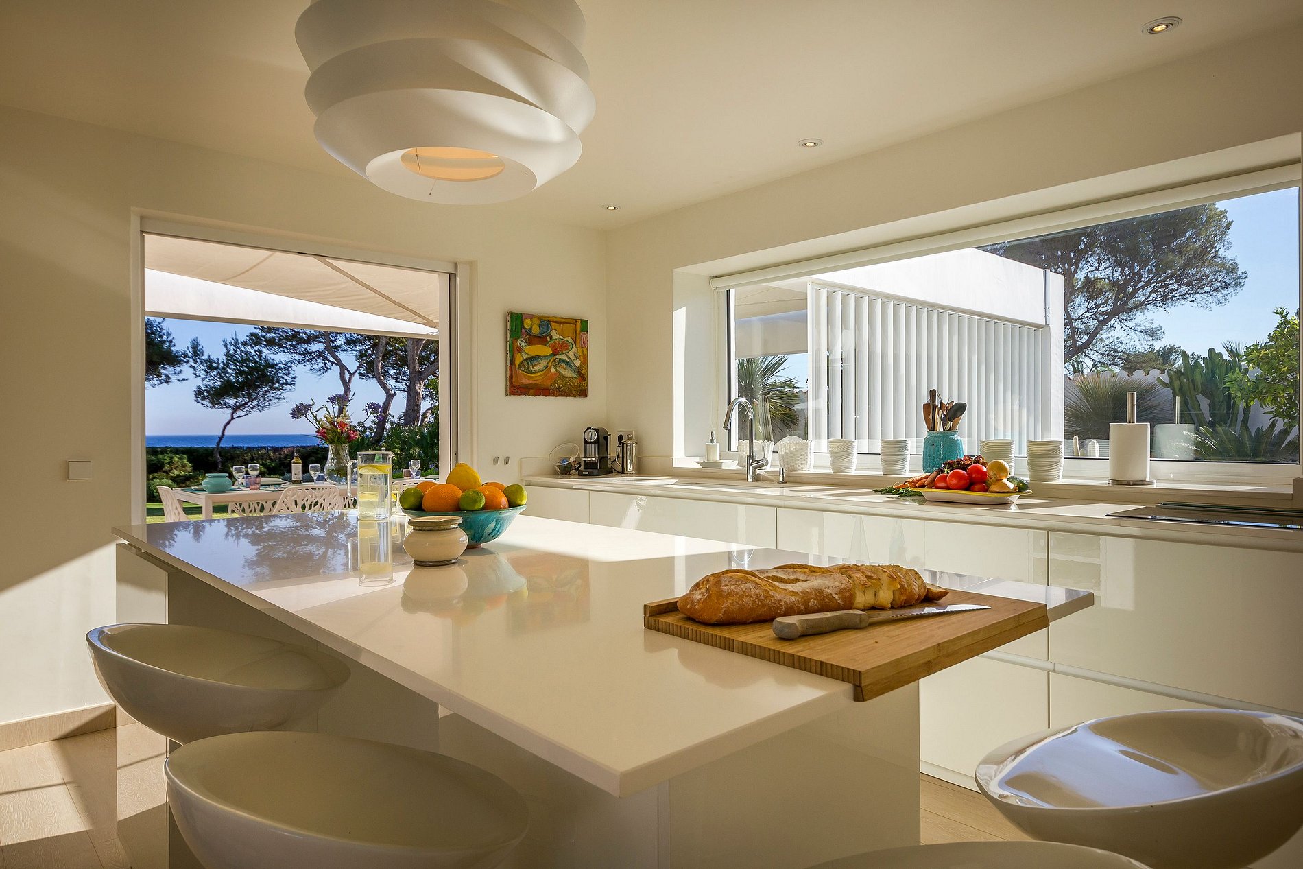Escondida entre árvores frutíferas, a decoração elegante e leve da luxuosa Villa Antonella em Ibiza. De manhã, a brisa fresca complementa o café da manhã em família com vista para o mar.