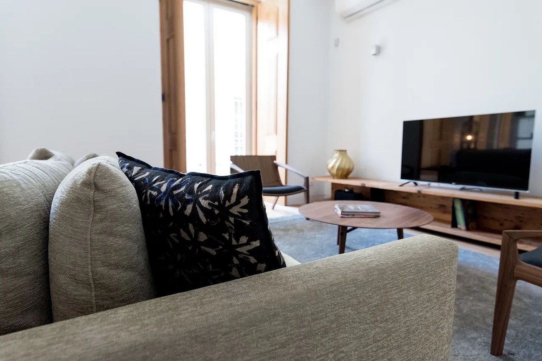 Neste amplo estúdio, a sensação é de que o quarto, onde predomina a cabeceira da cama de azulejos, entra na sala, servindo a estante branca de separador entre as áreas. A histórica parede-mestra com as cruzes de Santo André resguarda o percurso para o WC dentro da suíte. A cozinha completa é uma das mais convidativas a usufruir da luz exterior e do estúdio poderá apreciar a vista para a torre sineira da Basílica de Nossa Senhora dos Mártires.