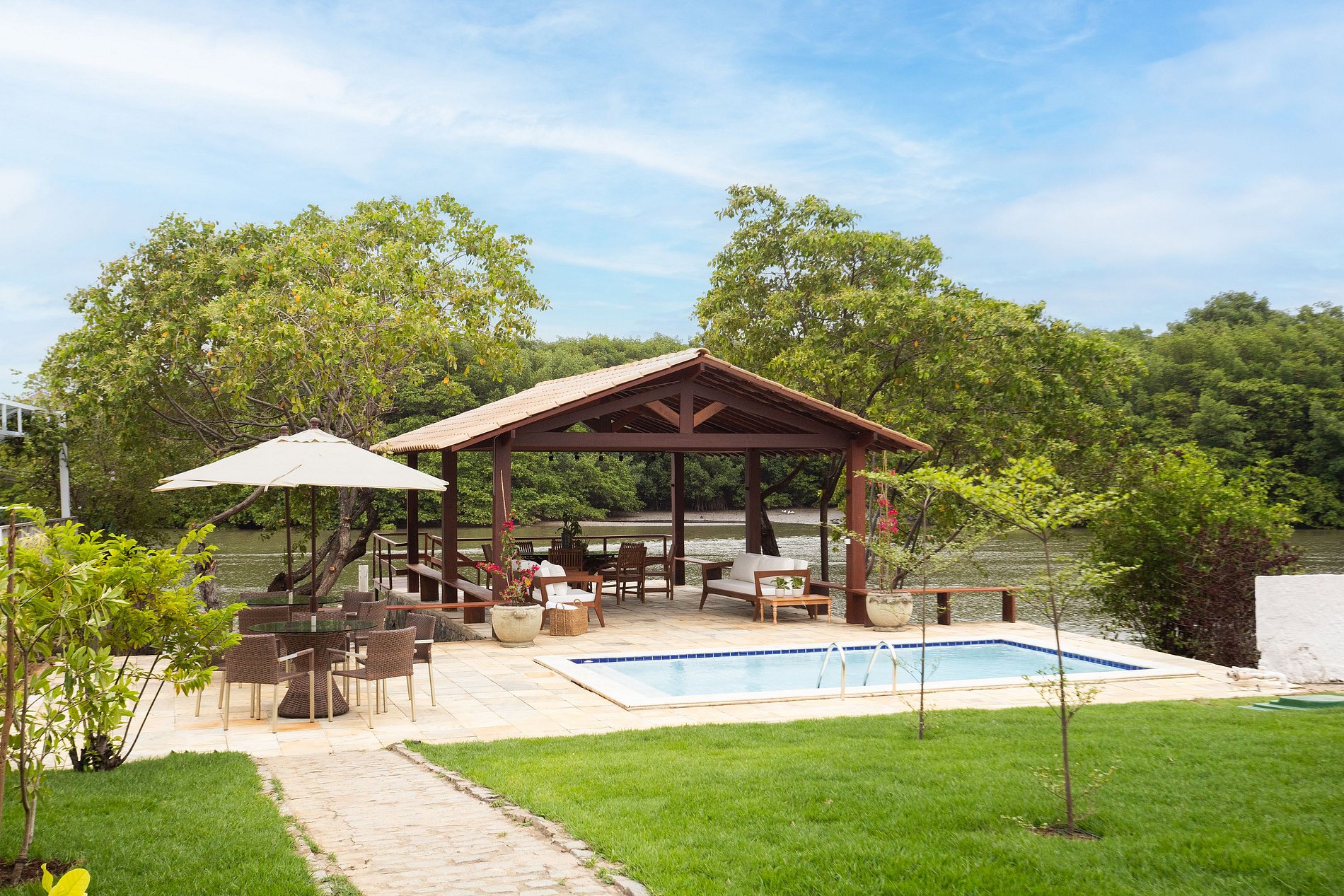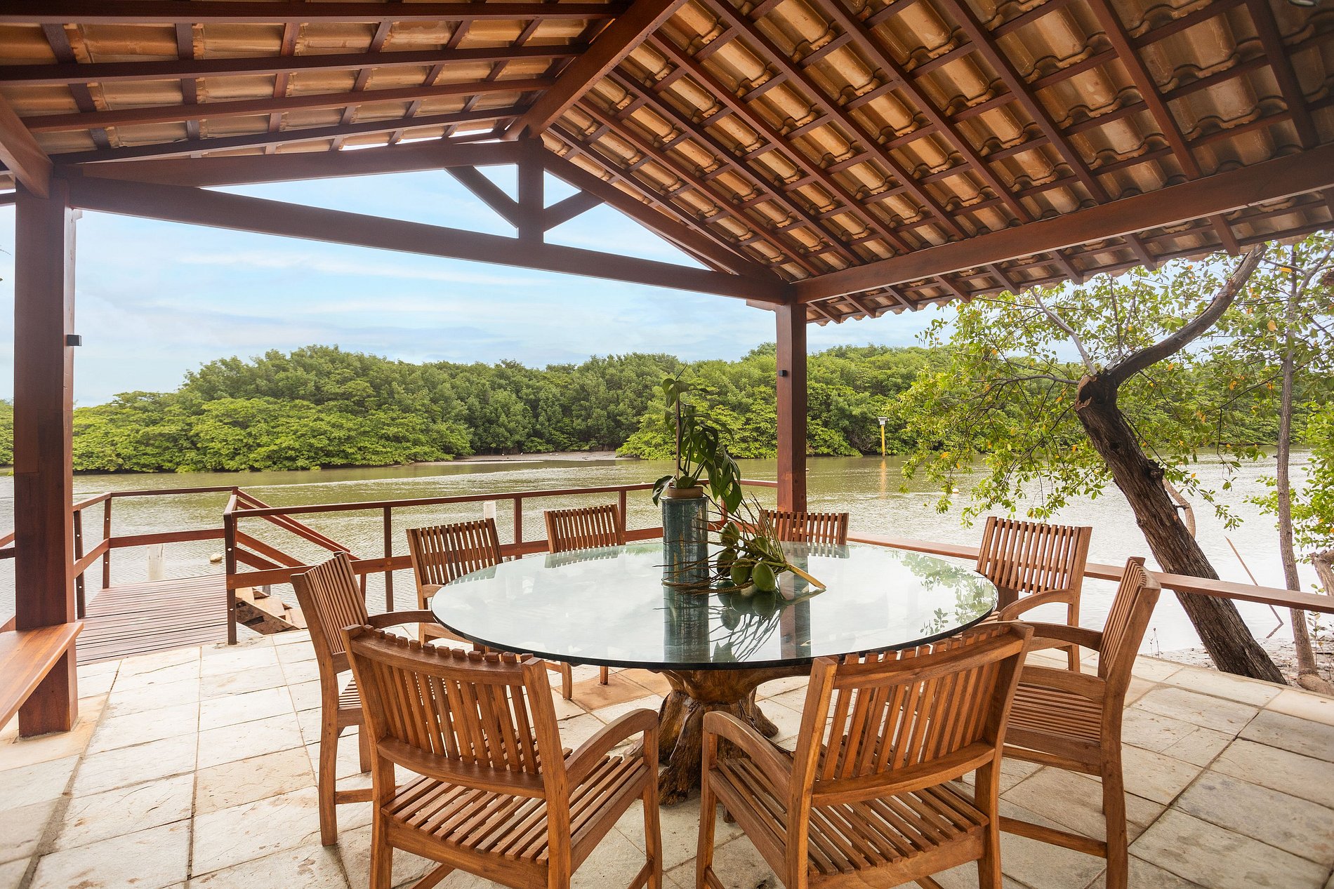 É uma casa de beira-rio, localizada no condomínio privado da Praia de Toquinho, no litoral de Pernambuco.