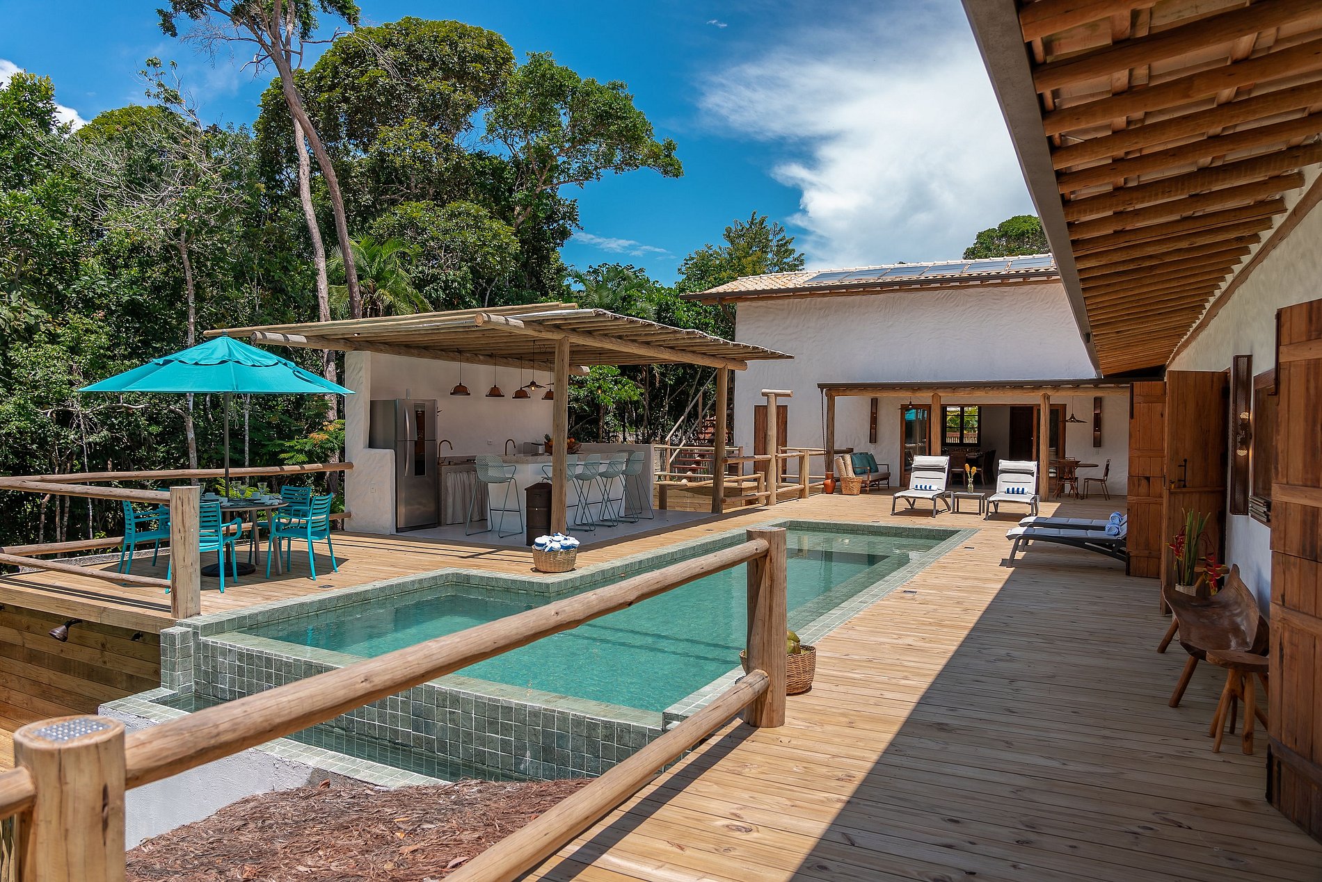 A casa oferece piscina com hidromassagem e borda infinita e uma vista deslumbrante para a mata nativa, espaço gourmet para refeições ao ar livre, um redário aconchegante num amplo jardim, sala de TV, sala de estar e jantar.
