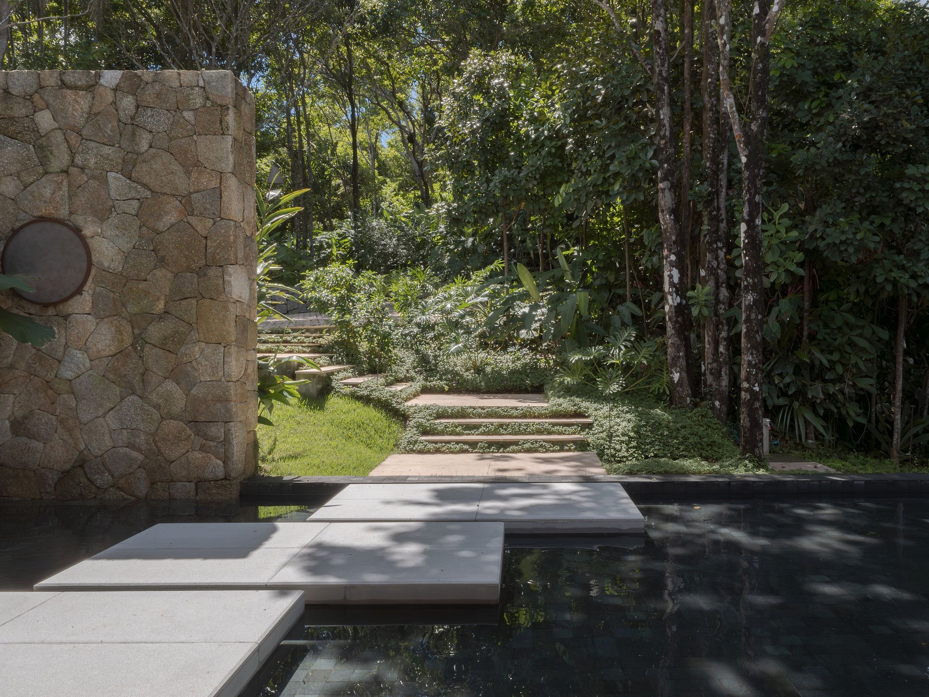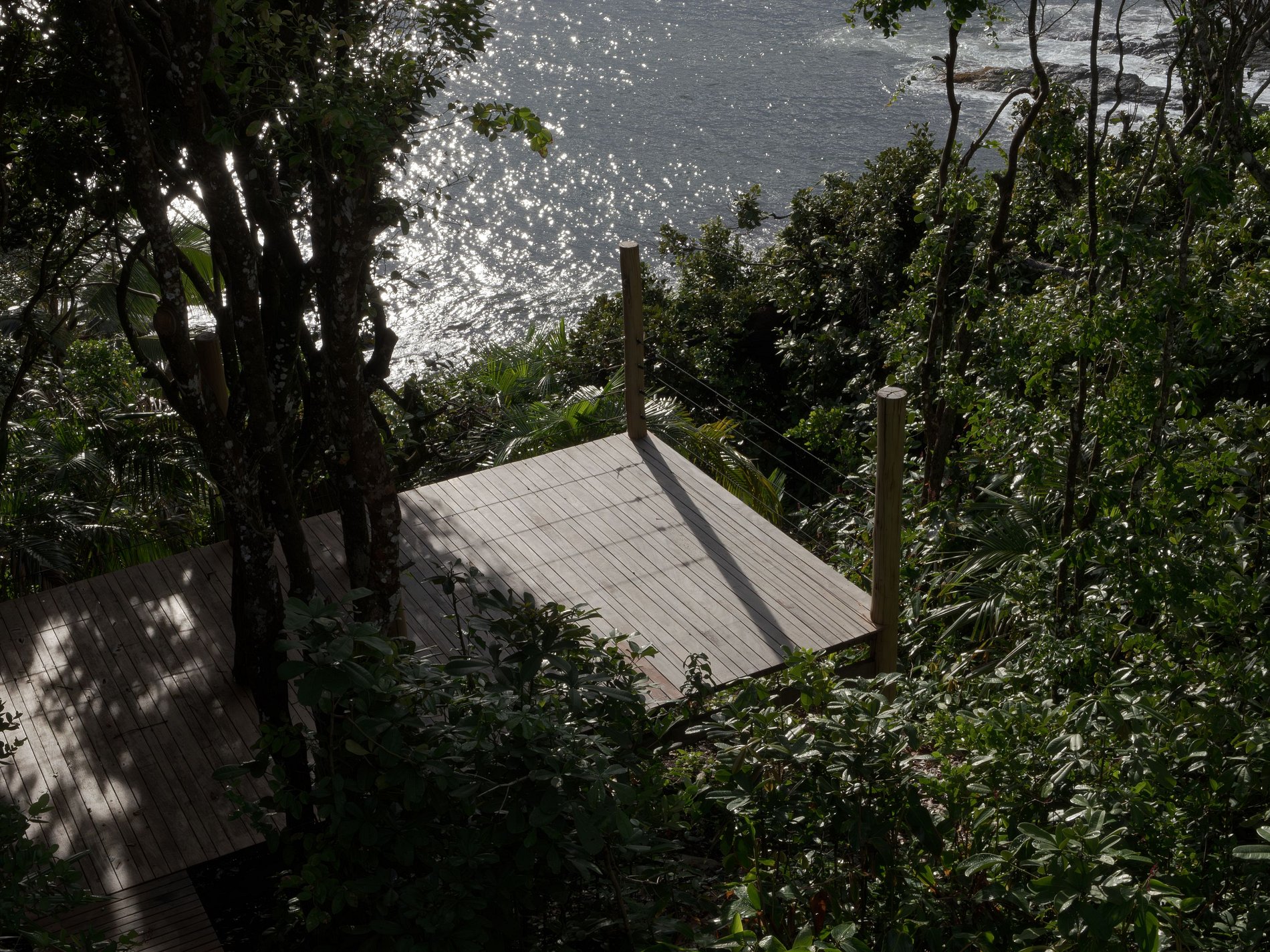 Com vista para nascer do sol de frente e para o oceano, tem uma piscina de pedra Hijau, com deck de madeira e mais um deck, no andar superior. Outros 2 decks, um ao pôr do sol de frente para a Mata Atlântica e um deck de ioga cercado por árvores, espreguiçadeiras e um sofá ao ar livre para relaxar.