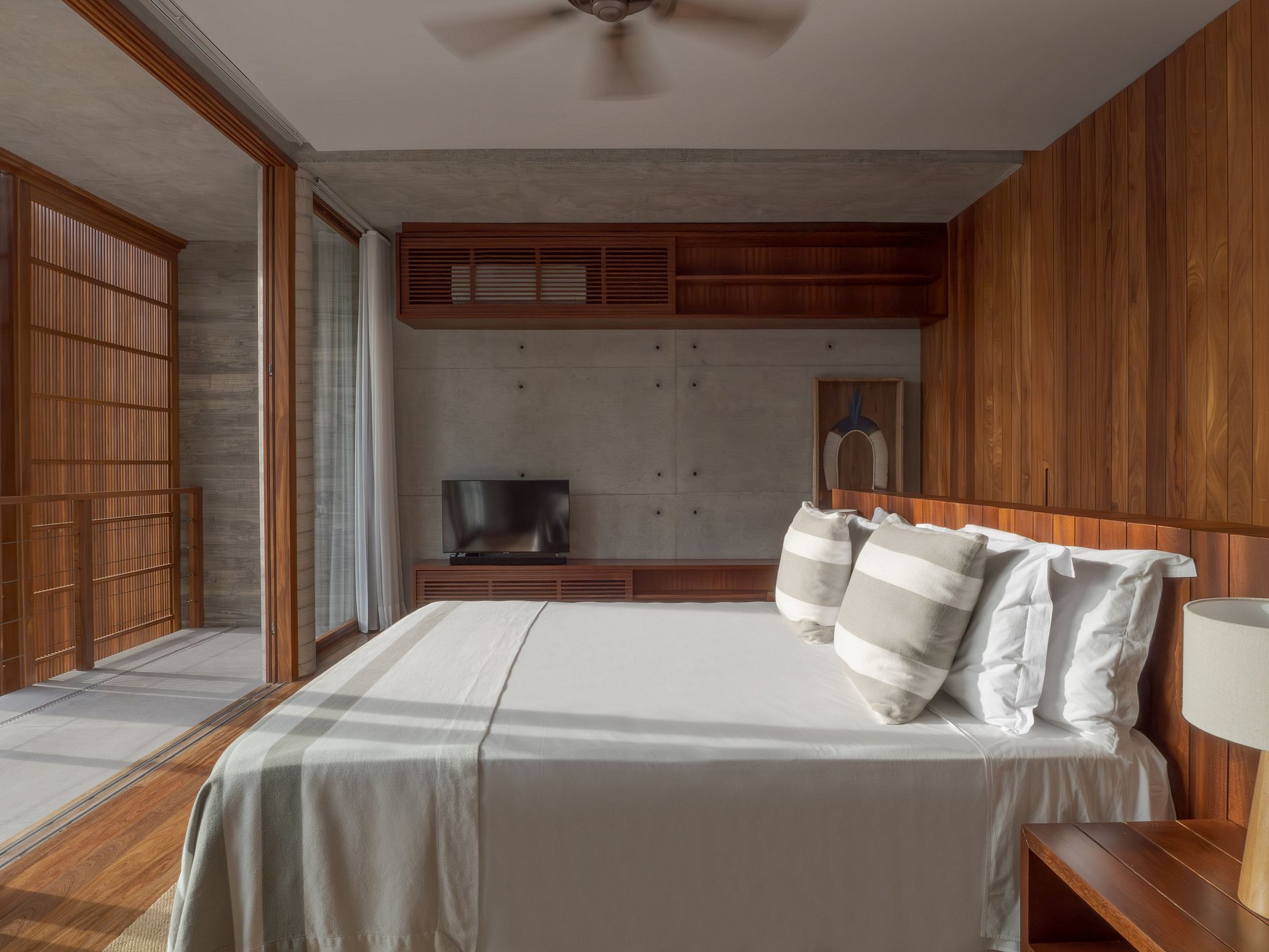 As camas king-size têm lençóis de algodão 300 fios, travesseiros e edredom de plumas de ganso, cortinas black out, ar-condicionado, ventilador de teto, frigobar e TV a cabo. Todos têm banheiro com chuveiro de alta pressão e toalhas Trussardi, e dois deles têm banheira com vista magnífica para a Mata Atlântica.