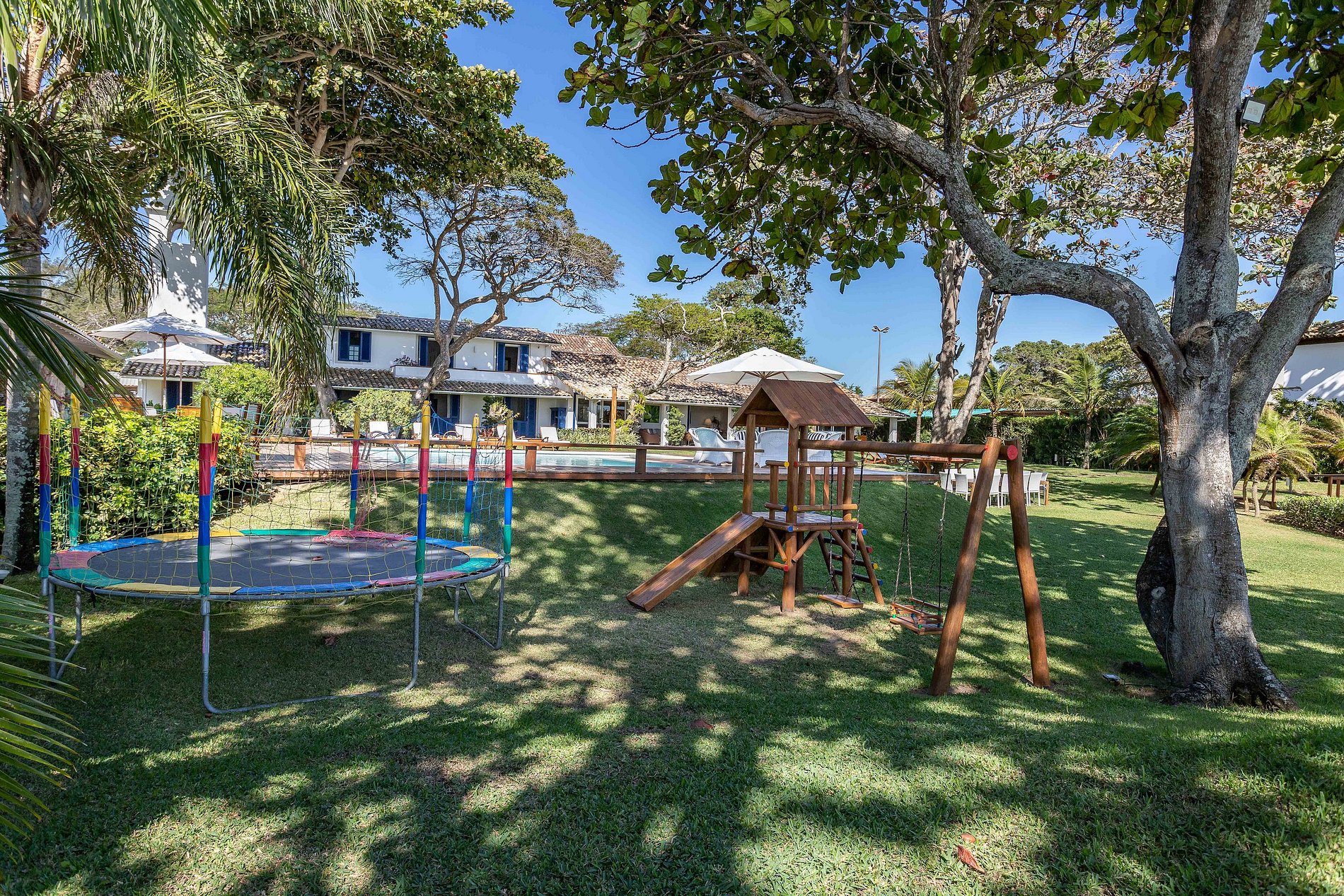 Espace enfants avec 1 trampoline et aire de jeux avec toboggan et balançoire.