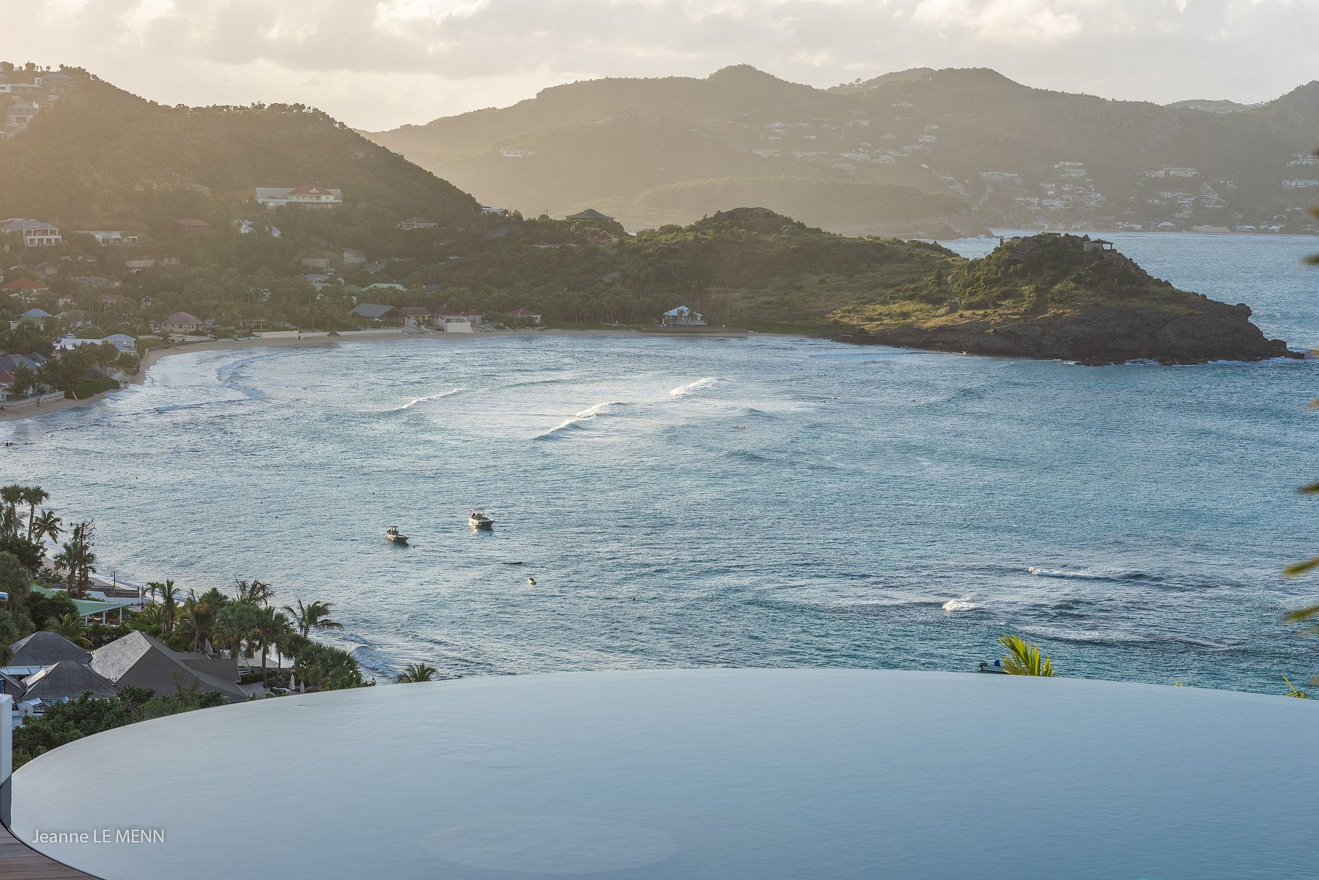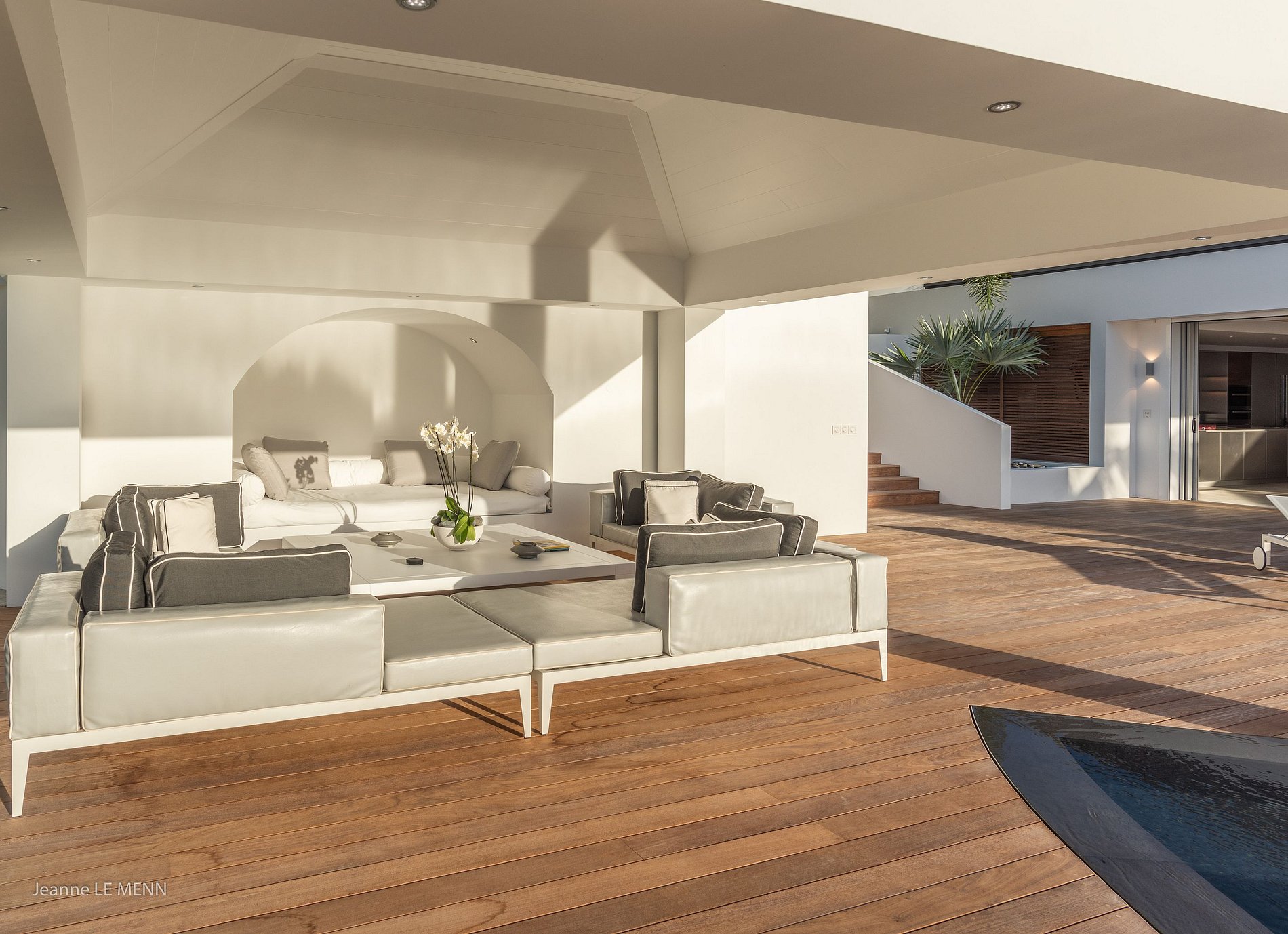 Desça as escadas para o deck e aprecie a vista expansiva de Lorient Bay e as ilhas. A poucos passos à sua esquerda, você está na cozinha moderna e totalmente equipada, com bancada em pedra preta e uma espaçosa geladeira Liebherr. A cozinha da Vila COCO PALMS abre diretamente para uma sala de estar confortável com uma televisão, e além disso, uma área de jantar com capacidade para dez pessoas. Mas se você está procurando o melhor ponto de vantagem para relaxar e ver o sol poente, vire à direita e você vai encontrar uma alcova almofadada com a visão perfeita, cercado com lugares sentados para oito, se você sentir vontade de compartilhar o momento. Estendendo-se até a borda da propriedade, um gramado verde convida você para mover uma das cadeiras de praia sob os galhos de uma árvore flamboyant.