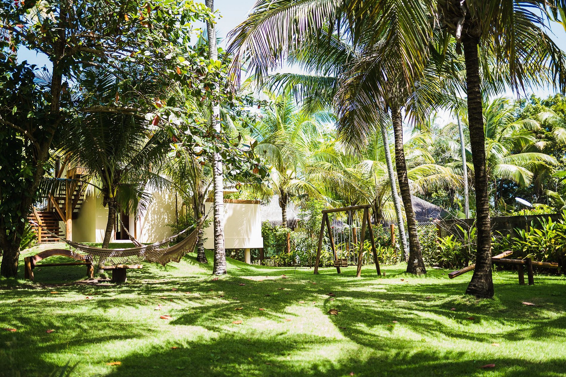 Cada bangalô tem 2 suítes, uma no térreo e outra no primeiro andar, equipadas com frigobar, microondas, banheira de hidromassagem e varanda.
