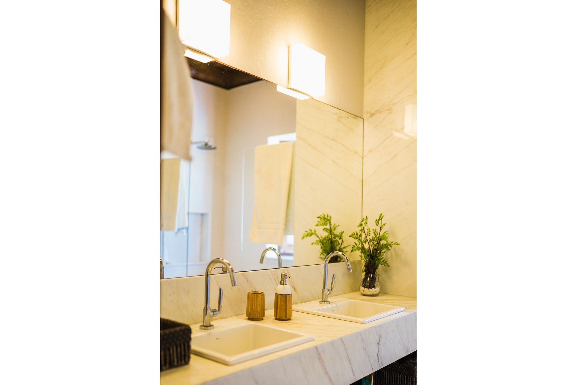 Cada bangalô tem 2 suítes, uma no térreo e outra no primeiro andar, equipadas com frigobar, microondas, banheira de hidromassagem e varanda.