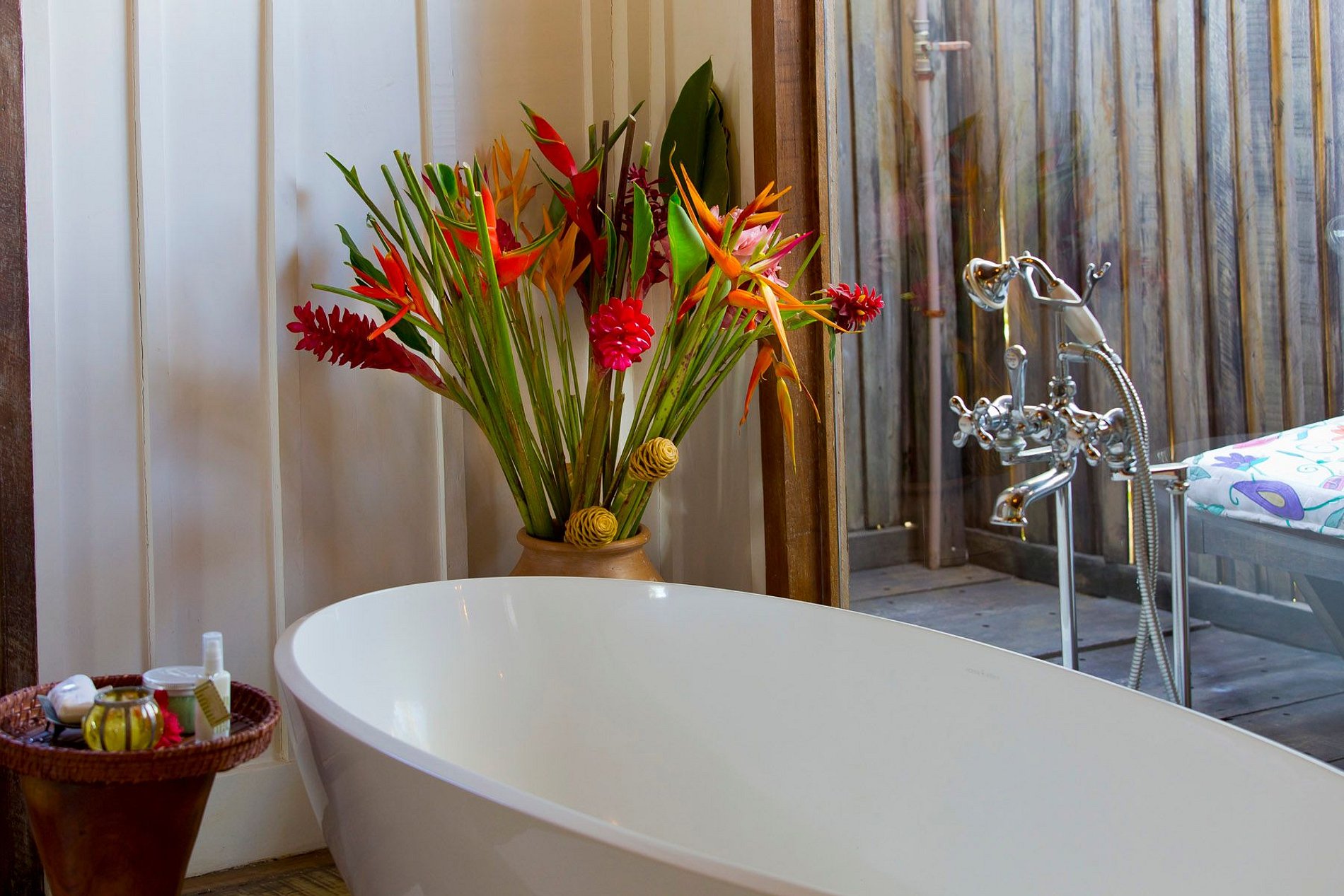 O banheiro/closet destaca-se pela banheira de rocha vulcânica ‘limestone’, em design italiano, de frente para janelão de vidro, com vista para o pôr do sol. Na varanda dos fundos, ducha ao ar livre e área privativa para curtir um banho de sol.
