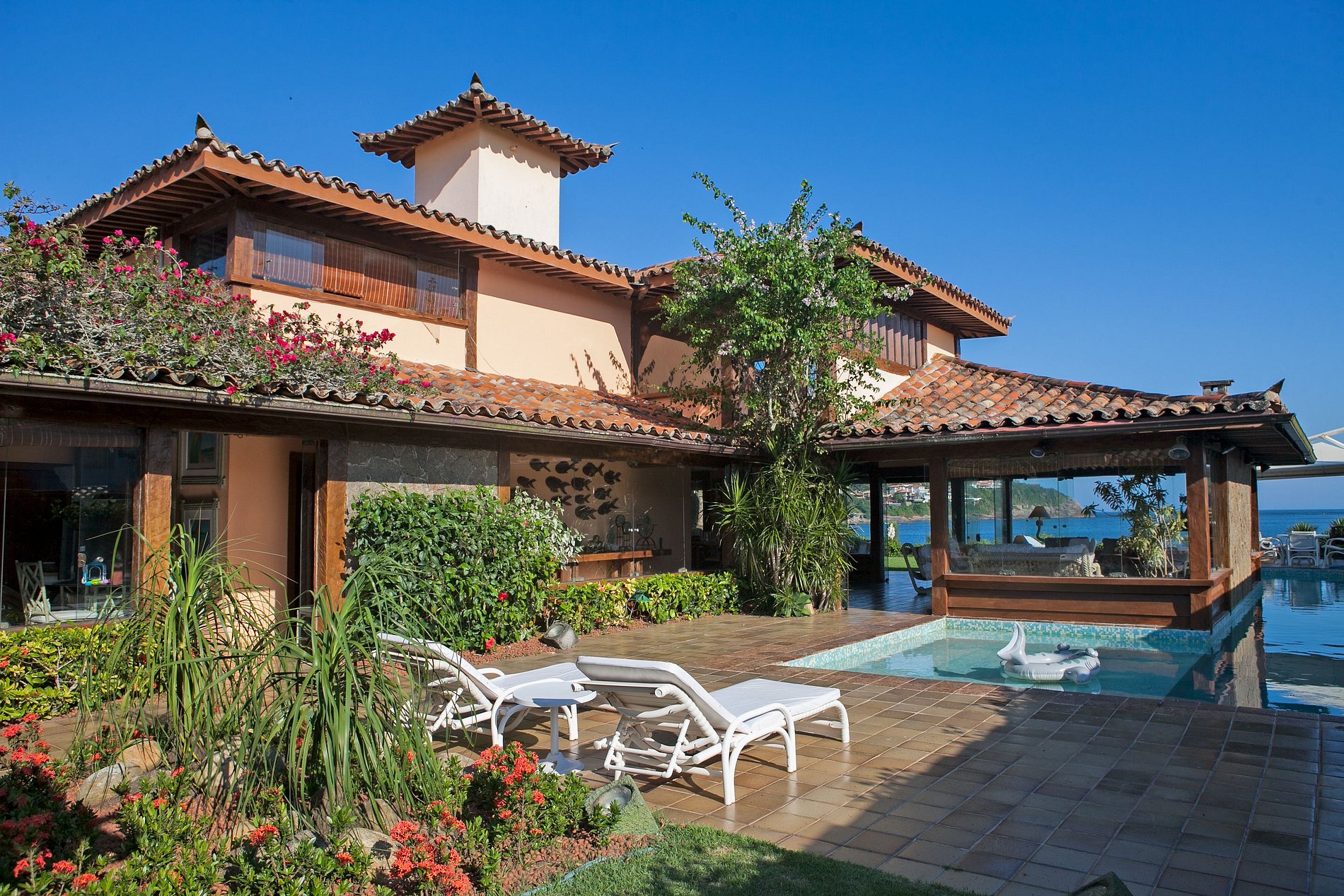 Charmosa casa “pé na areia” no centro da praia da Ferradura, com vista privilegiada do horizonte. Todas as 7 suítes oferecem ar condicionado, TV, lençol 300 fios e banheiro. Duas salas sendo uma de estar na beira do mar e cercada pela piscina e a outra com TV de 65’’ com SKY HD.