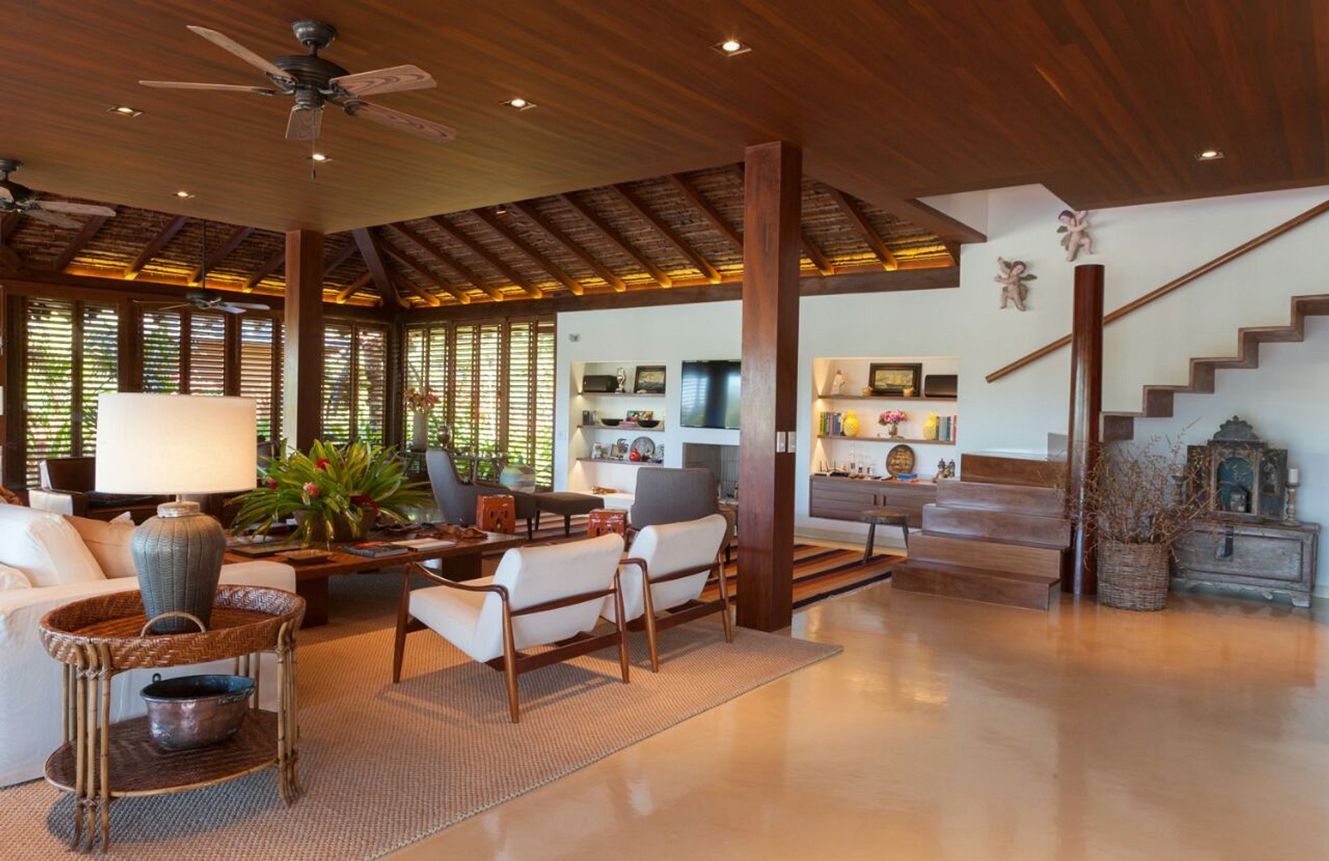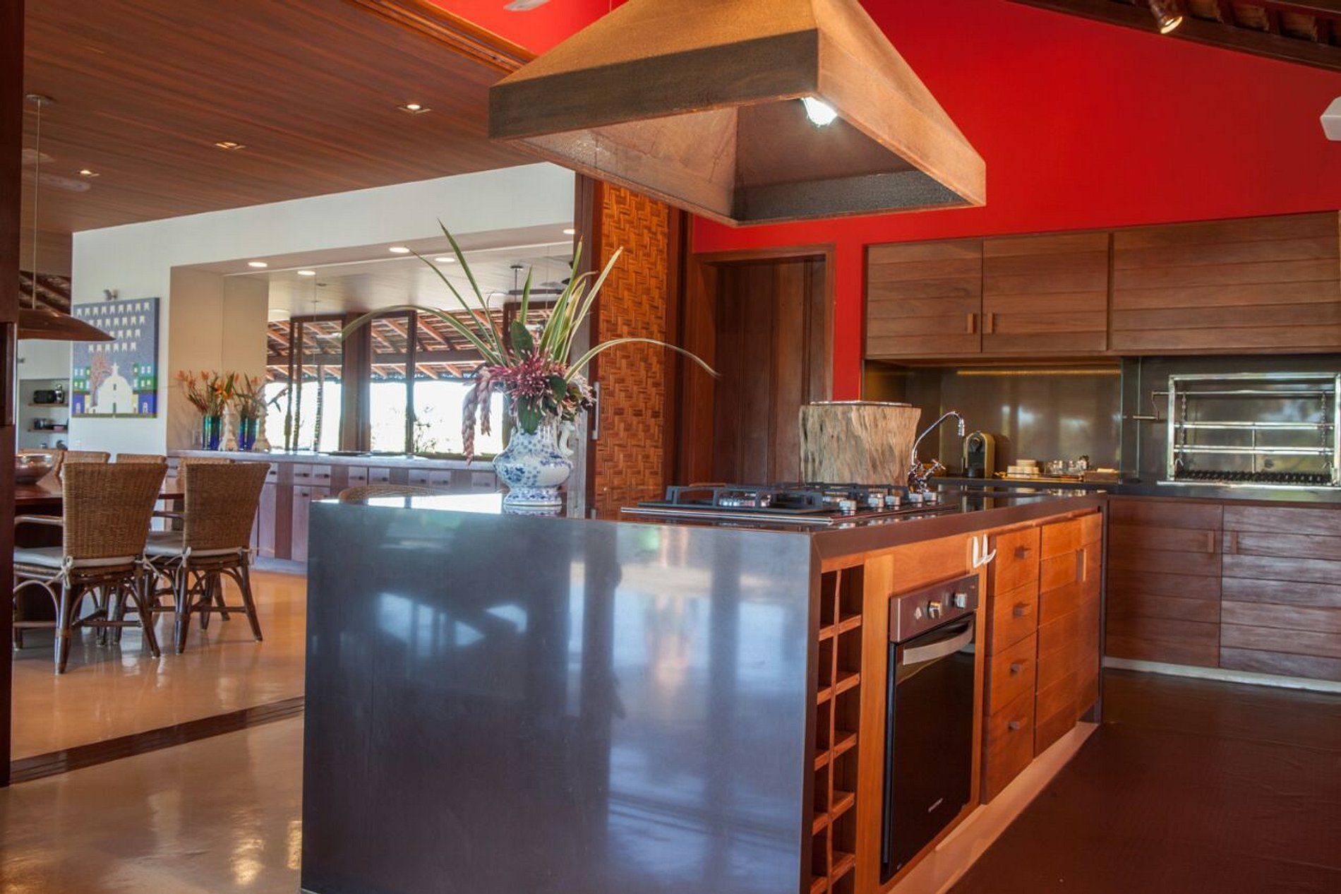 Possui sete suítes, sala de estar e jantar, dois lavabos, sistema de som ambiente, adega de vinhos, três geladeiras, um freezer, uma cervejeira, dois frigobares, espaço gourmet, máquina de gelo, piscina, spa, apoio de praia, gerador para 100% da casa, e poço artesiano.