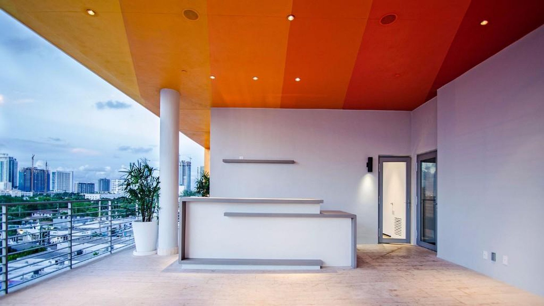 A propriedade possui 3.000 pés quadrados de espaço interior com ar condicionado, incluindo uma sala de estar com pé direito duplo, além de 2.500 pés quadrados de terraços externos. O enorme terraço coberto por um dossel colorido protetor e equipado de um bar e um chuveiro ao ar livre, é um dos espaços mais exclusivos de Miami.