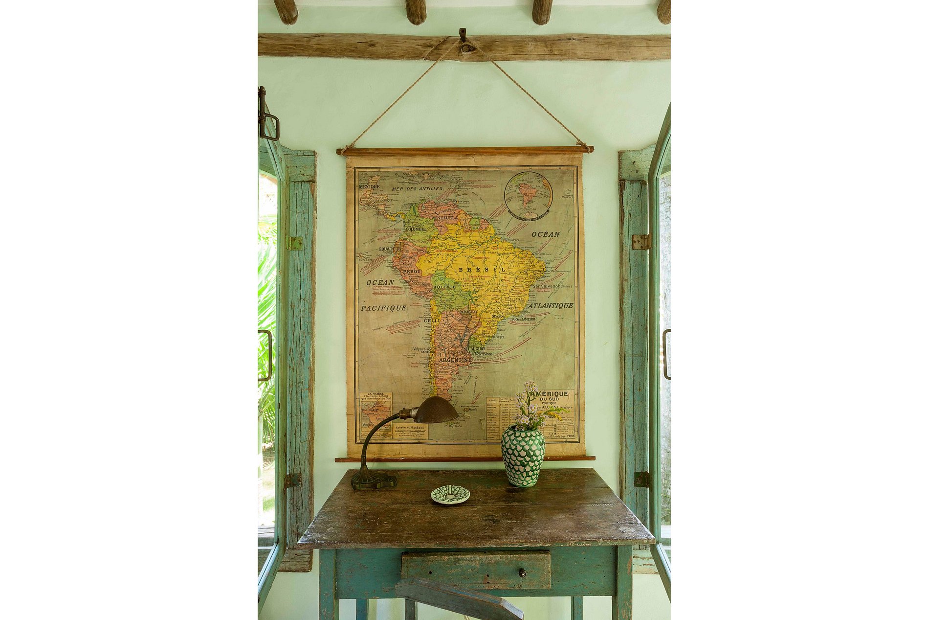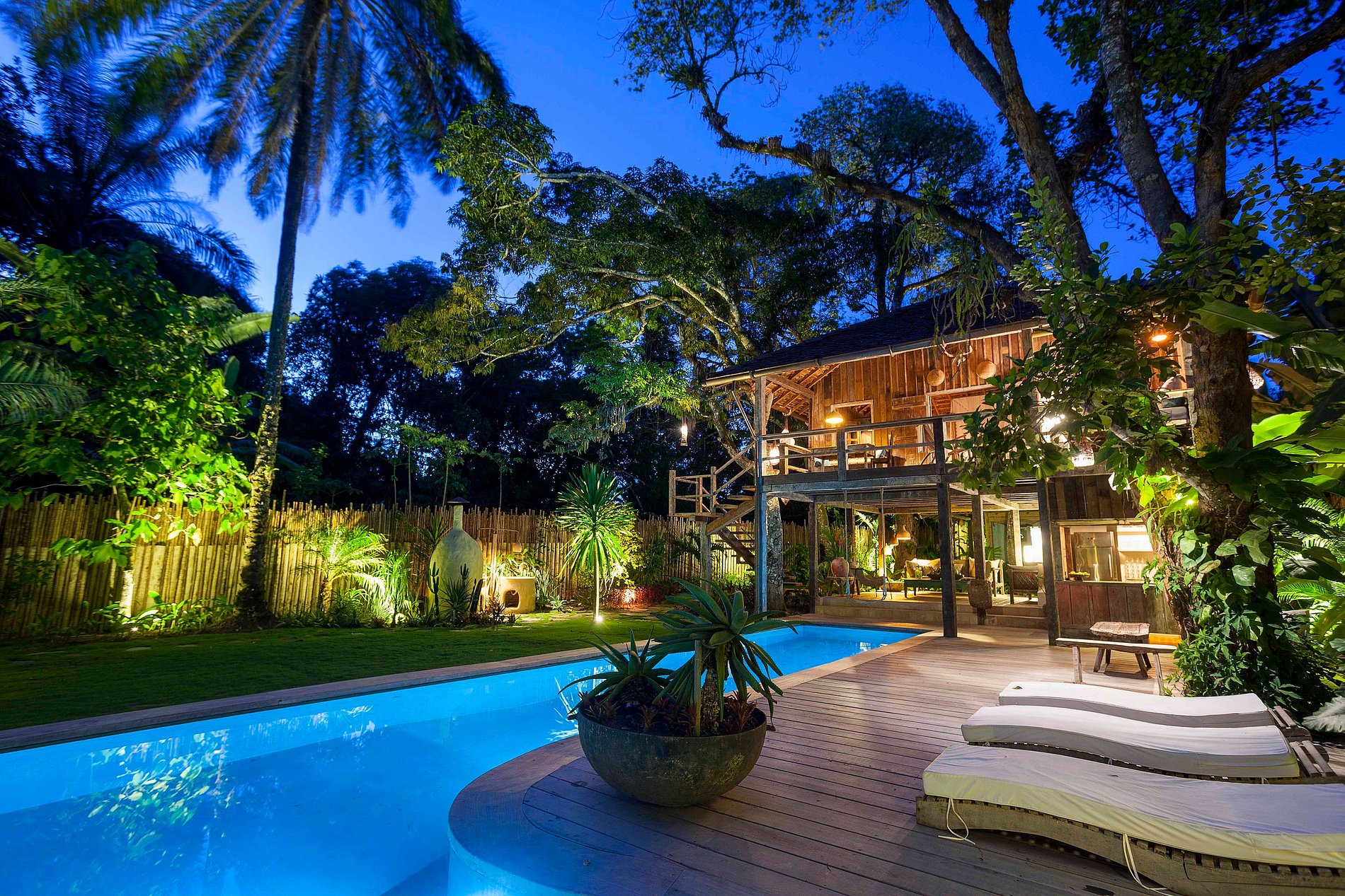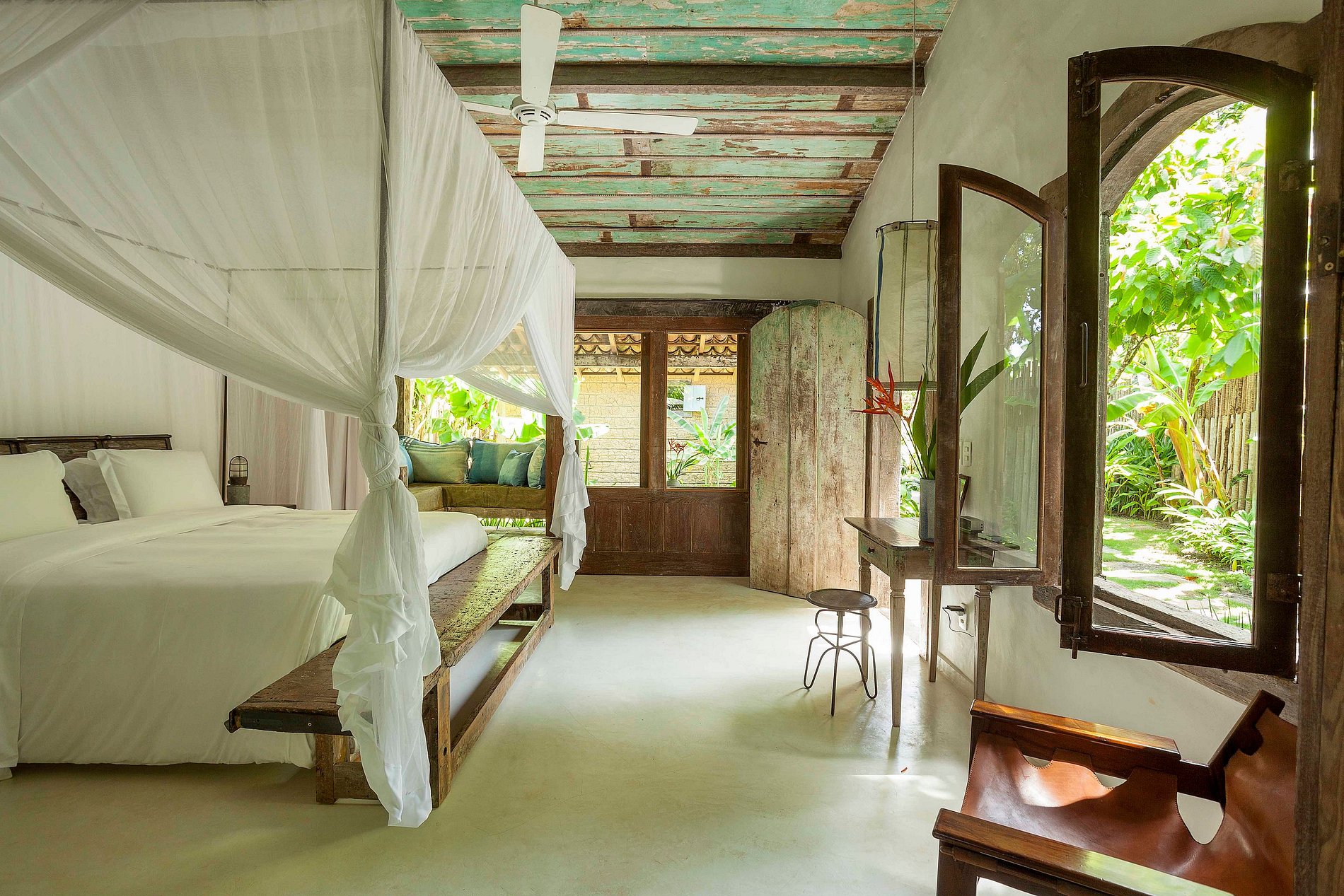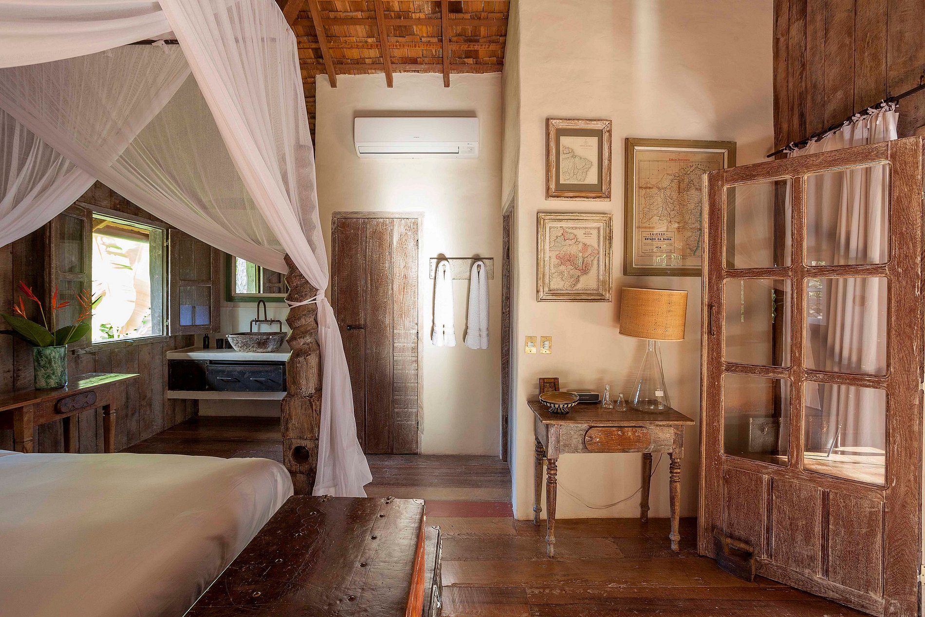 Située juste en face de l’église centenaire de São João Batista, au cœur du célèbre Quadrado historique, le jardin tropical de 1400 m² de forêt atlantique native, parsemé d'arbres, abrite trois suites construites dans des structures séparées garantissant une intimité maximale. Chaque suite reflète une étape différente du passé architectural de Bahia : une en torchis, une en maçonnerie, et la suite principale est suspendue dans le jardin, entièrement construite à partir de bois recyclé provenant d’une ancienne ferme bahianaise.
