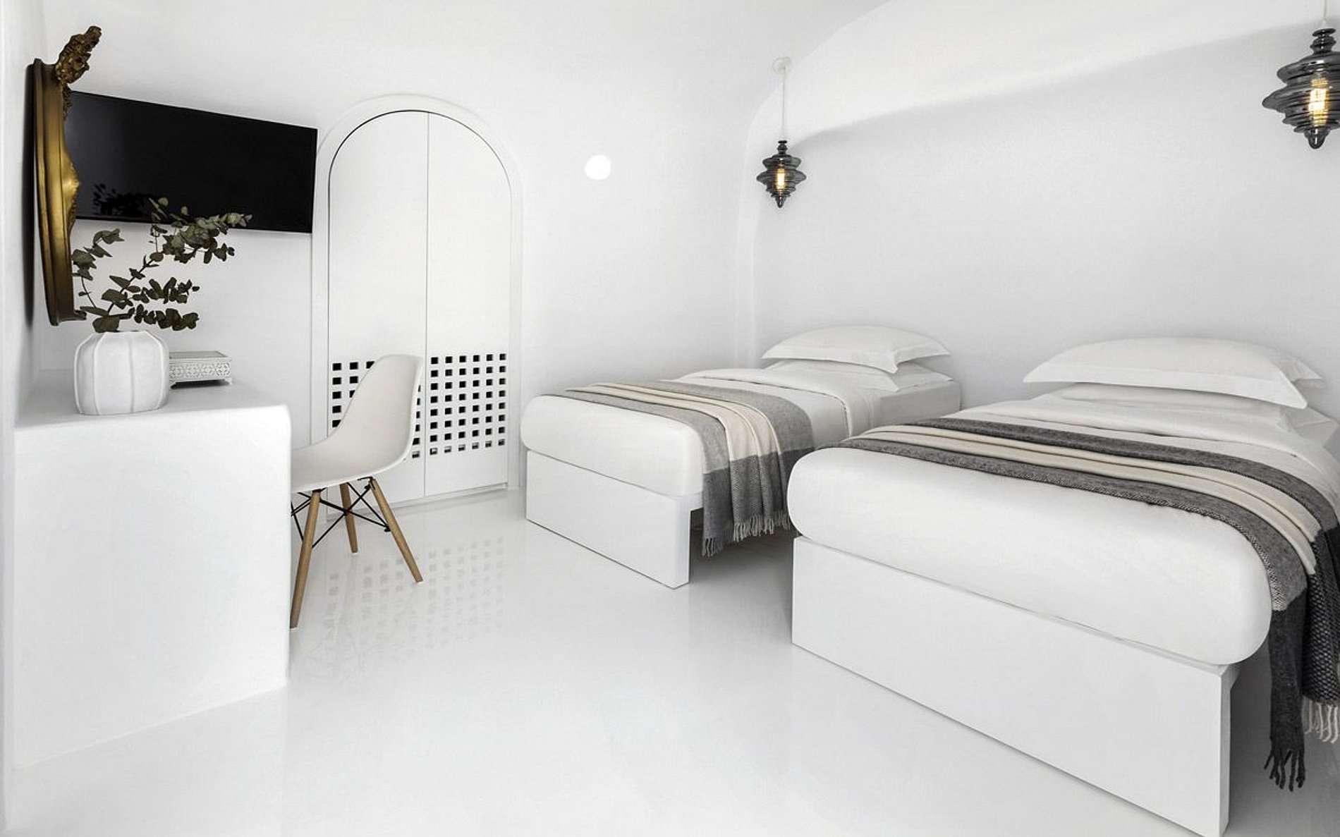 A recém-reformada Villa Eros está localizada em Imerovigli, apenas a 2 km. da capital de Santorini, Fira, com vista para o mar Egeu. A piscina privativa é aquecida e está situada em um amplo deck e a casa também possui uma jacuzzi. A decoração lembra as típicas villas "caverna" gregas. São dois andares independentes, o nível inferior tem quartos queen size com banheiro e hospeda até cinco pessoas, enquanto o nível superior tem três suítes e hospeda confortavelmente seis pessoas. Os hóspedes podem alugar a villa como um todo, ou os dois níveis estão disponíveis para locação separadamente.