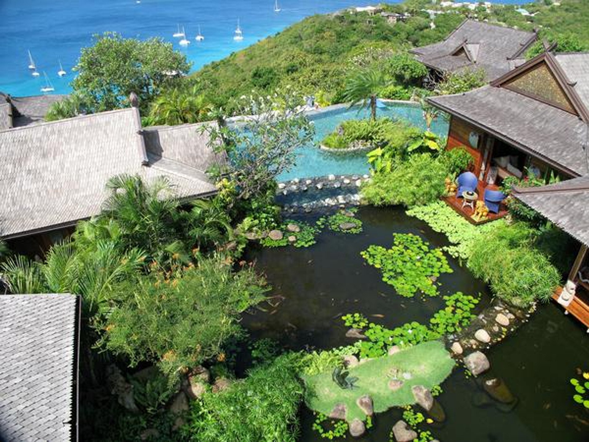 Construído em torno de uma lago de carpas desnivelado, cachoeiras e uma piscina de borda infinita - que aparentemente liga a propriedade ao Mar do Caribe - a propriedade oferece aos hóspedes o uso exclusivo de cinco espaçosos suítes, cada uma com sua própria varanda privada que leva direto à piscina. A propriedade também oferece várias salas de convivência impressionantes, um pavilhão de jantar, sala de jogos, estudo, bem como uma série de decks privados que são perfeitos para banhos de sol, restaurantes ou relaxar.