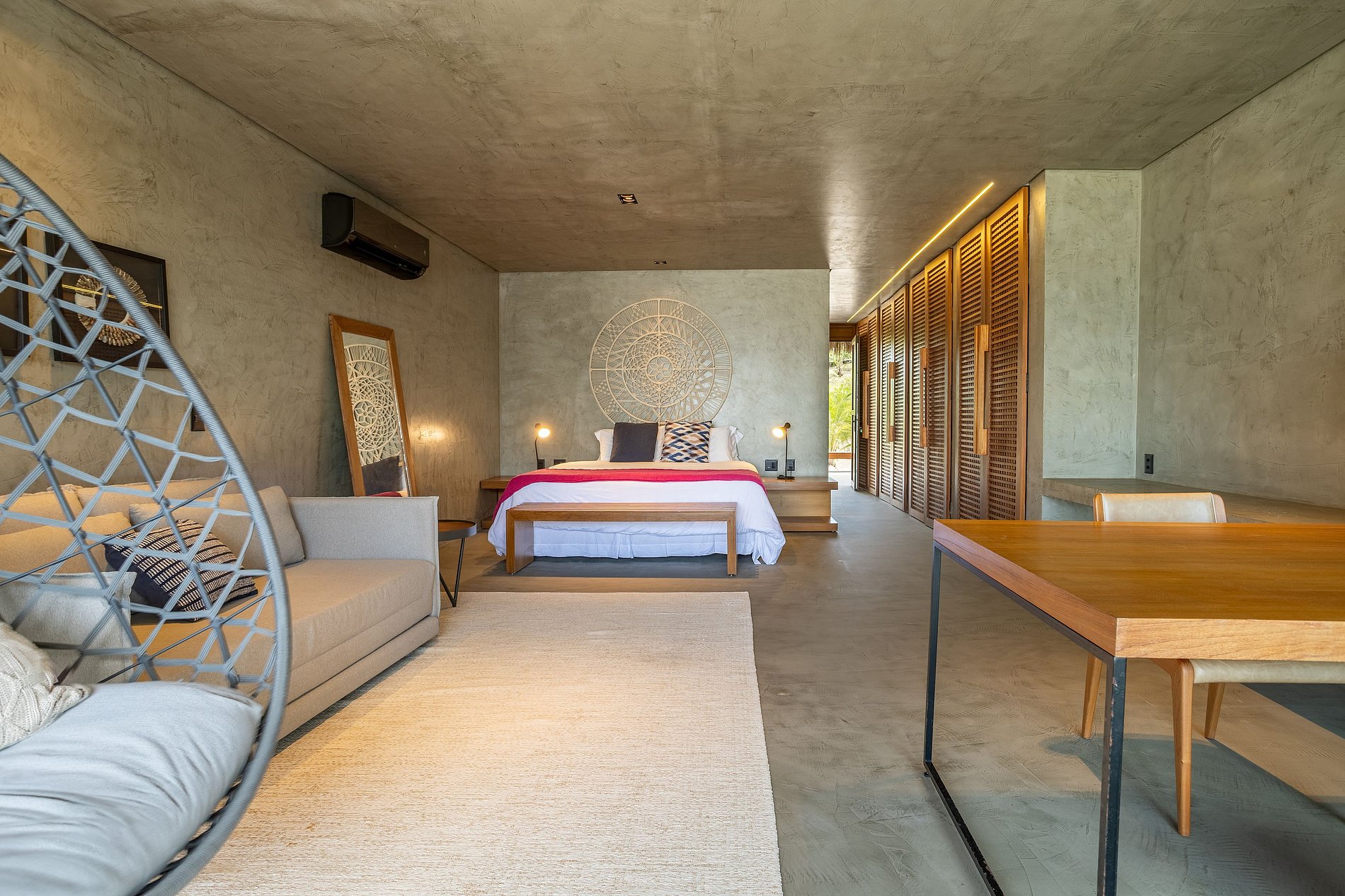 Possui 5 suítes, todas com vista mar. A suíte máster possui cama super king, closet e banheira. As demais 4 suítes possuem cama super king, mais um sofá cama queen que pode acomodar crianças/adolescentes a partir de 10 anos, sendo uma suíte em um bangalô externo.