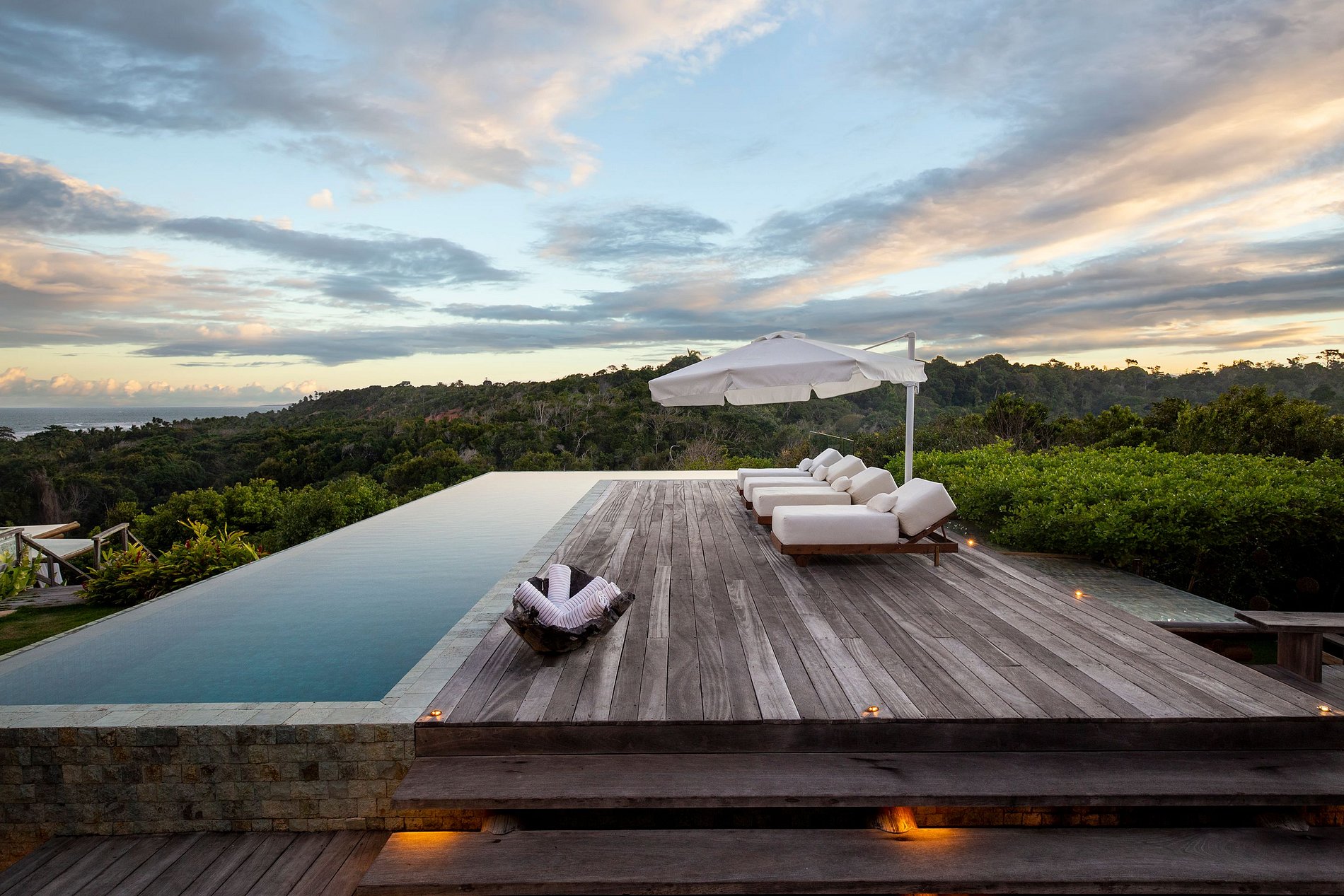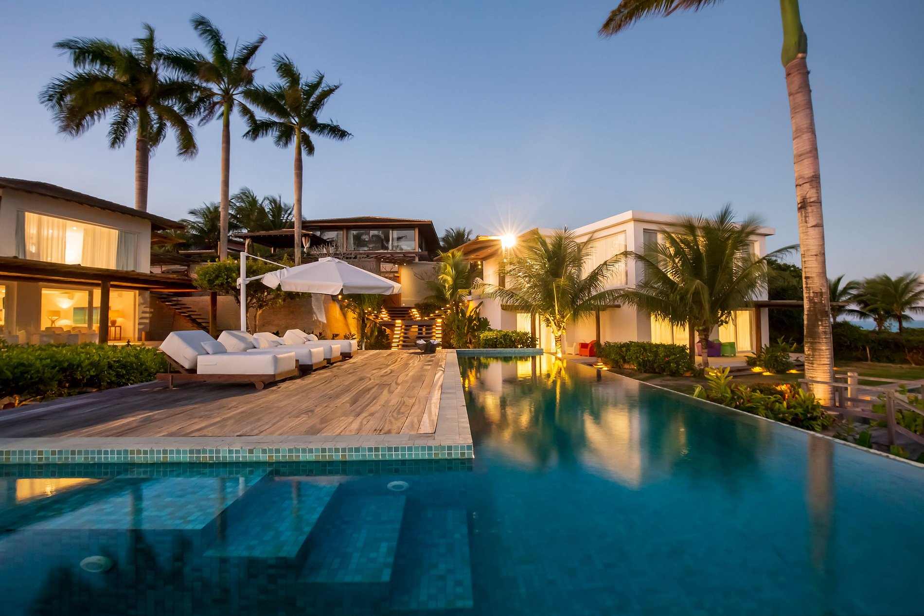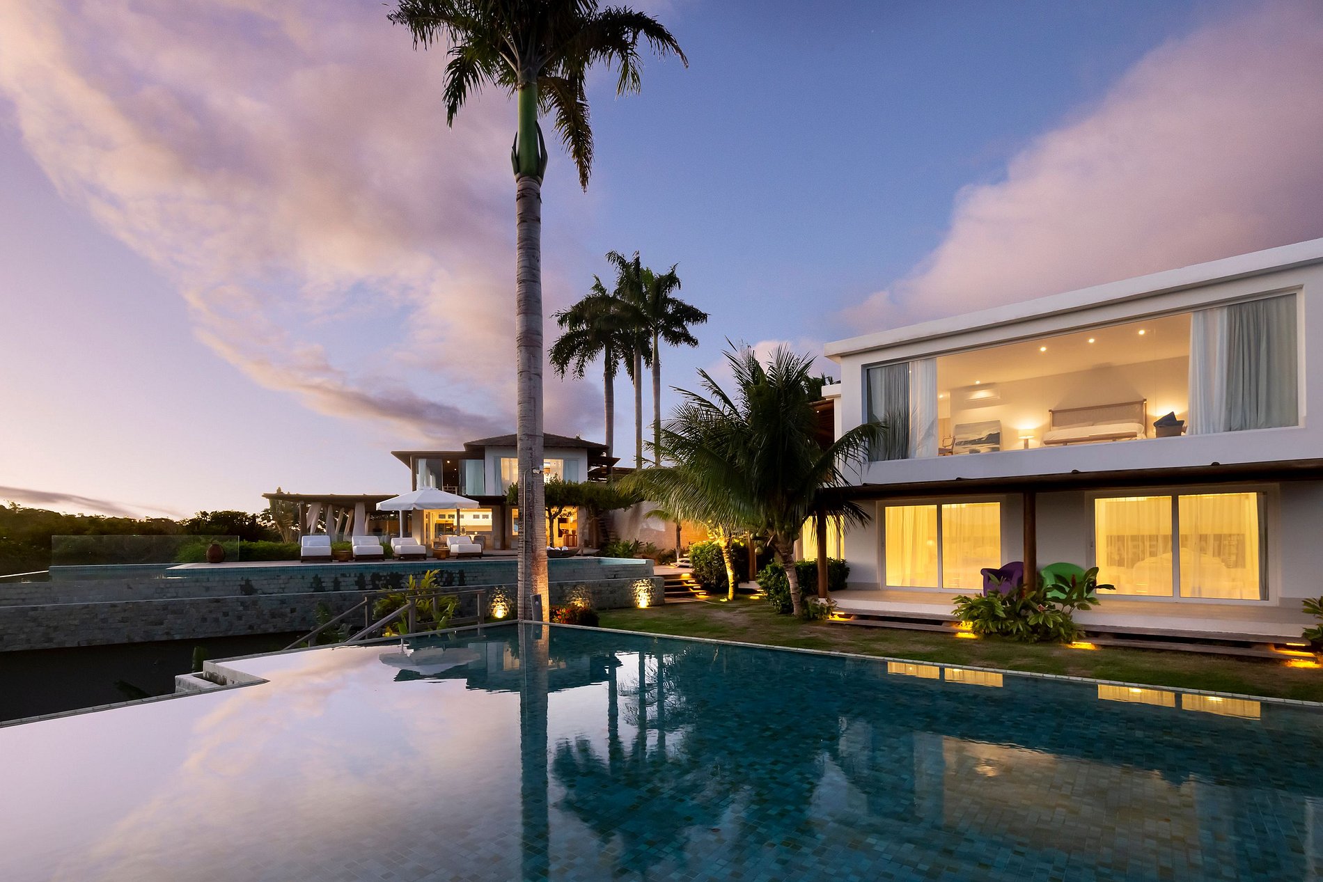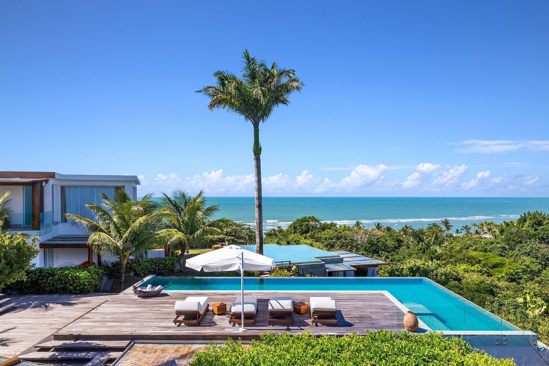 Vila spectaculaire et exclusive de 1 100 m², elle dispose de 2 suites master avec lit king size, dressing et minibar, vue sur la mer et les falaises, 3 suites avec lit king, minibar et dressing avec vue sur la mer, et 2 suites avec vue privilégiée sur la forêt native, avec terrasse intégrée et vue sur la mer. Elle est également pourvue d’un espace gastronomique complet avec barbecue, four à pizza et grande table en bois massif pouvant accueillir jusqu’à 16 personnes, d’un sauna sec et d’une salle de massage. La cuisine est équipée d’une cave à vin de 96 bouteilles, d’une tireuse à bière, de congélateurs verticaux et horizontaux, d’une machine à glaçons et la cuisinière est spécialisée dans la cuisine bahianaise.