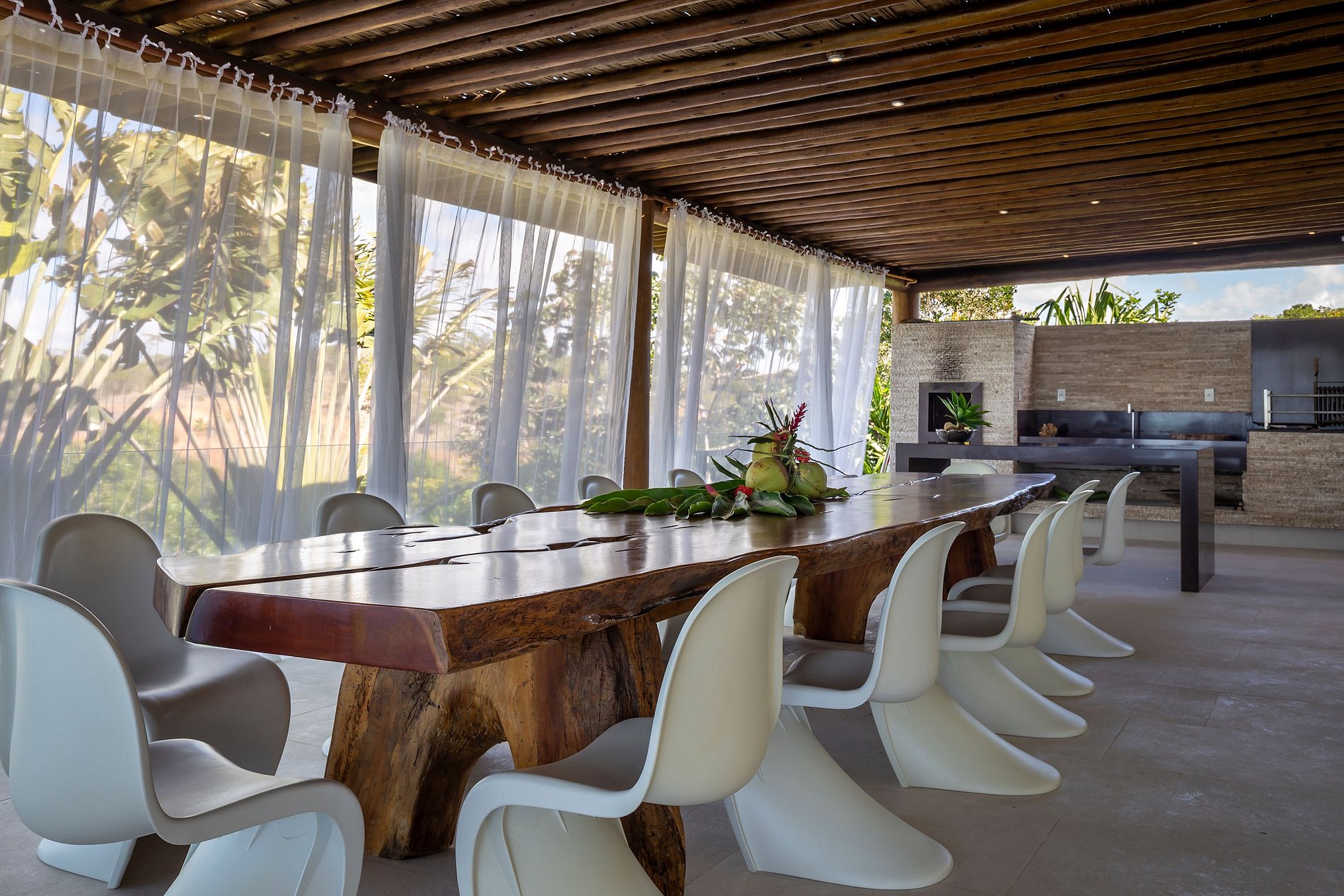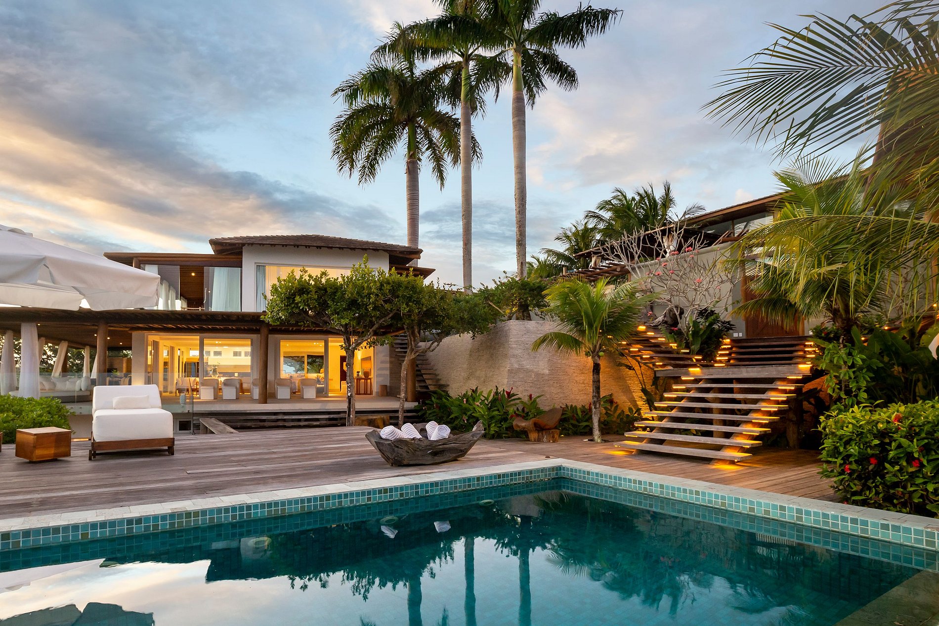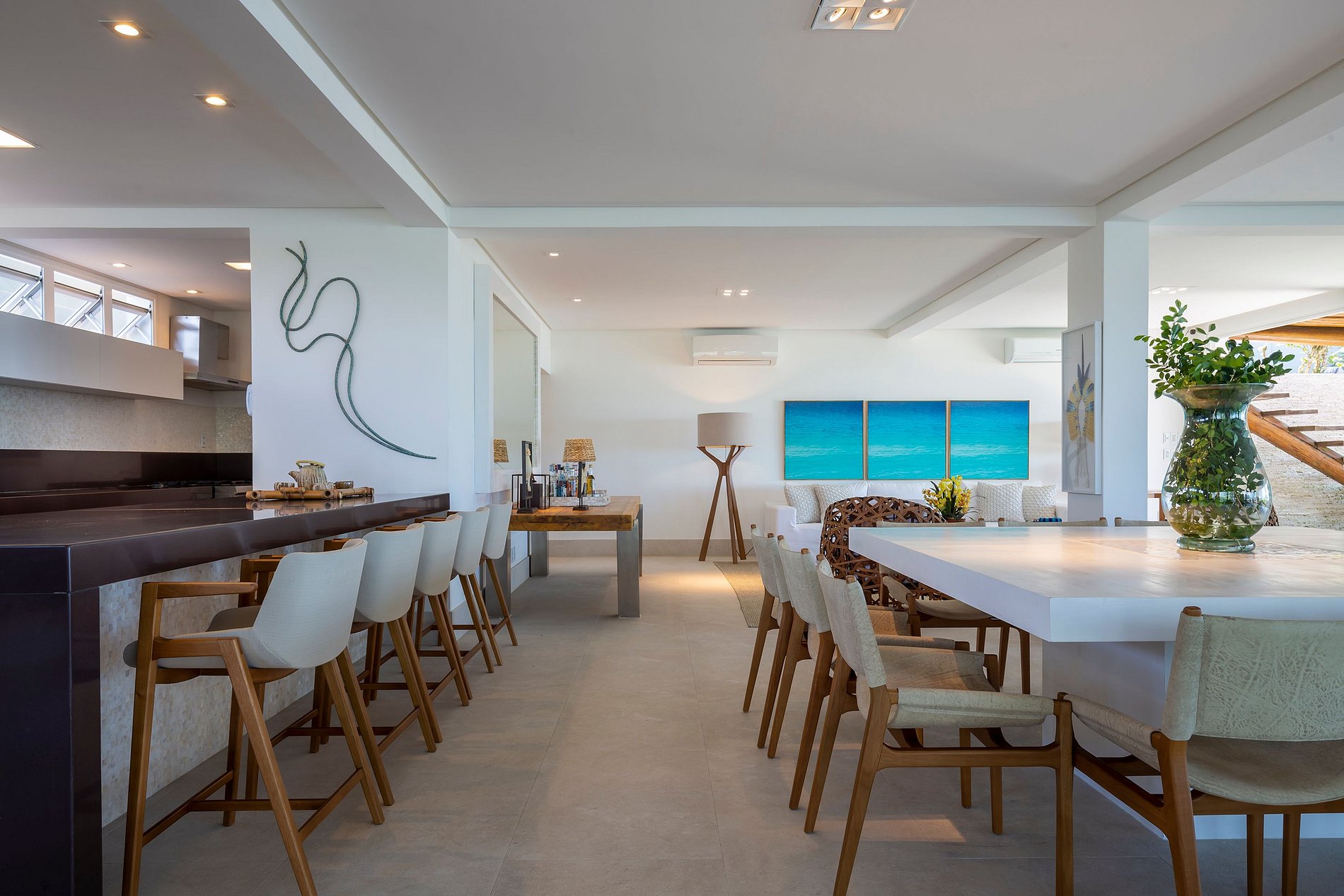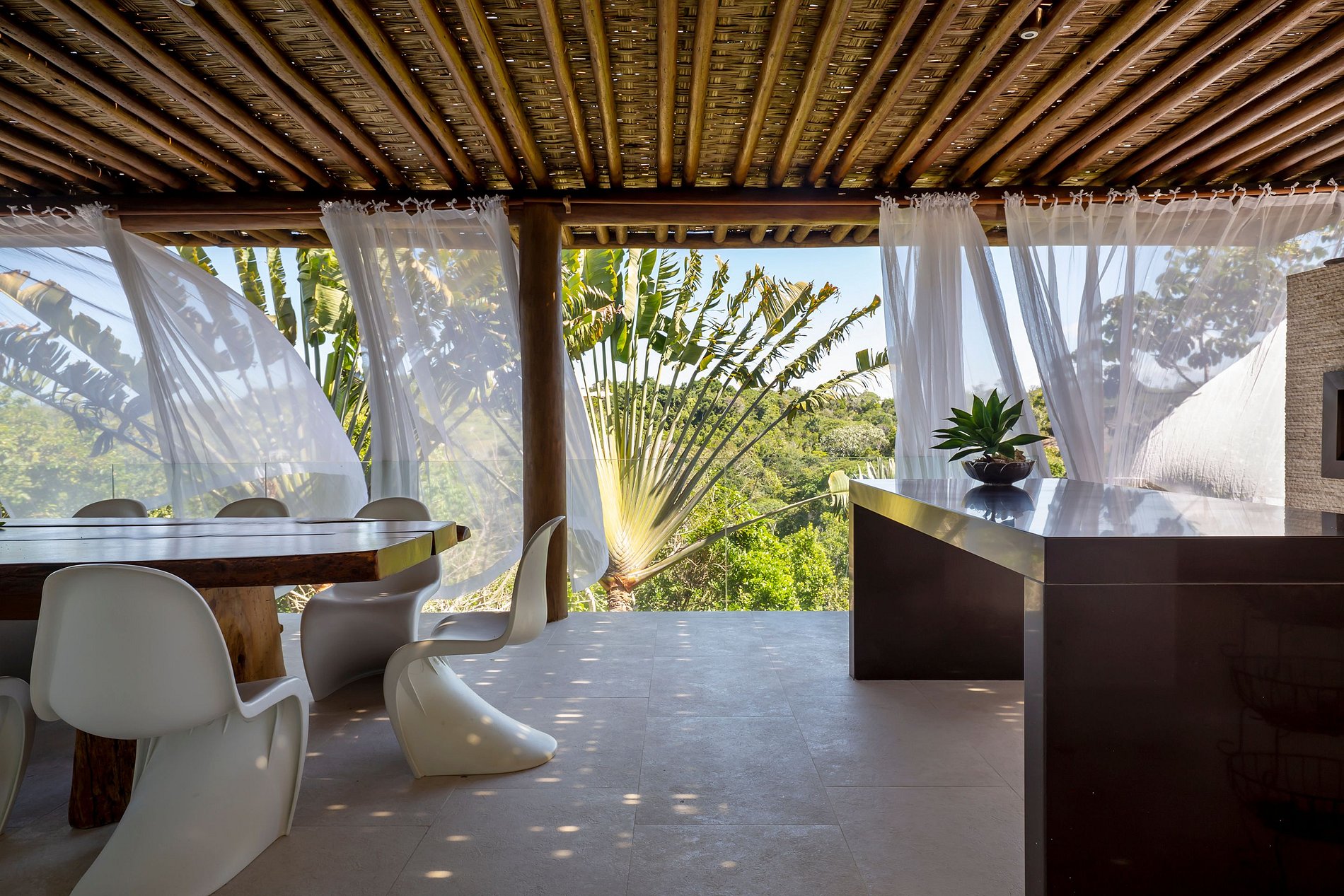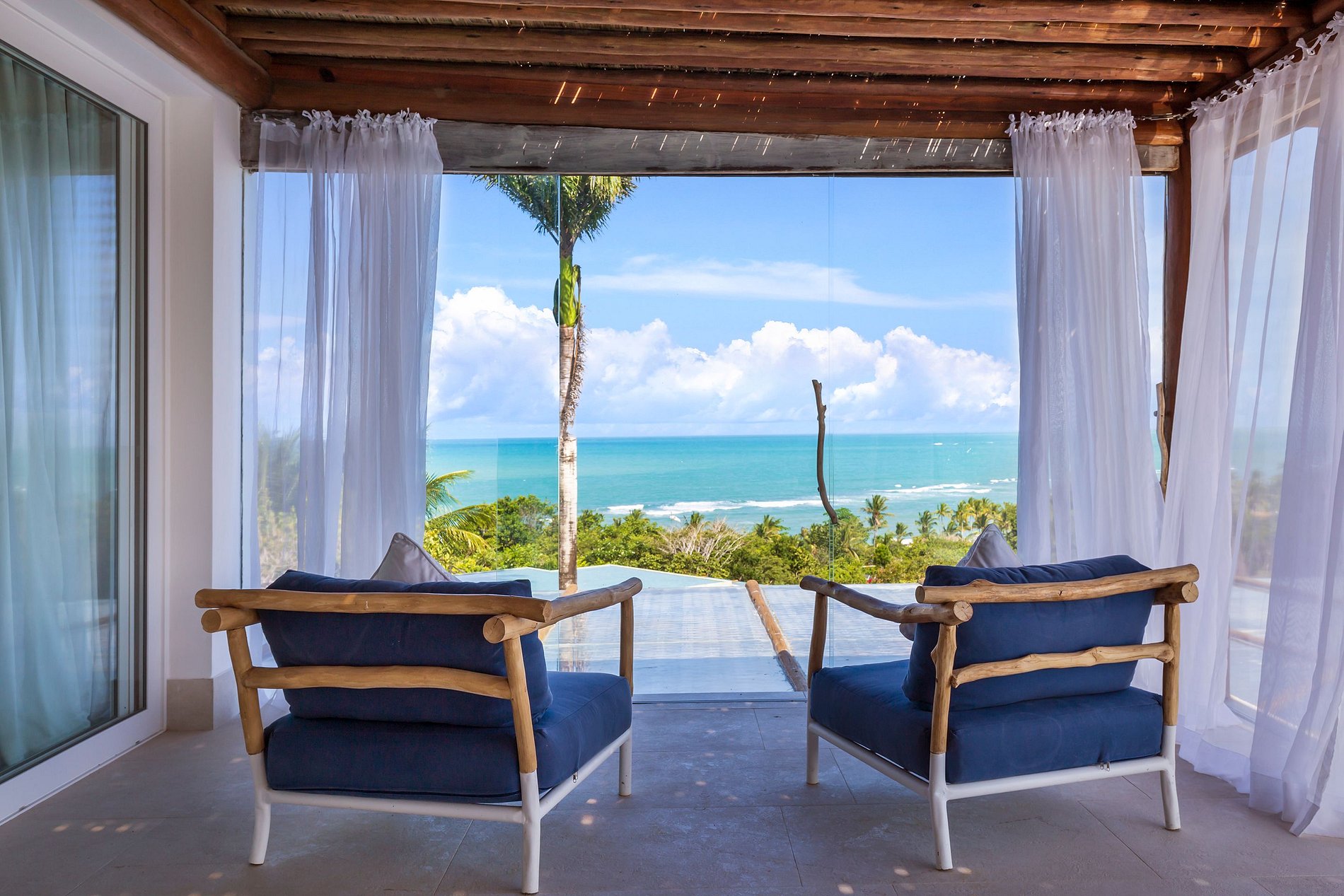 Vila spectaculaire et exclusive de 1 100 m², elle dispose de 2 suites master avec lit king size, dressing et minibar, vue sur la mer et les falaises, 3 suites avec lit king, minibar et dressing avec vue sur la mer, et 2 suites avec vue privilégiée sur la forêt native, avec terrasse intégrée et vue sur la mer. Elle est également pourvue d’un espace gastronomique complet avec barbecue, four à pizza et grande table en bois massif pouvant accueillir jusqu’à 16 personnes, d’un sauna sec et d’une salle de massage. La cuisine est équipée d’une cave à vin de 96 bouteilles, d’une tireuse à bière, de congélateurs verticaux et horizontaux, d’une machine à glaçons et la cuisinière est spécialisée dans la cuisine bahianaise.