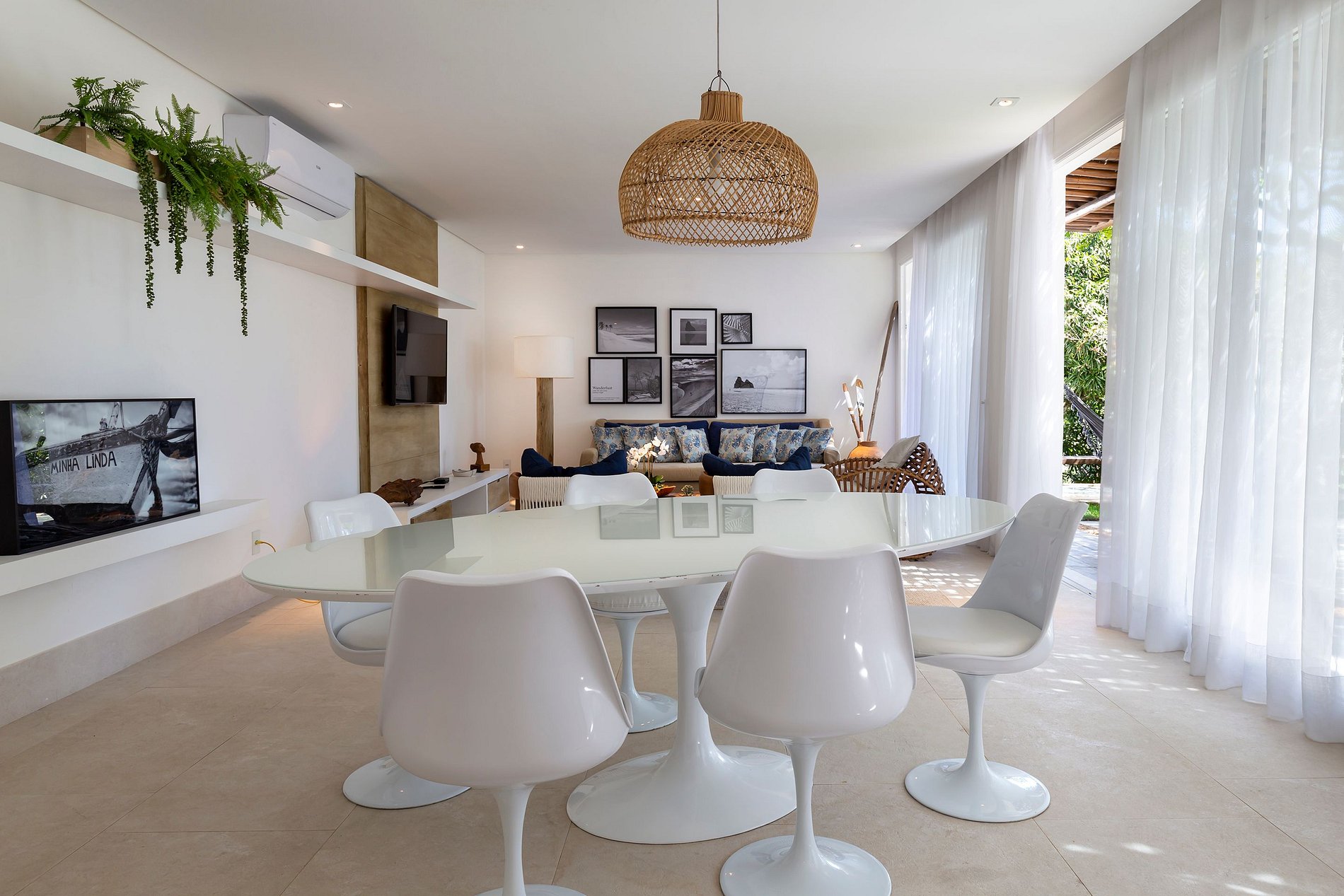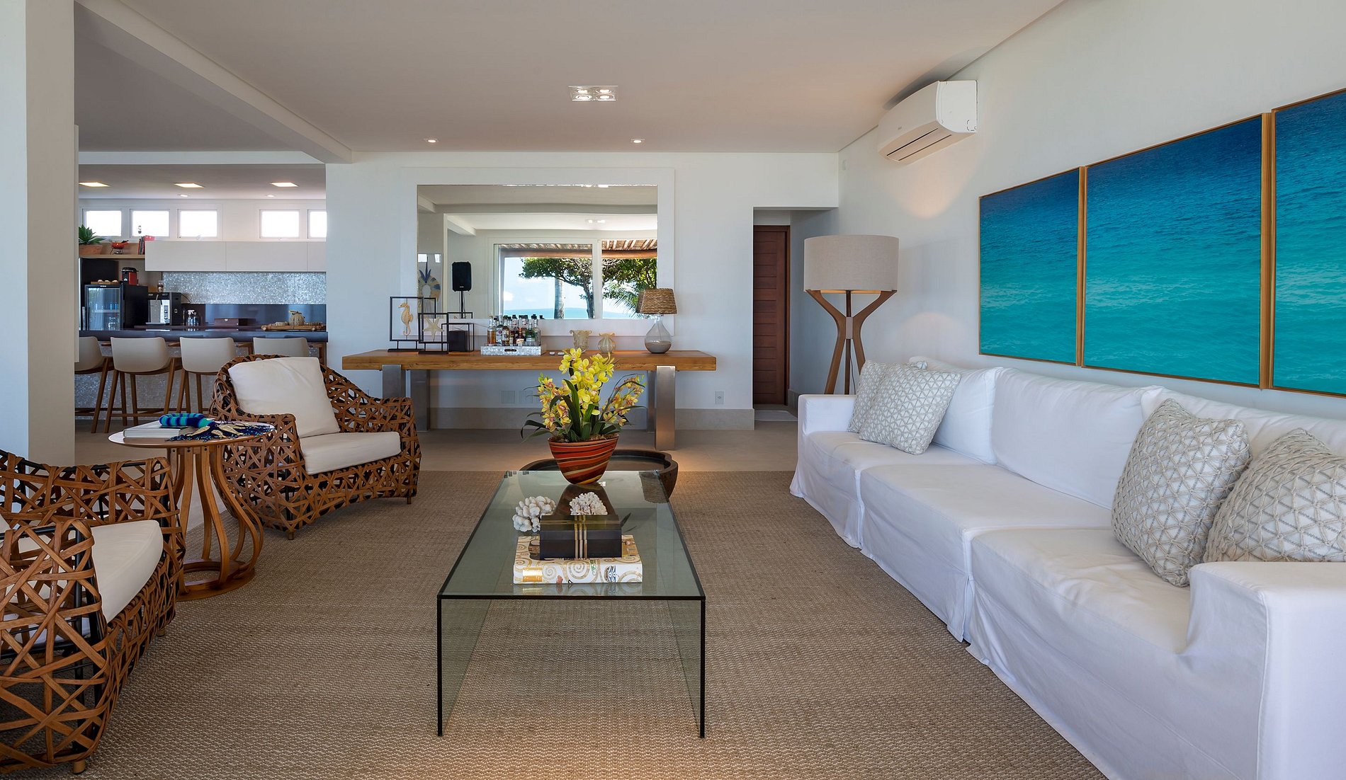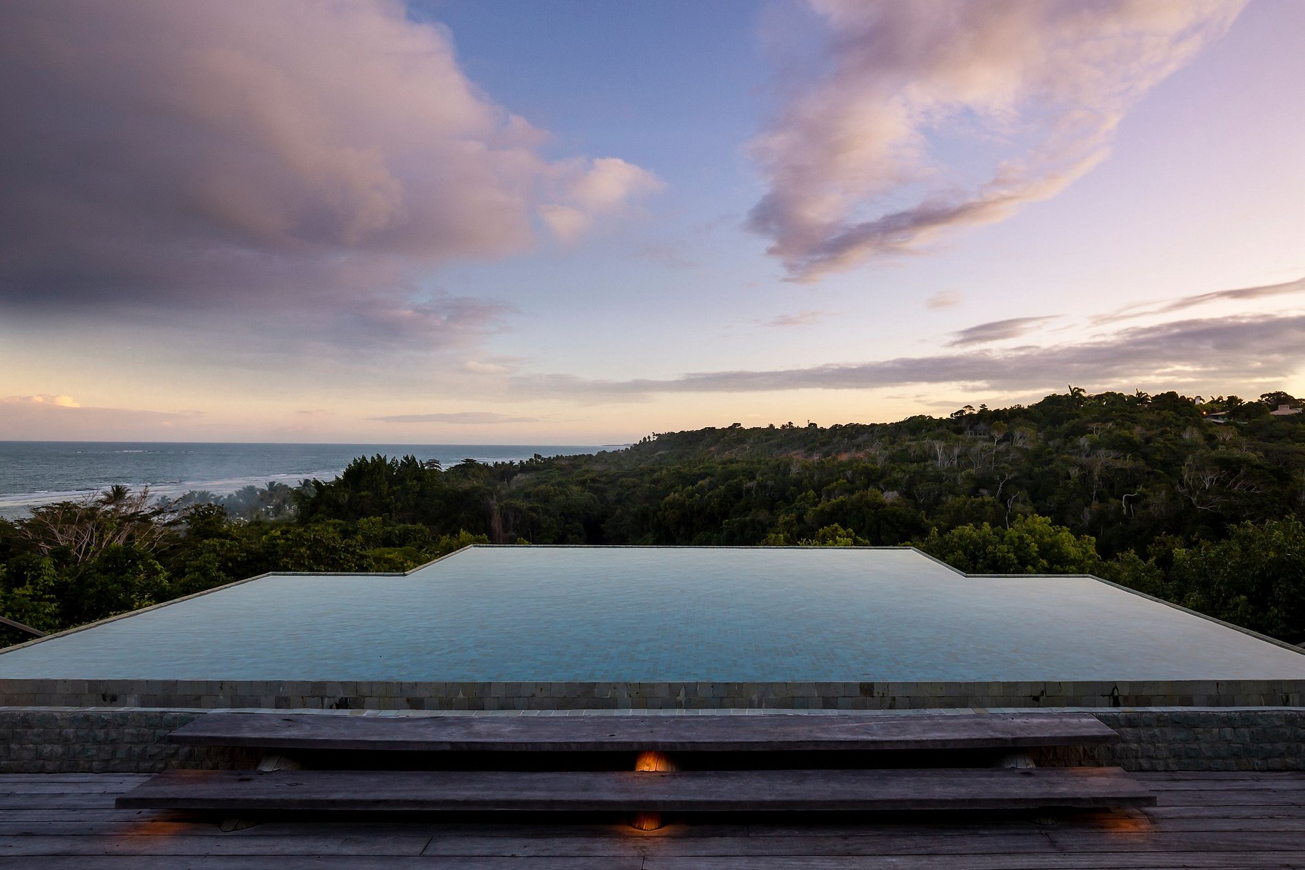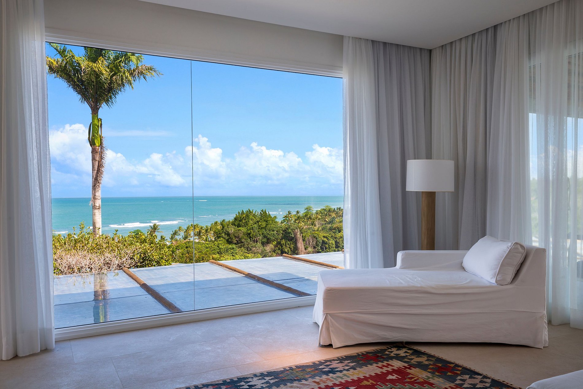 Vila spectaculaire et exclusive de 1 100 m², elle dispose de 2 suites master avec lit king size, dressing et minibar, vue sur la mer et les falaises, 3 suites avec lit king, minibar et dressing avec vue sur la mer, et 2 suites avec vue privilégiée sur la forêt native, avec terrasse intégrée et vue sur la mer. Elle est également pourvue d’un espace gastronomique complet avec barbecue, four à pizza et grande table en bois massif pouvant accueillir jusqu’à 16 personnes, d’un sauna sec et d’une salle de massage. La cuisine est équipée d’une cave à vin de 96 bouteilles, d’une tireuse à bière, de congélateurs verticaux et horizontaux, d’une machine à glaçons et la cuisinière est spécialisée dans la cuisine bahianaise.