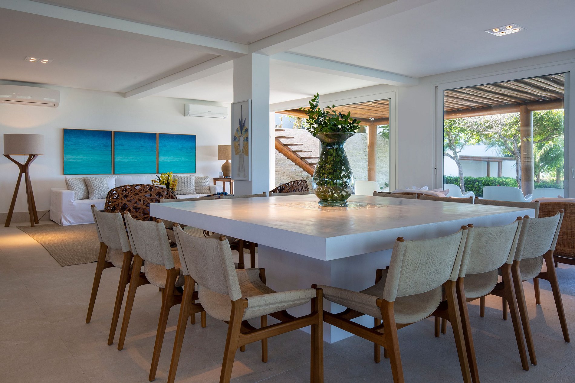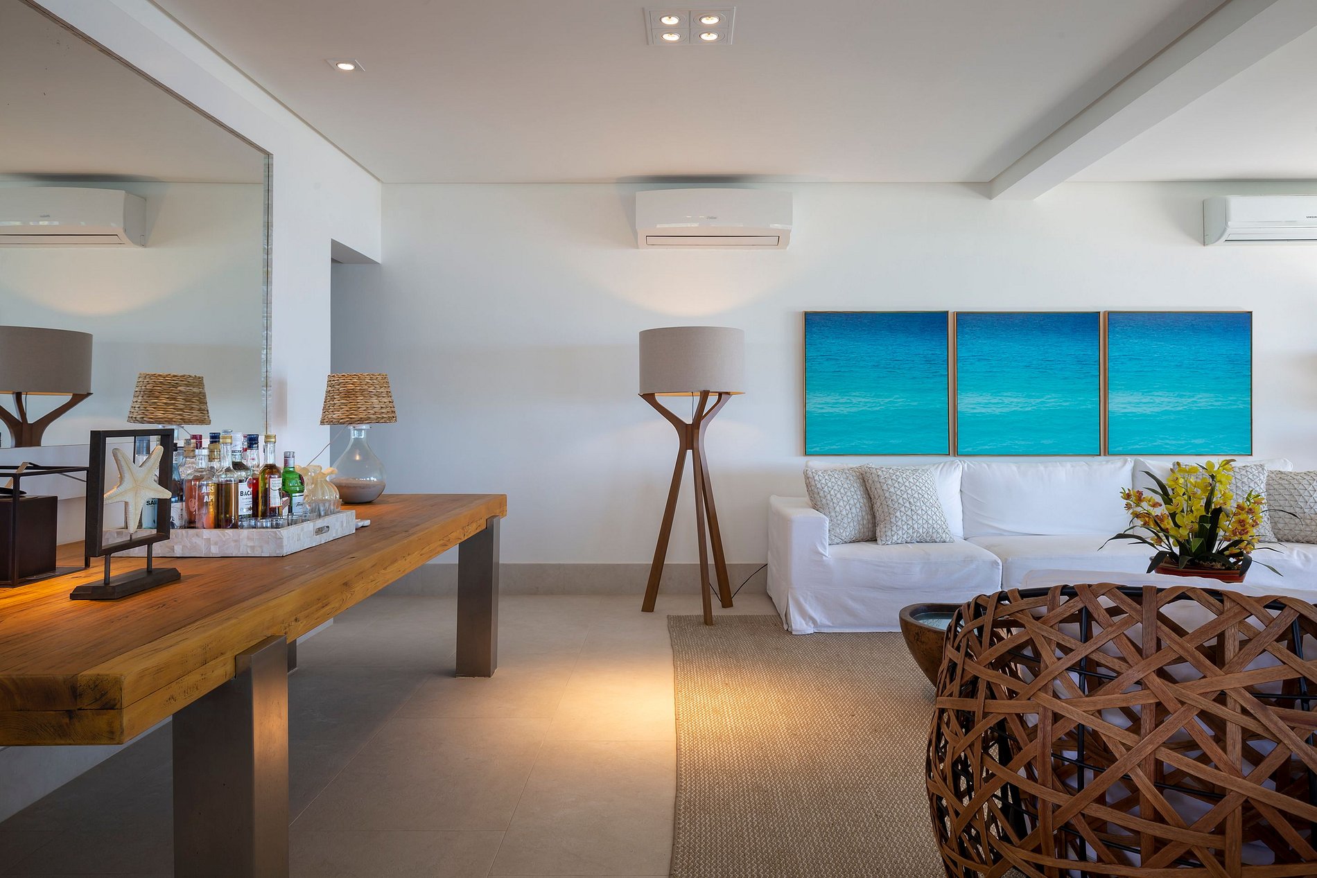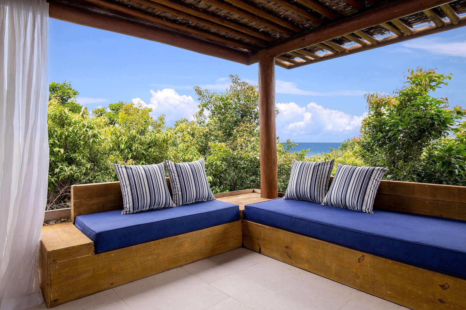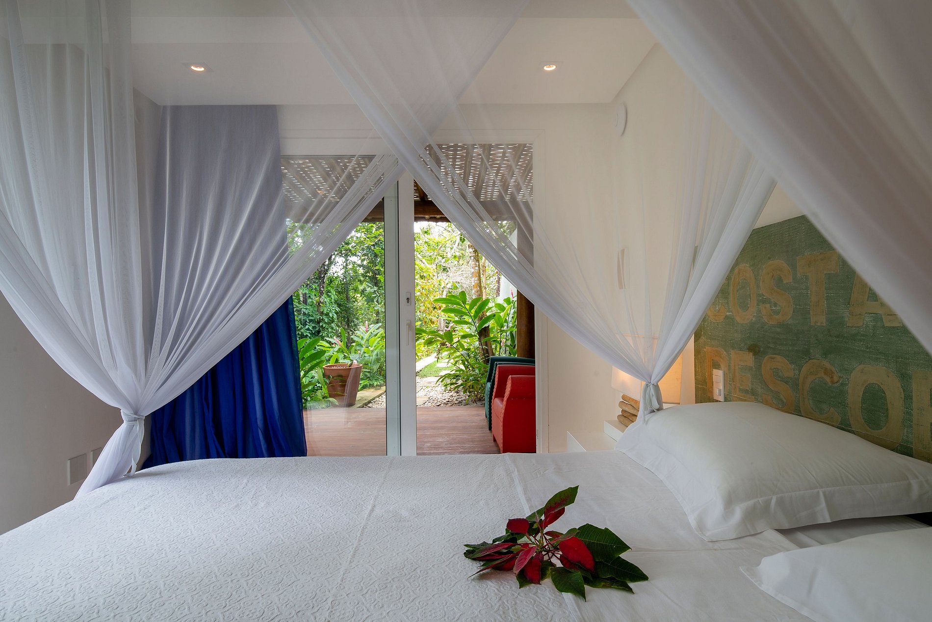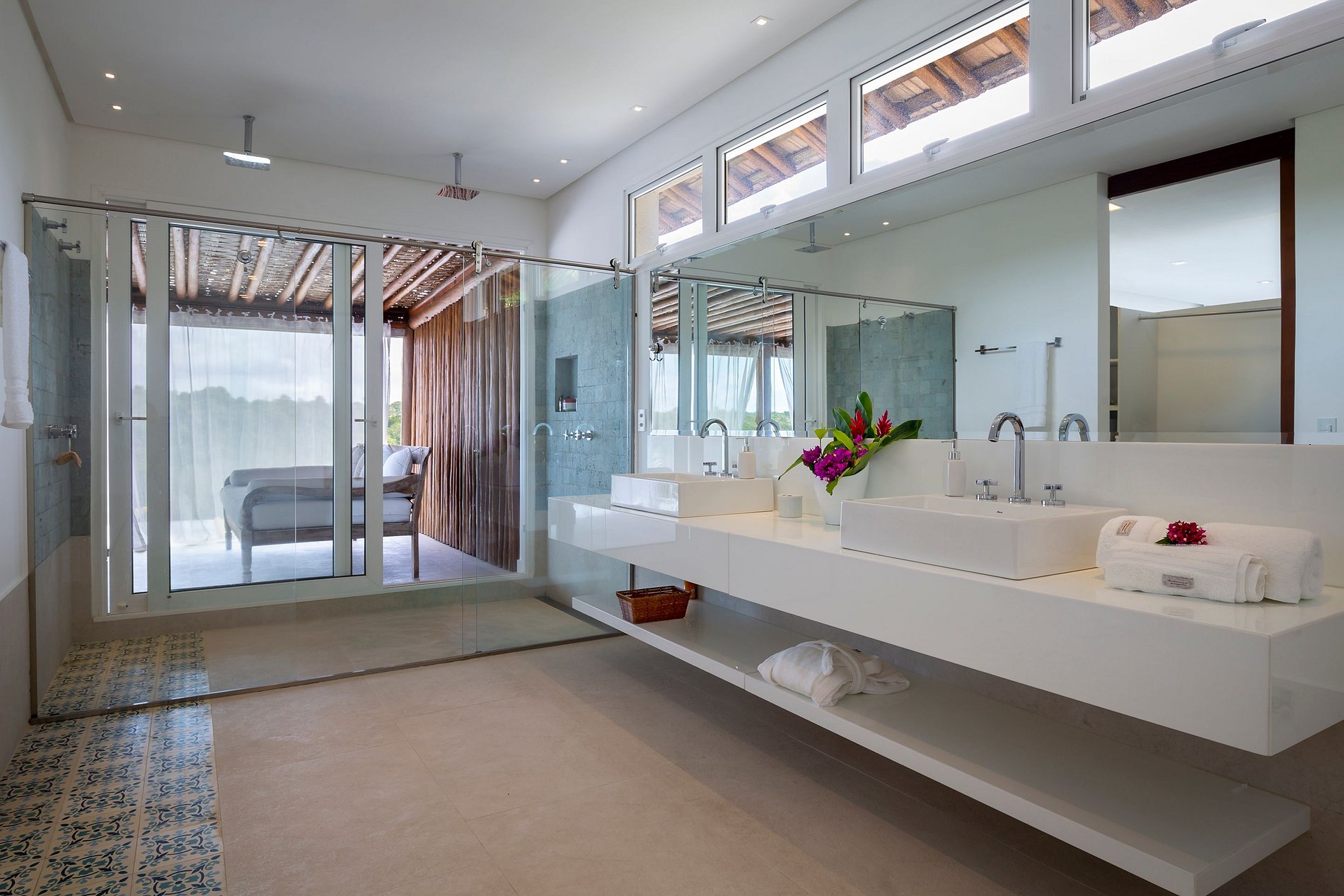 Vila spectaculaire et exclusive de 1 100 m², elle dispose de 2 suites master avec lit king size, dressing et minibar, vue sur la mer et les falaises, 3 suites avec lit king, minibar et dressing avec vue sur la mer, et 2 suites avec vue privilégiée sur la forêt native, avec terrasse intégrée et vue sur la mer. Elle est également pourvue d’un espace gastronomique complet avec barbecue, four à pizza et grande table en bois massif pouvant accueillir jusqu’à 16 personnes, d’un sauna sec et d’une salle de massage. La cuisine est équipée d’une cave à vin de 96 bouteilles, d’une tireuse à bière, de congélateurs verticaux et horizontaux, d’une machine à glaçons et la cuisinière est spécialisée dans la cuisine bahianaise.