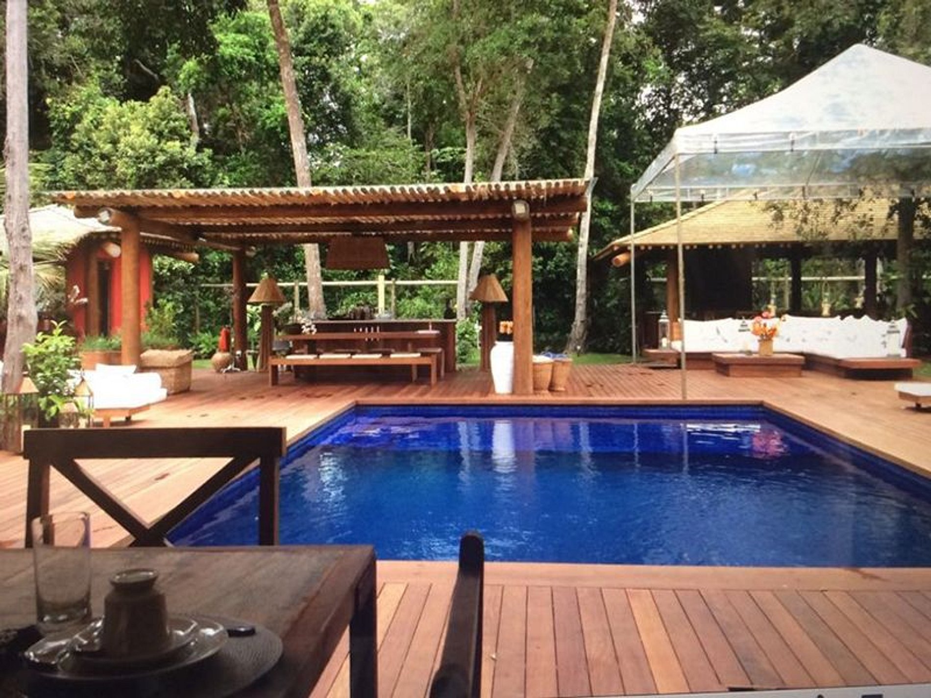 Oferece bar, sauna, cama de massagem, sofá lounge, rede na sombra da árvore, nos fundos da área o espaço gourmet com fogão industrial, forno a lenha de pizza, churrasqueira e máquina de gelo.