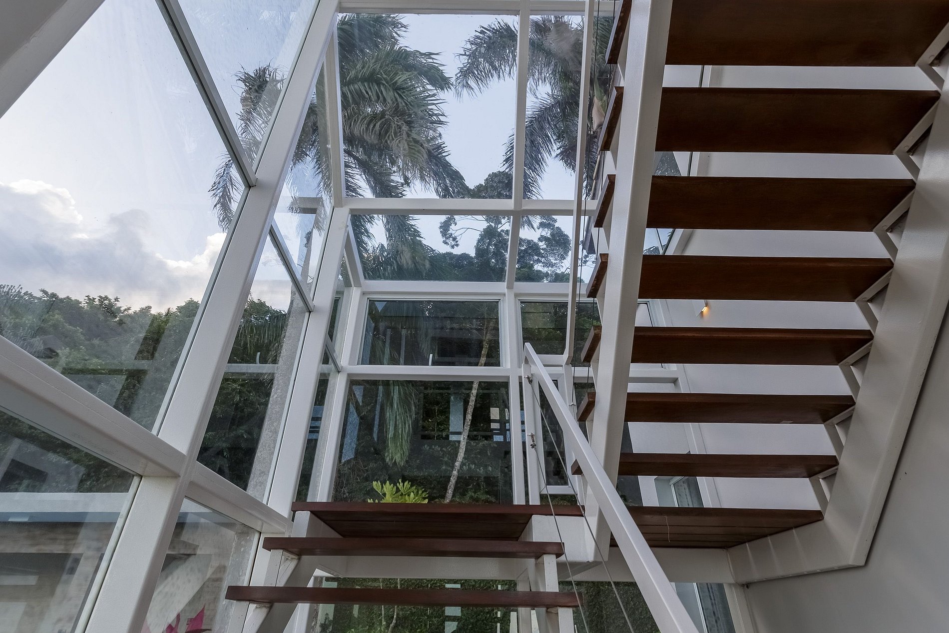 Ter o mar como companhia constante, as montanhas, a floresta e o céu azul deslumbrante e o mais lindo do mundo, tornam esta casa numa quimera. Abusa dos vidros para reverenciar este cenário.