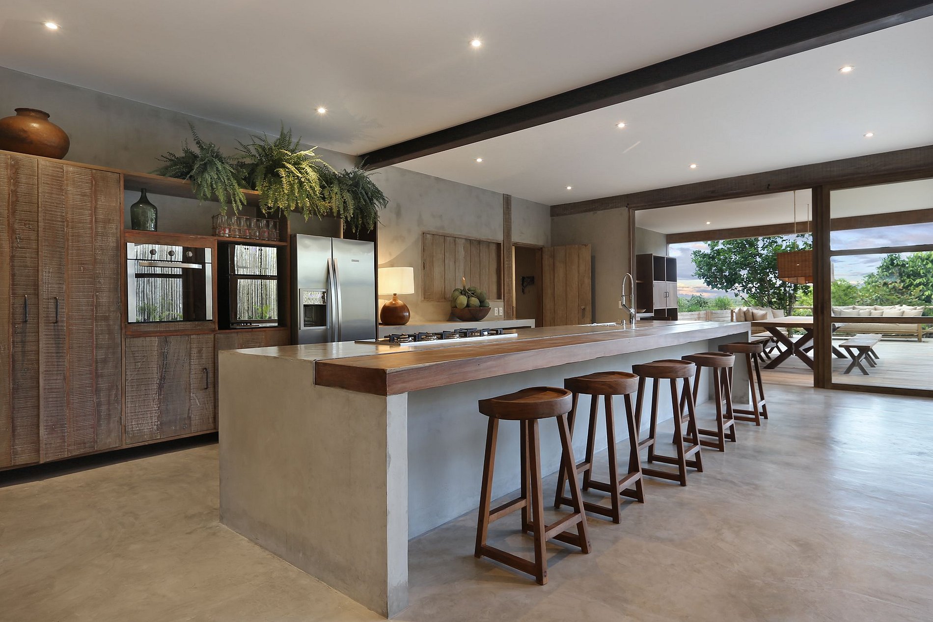 Cozinha gourmet com geladeira duplex, máquina Nespresso, adega, pia, amplo balcão e bancos, ideal para preparar drinks e petiscos.