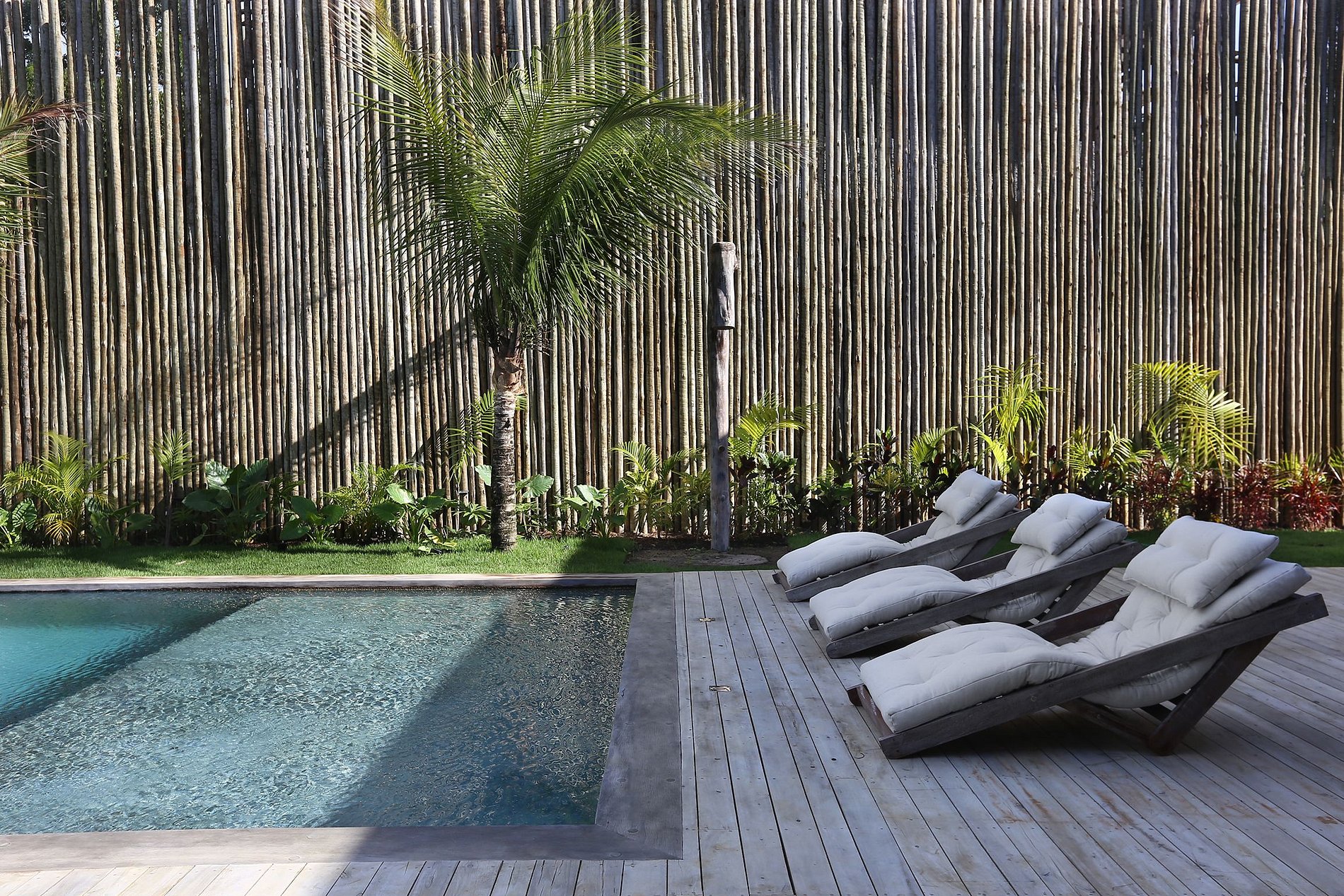 Área externa com piscina convidativa, ducha refrescante, espreguiçadeiras e toalhas para relaxar ao sol.