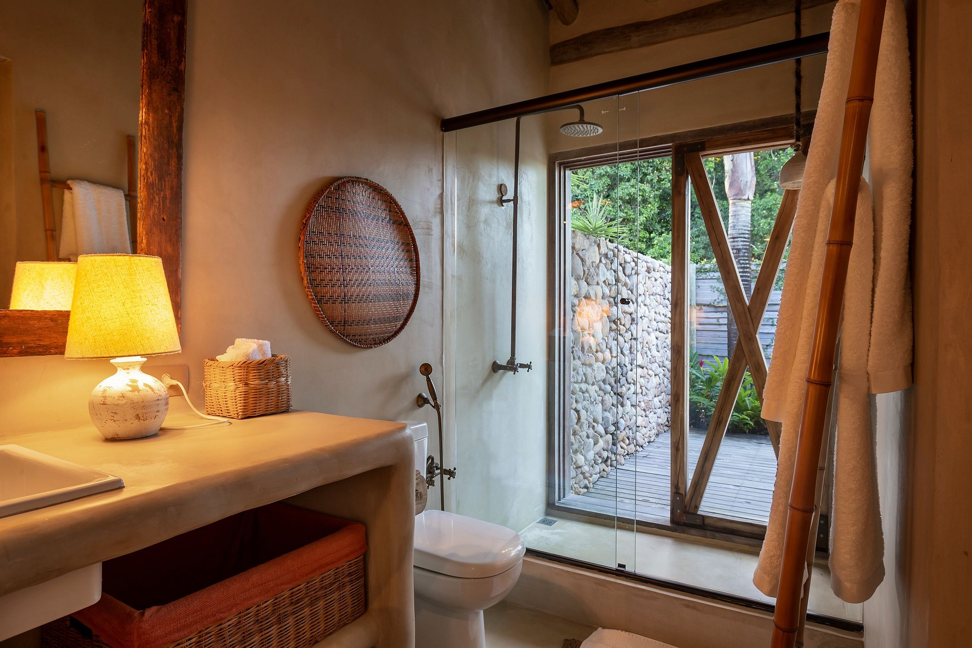 - Área externa com piscina, ducha, toalhas.