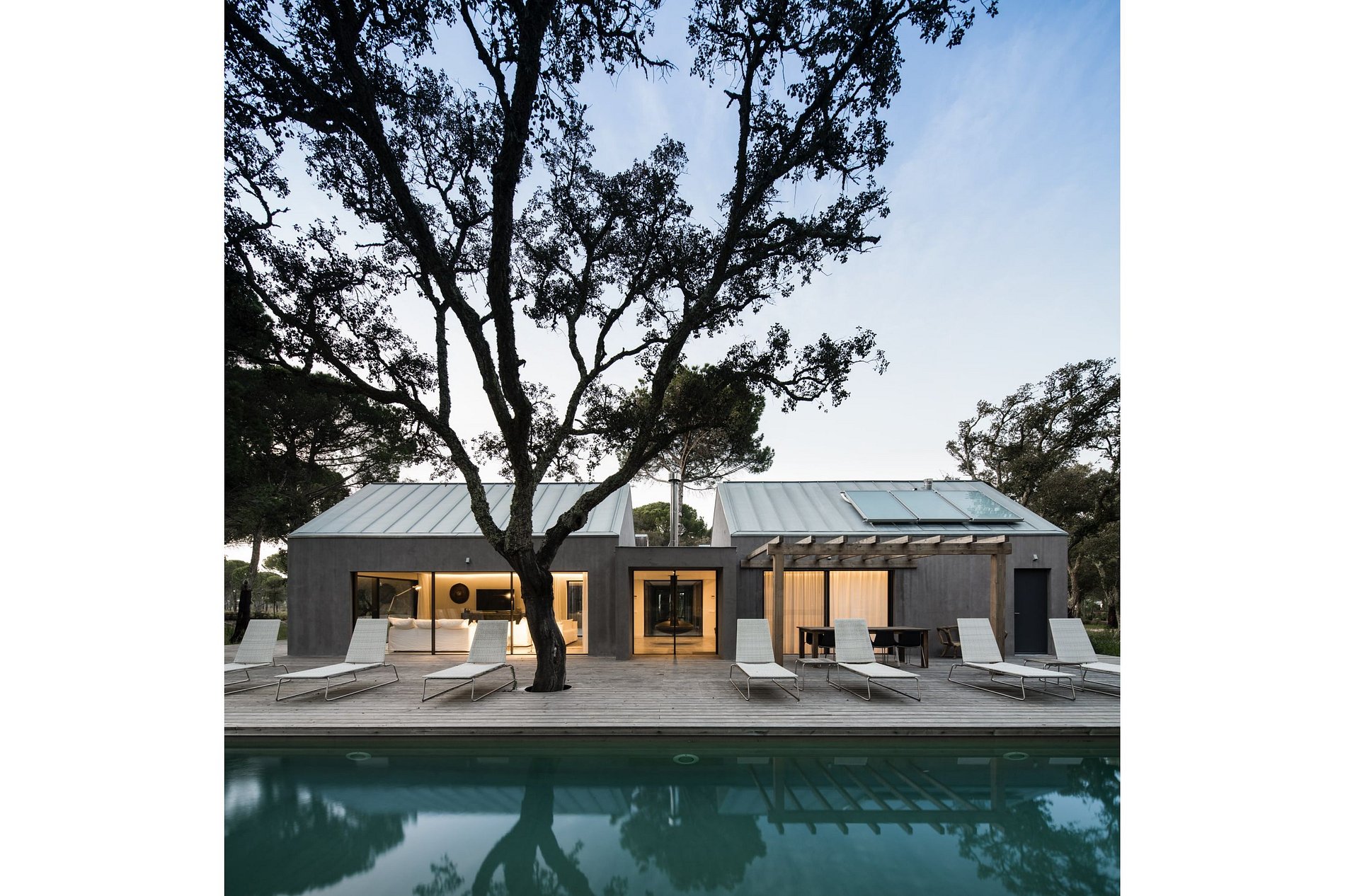 Uma visão contemporânea das tradicionais “cabanas” da Comporta, todas incluem uma ampla sala de estar com cozinha totalmente equipada e casa de banho para visitas, quartos com casas de banho privadas, incluindo grandes banheiras e chuveiros, lareiras suspensas, piscina privada e vários decks.