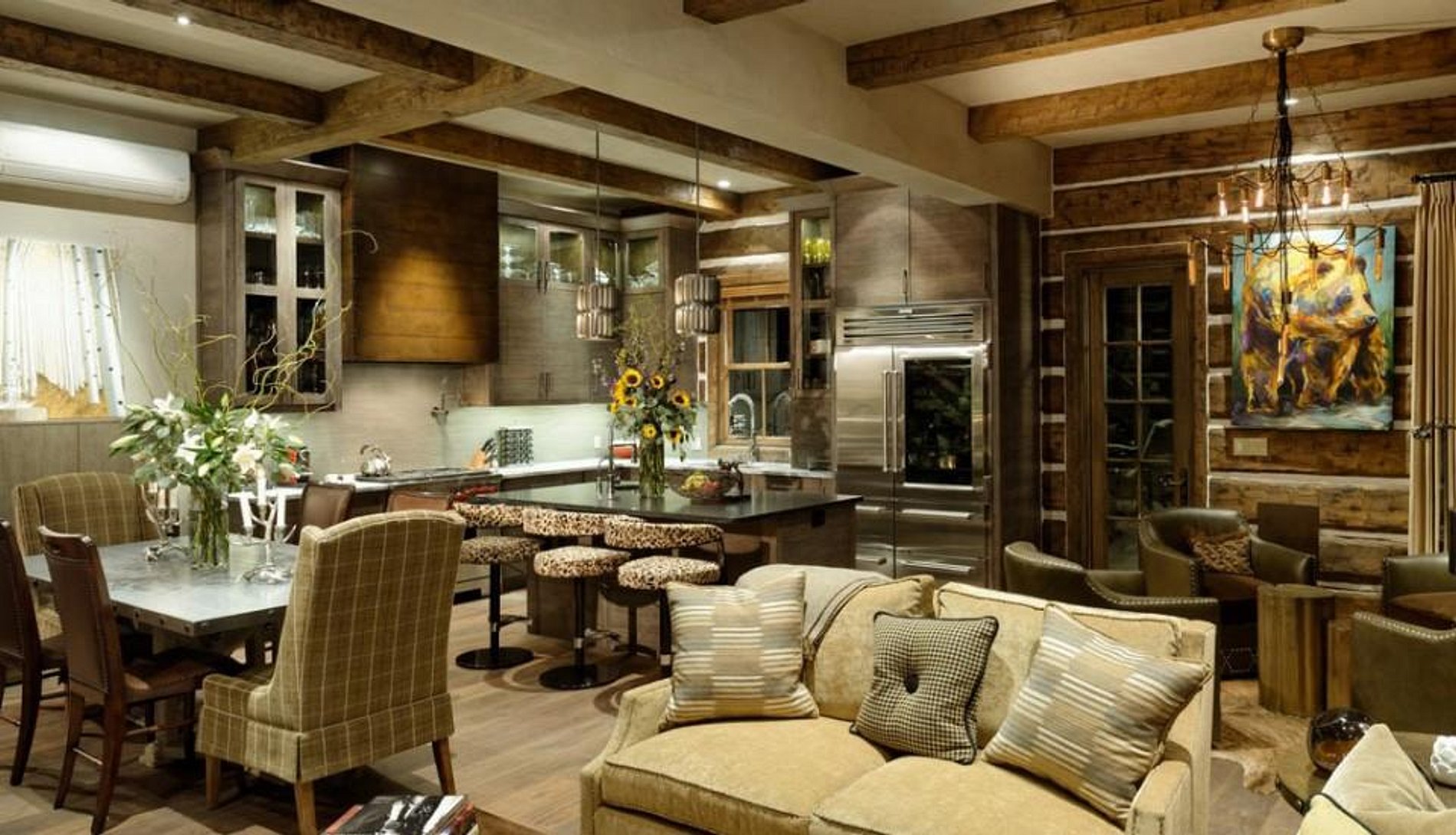 A sala de estar e de jantar de plano aberto e cozinha abrem para um deck de pedra externo com vista para o rio Roaring Fork.