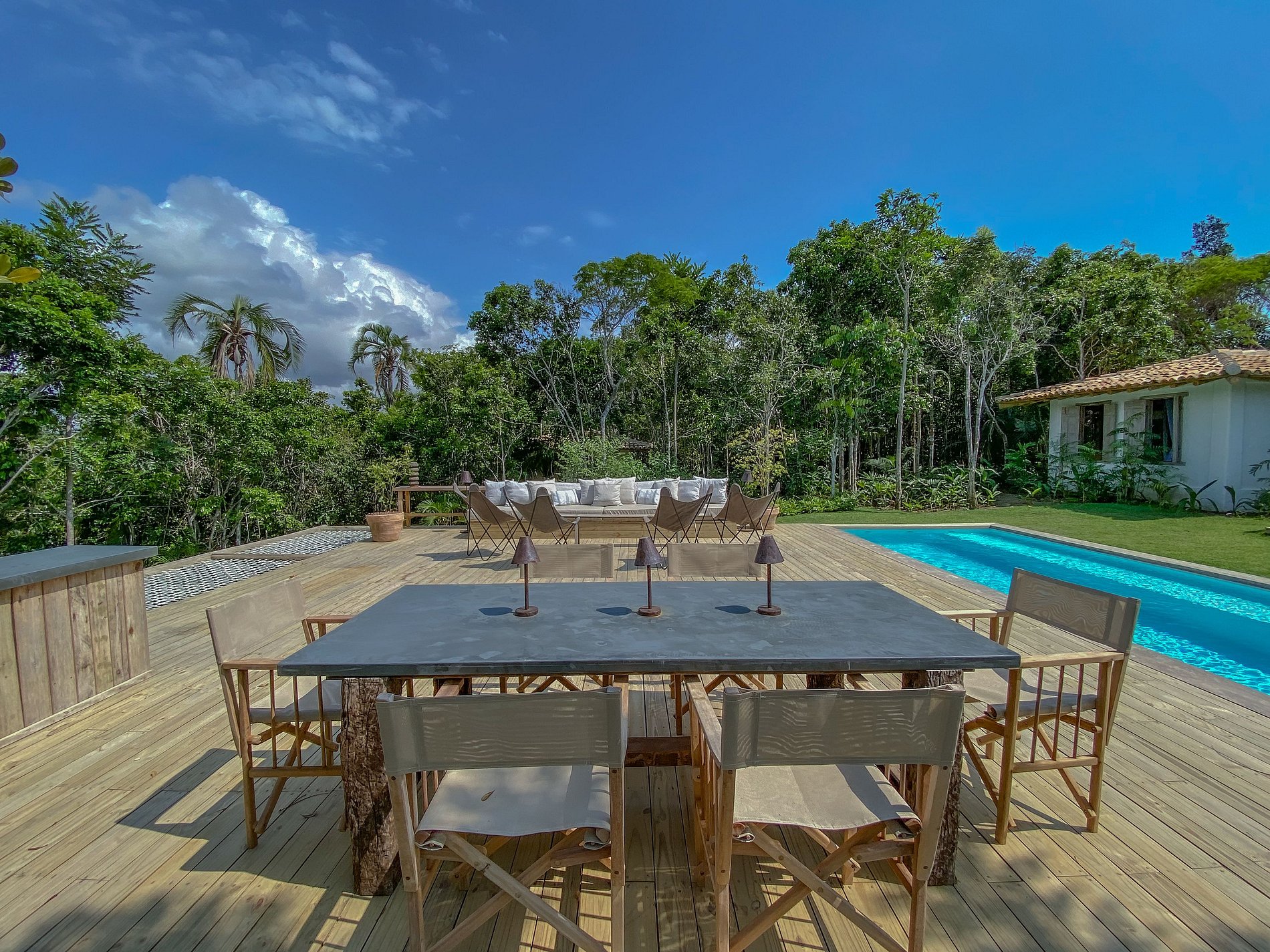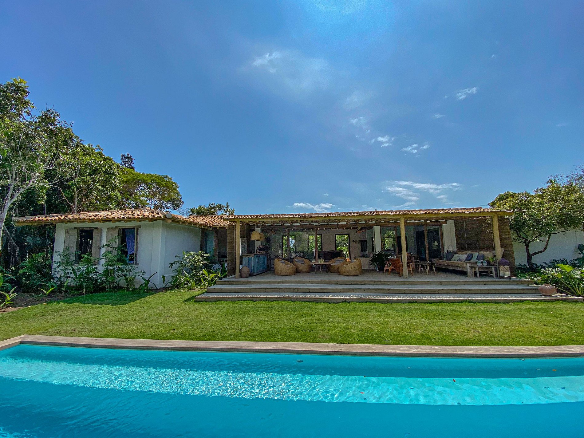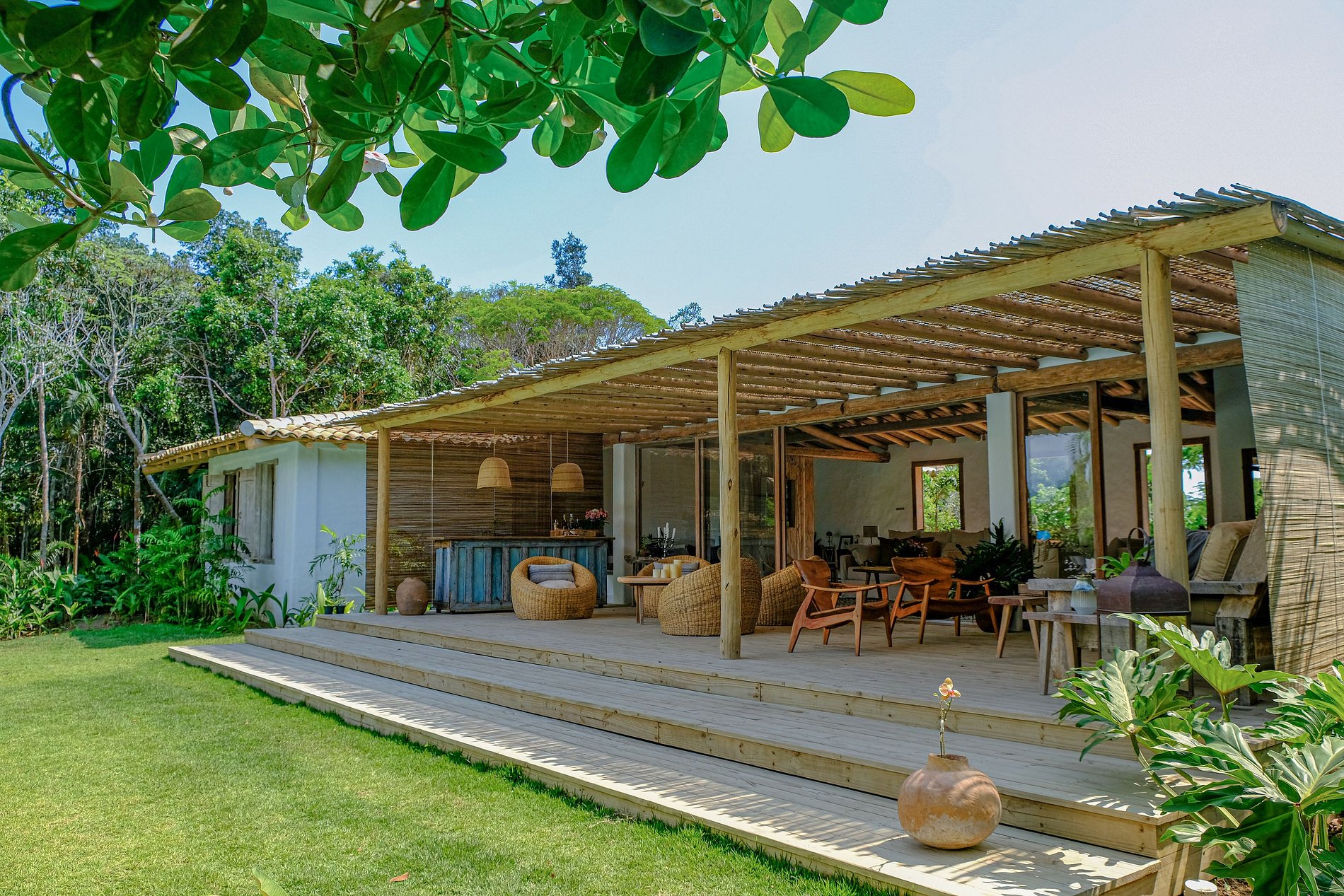 Ampio soggiorno integrato con la sala da pranzo, sala TV semi-privata e cucina americana, con ampio spazio aperto, completamente integrato all’area relax. Barbecue, piscina, divani esterni, amache sospese sulla foresta e un tavolo per cenare sotto le stelle, il tutto circondato da un magnifico deck e immerso in un lussureggiante giardino tropicale. Il lounge esterno offre diverse opzioni e ambienti da godere sia di giorno che di notte.