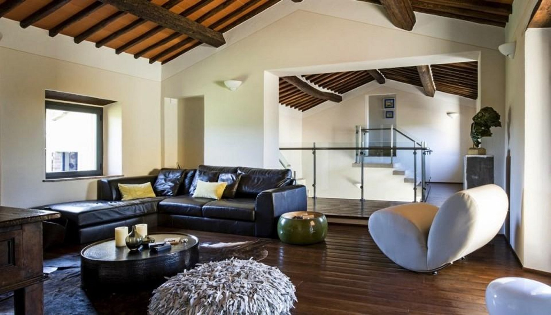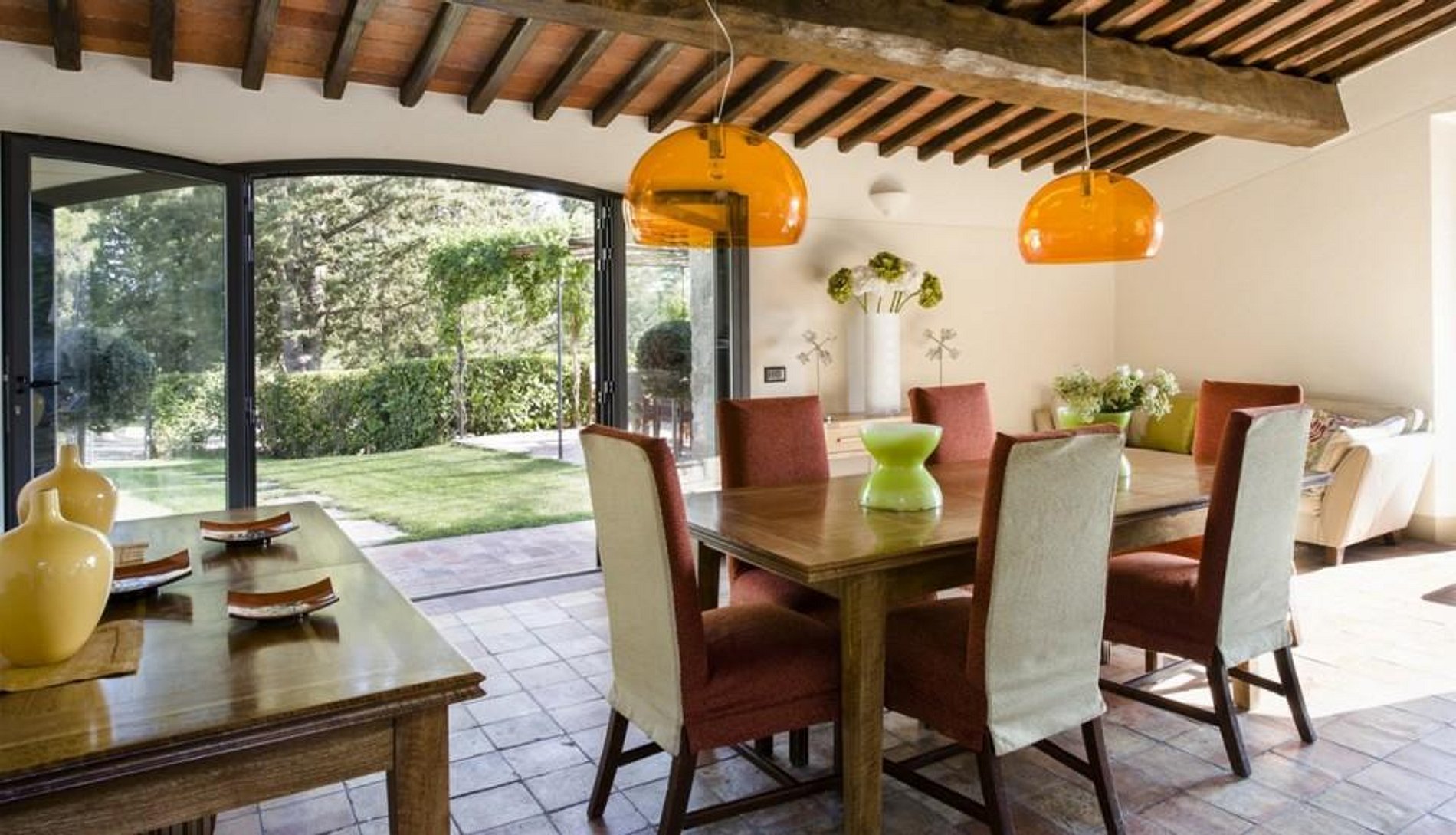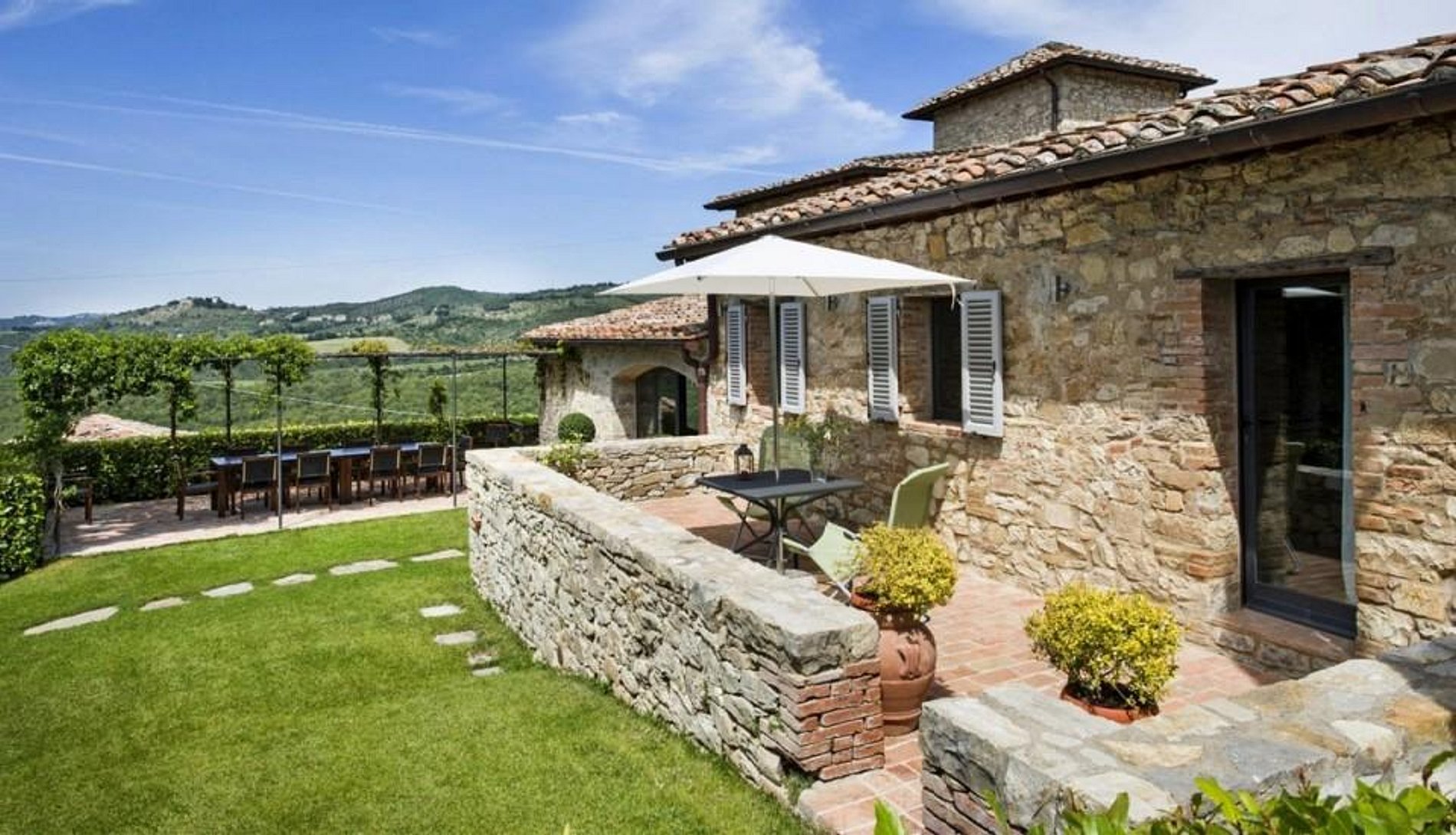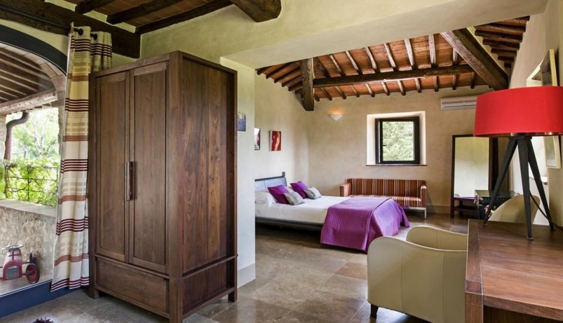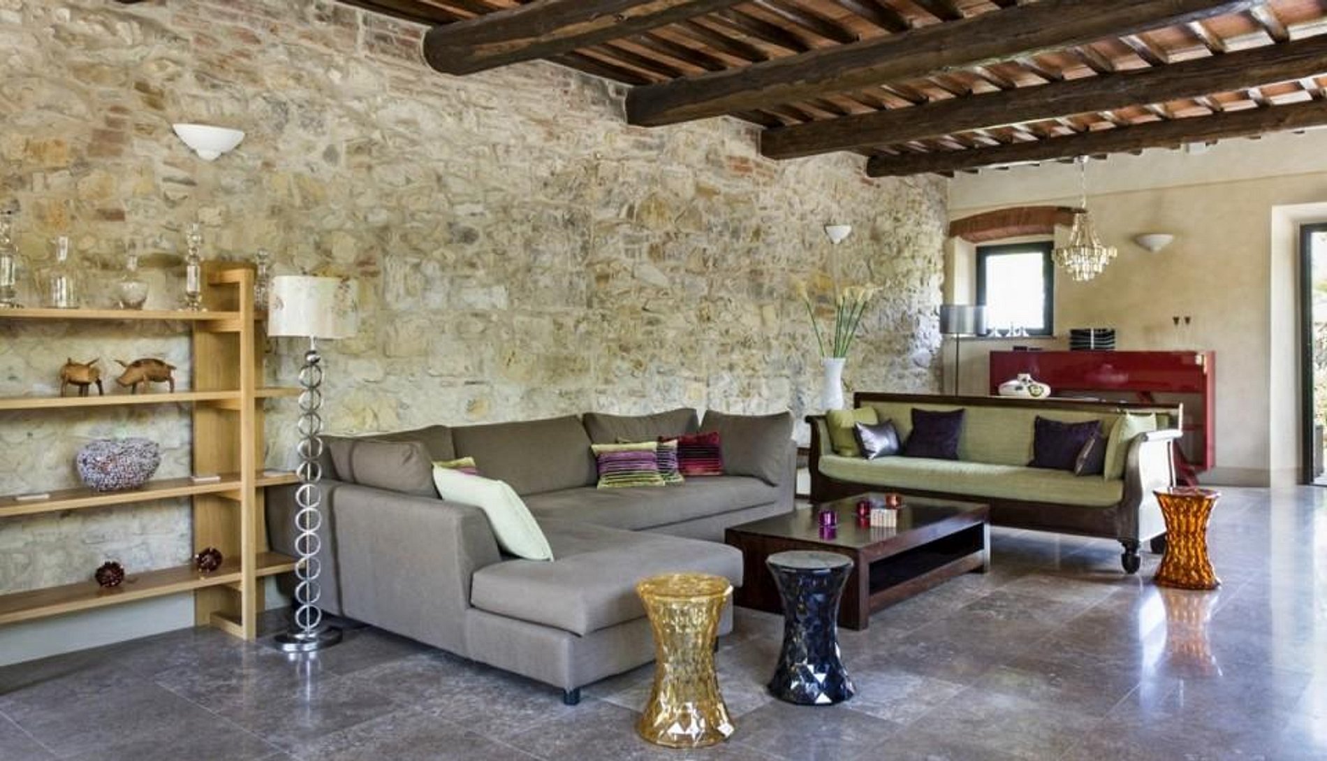 A fazenda de quatrocentos anos de idade apresenta tradicionais paredes grossas da Toscana, telhados de azulejos, lareiras maciças, tetos com vigas expostas e pedra. Adoravelmente restaurada, a casa agrega o melhor do estilo italiano, decoração contemporânea e conveniências modernas.