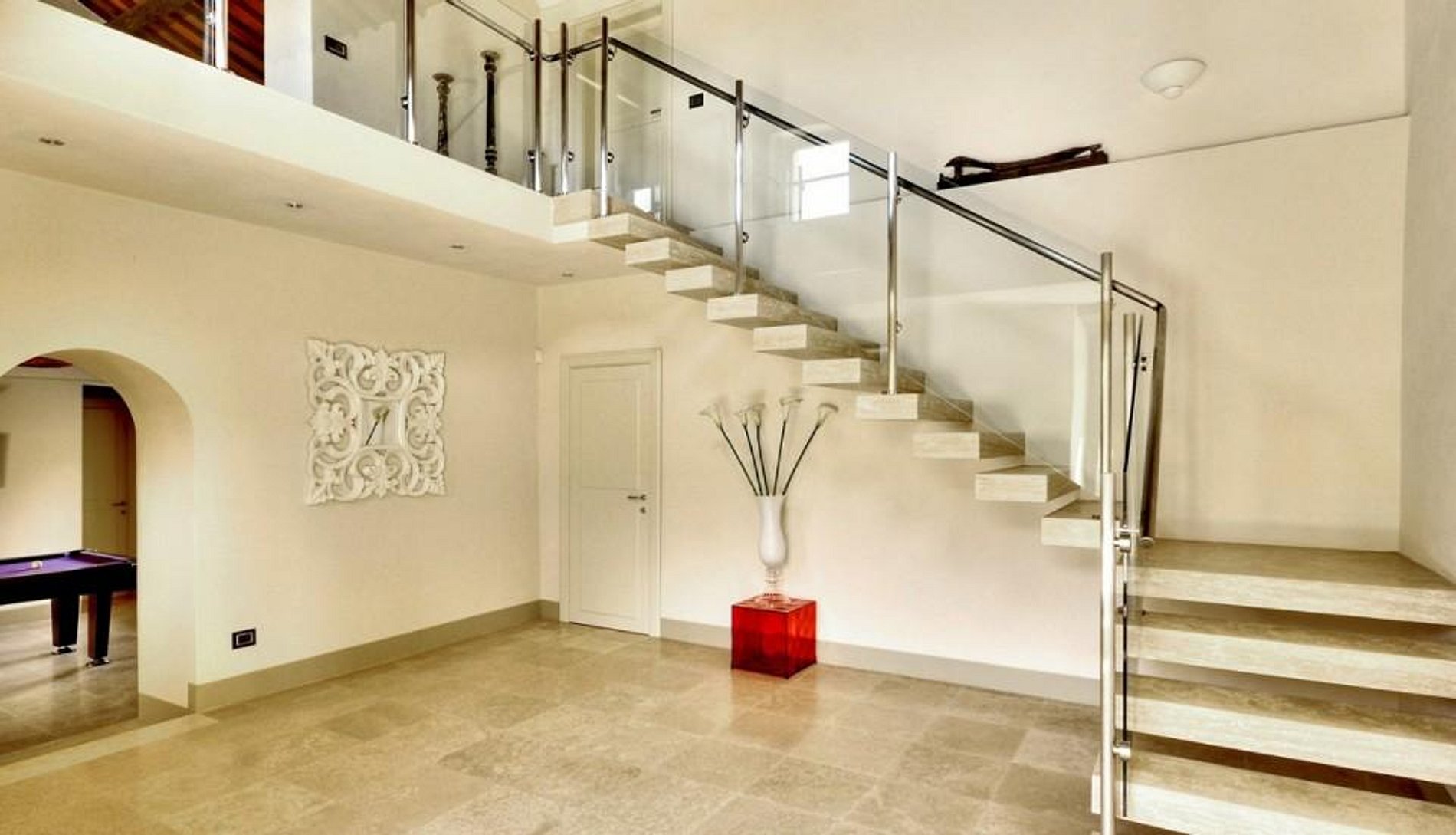 Quatro das cinco suítes de quarto de hotel possuem camas de casal e o quinto, duas camas de solteiro. Cada quarto possui um banheiro de alta tecnologia. Há também uma mini academia e uma sala de jogos. A casa tem uma tampa de segurança remota para a piscina e brinquedos, livros, filmes e jogos para crianças.