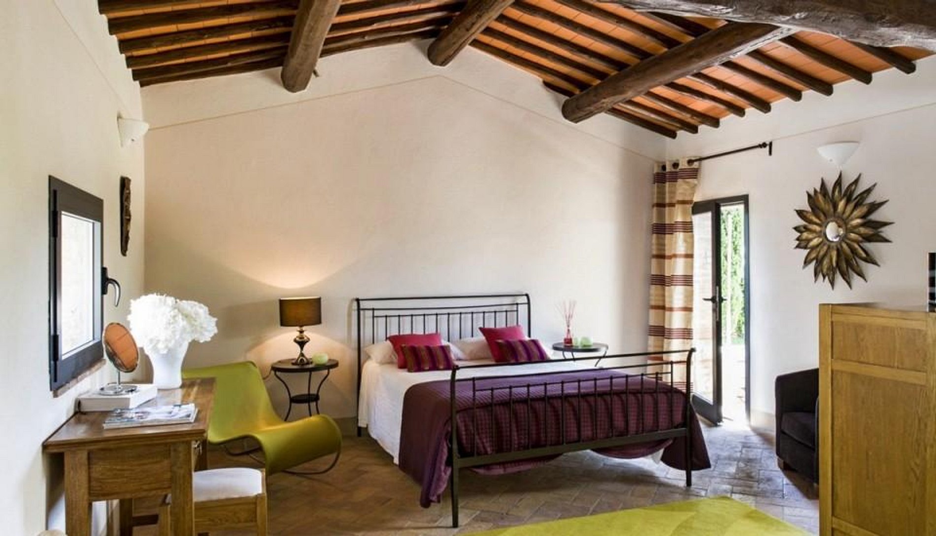 A fazenda de quatrocentos anos de idade apresenta tradicionais paredes grossas da Toscana, telhados de azulejos, lareiras maciças, tetos com vigas expostas e pedra. Adoravelmente restaurada, a casa agrega o melhor do estilo italiano, decoração contemporânea e conveniências modernas.
