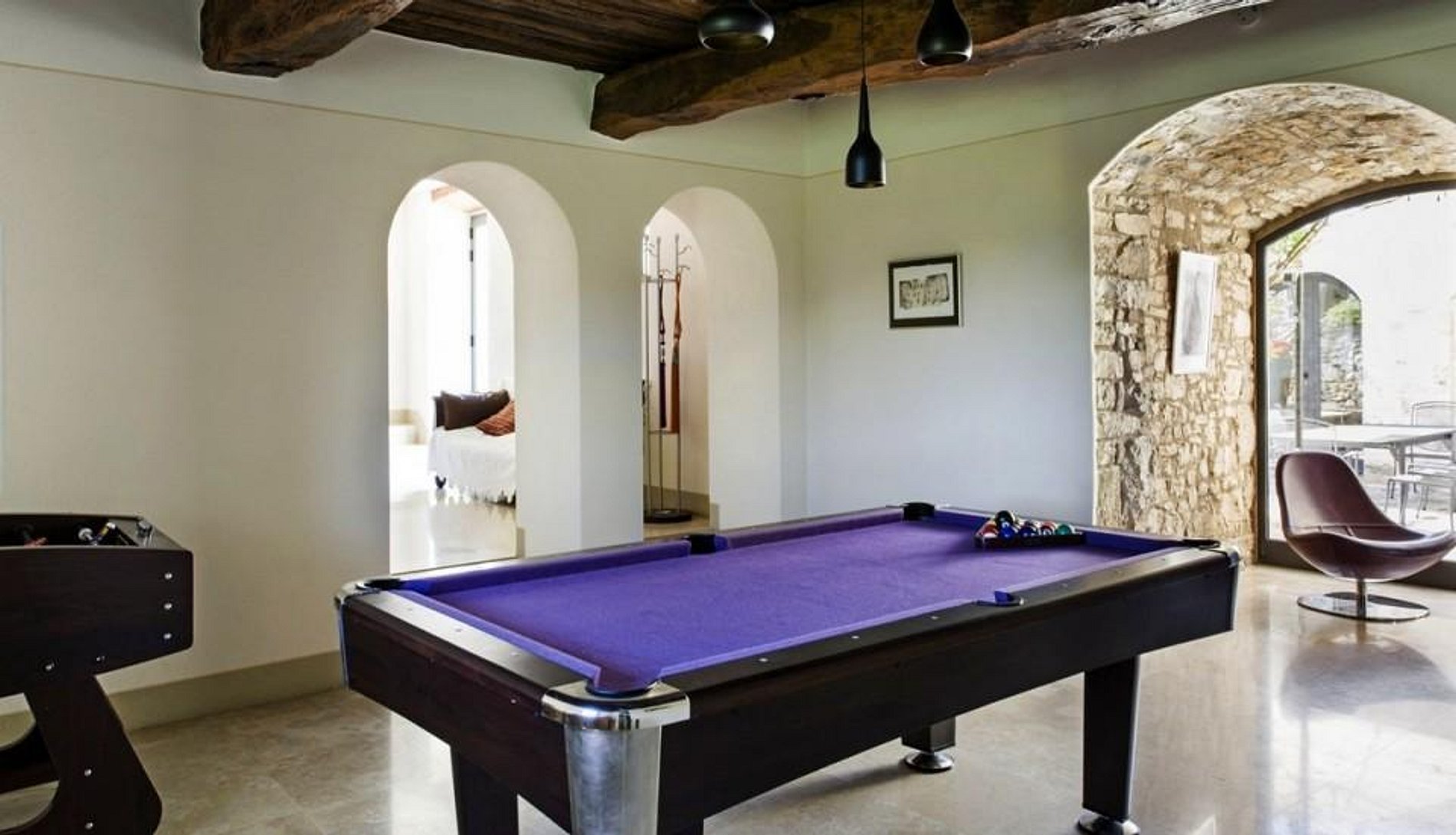 Quatro das cinco suítes de quarto de hotel possuem camas de casal e o quinto, duas camas de solteiro. Cada quarto possui um banheiro de alta tecnologia. Há também uma mini academia e uma sala de jogos. A casa tem uma tampa de segurança remota para a piscina e brinquedos, livros, filmes e jogos para crianças.
